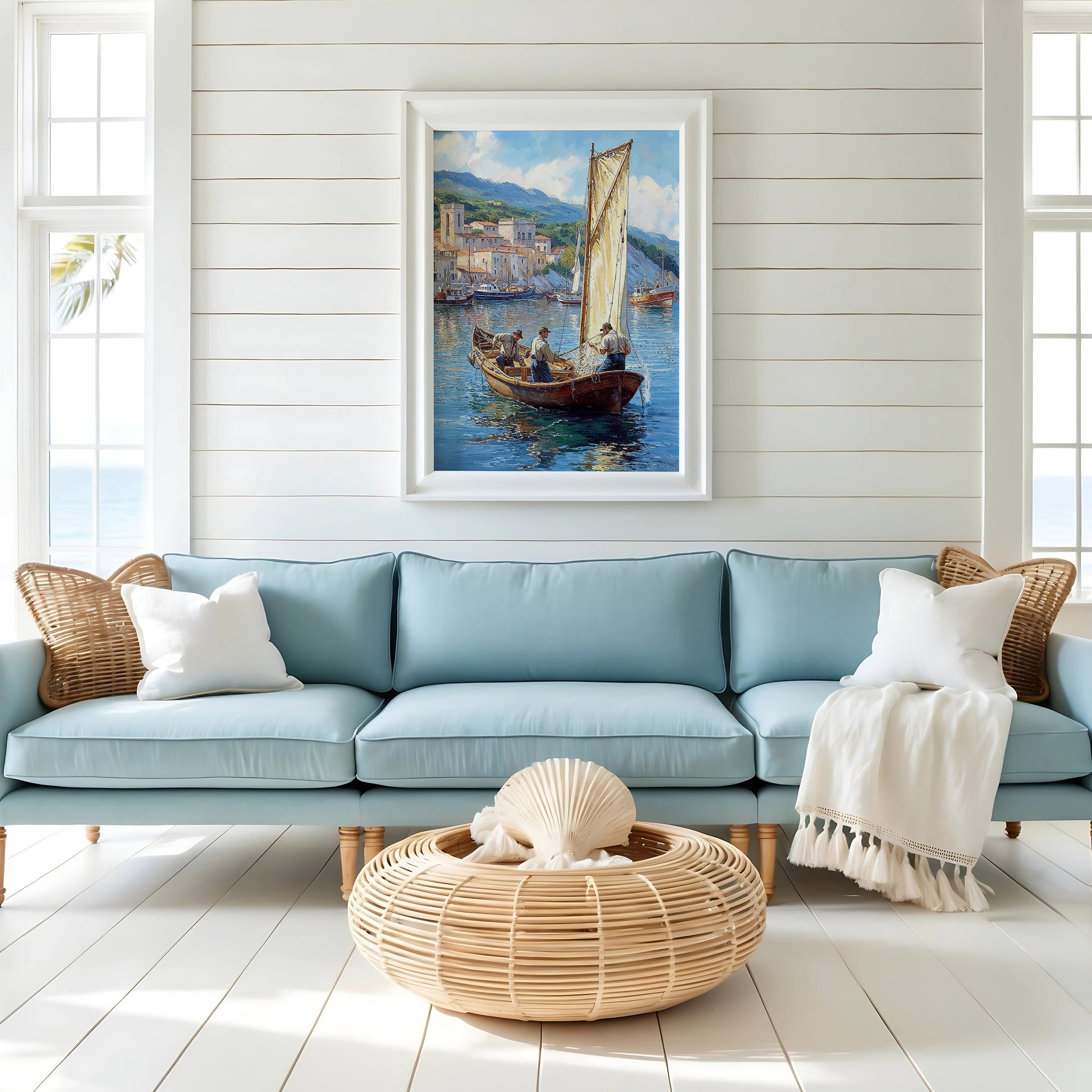 Fishermen unfolds in kinetic stillness—three fishermen bound in the ritual of harvest, their wooden boat etched against a harbor of sunlit stucco and distant hills. The taut net, the lean of weathered hands, and the curve of the sail catch more than light—they catch a legacy.