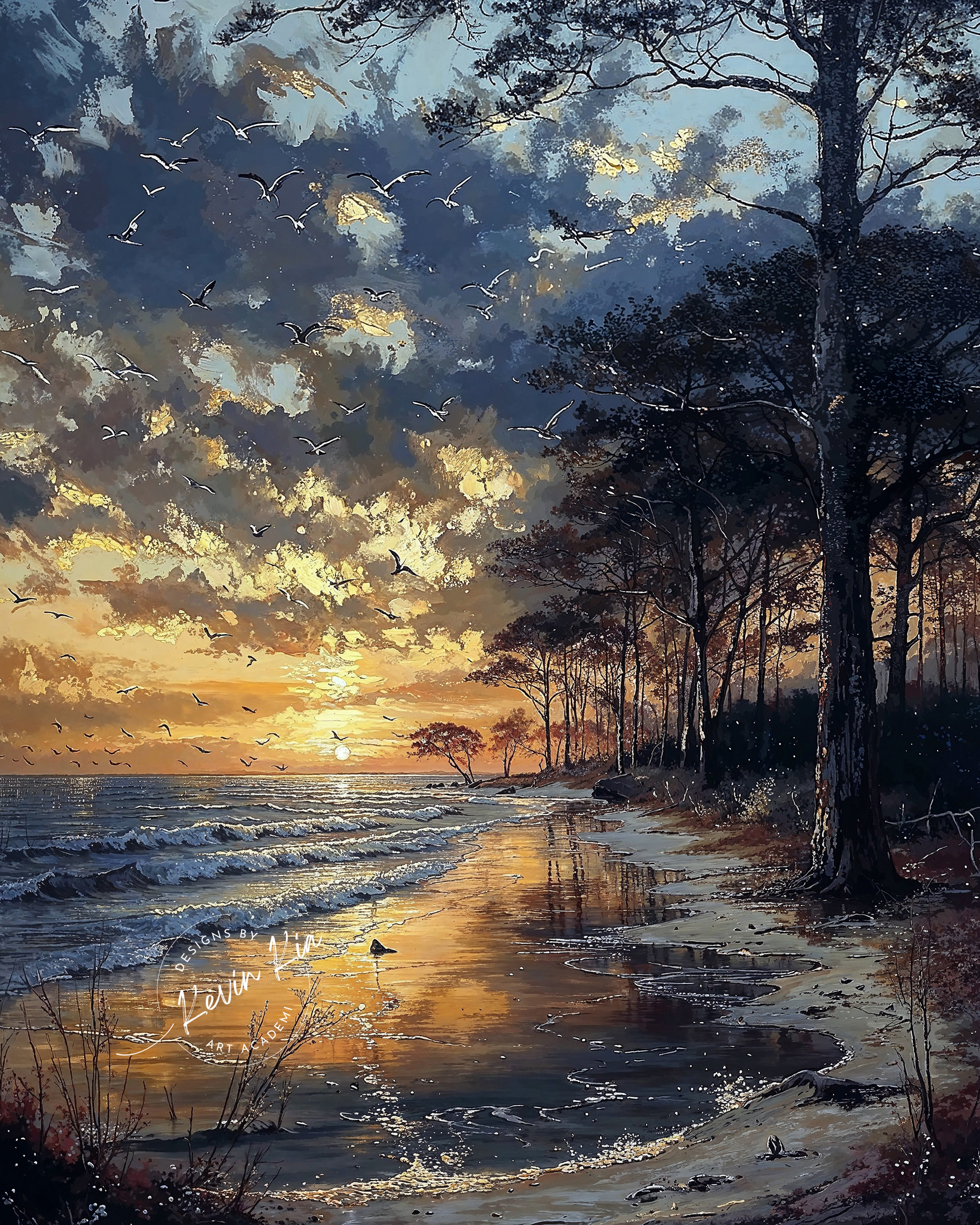Flight of Sunset begins where flame meets shadow—waves rhythmically glint beneath a sky alive with motion, while a hush settles along the wooded shore. Birds rise in sweeping arcs through burnished light, their silhouettes etched against clouds still glowing from the day’s last breath.