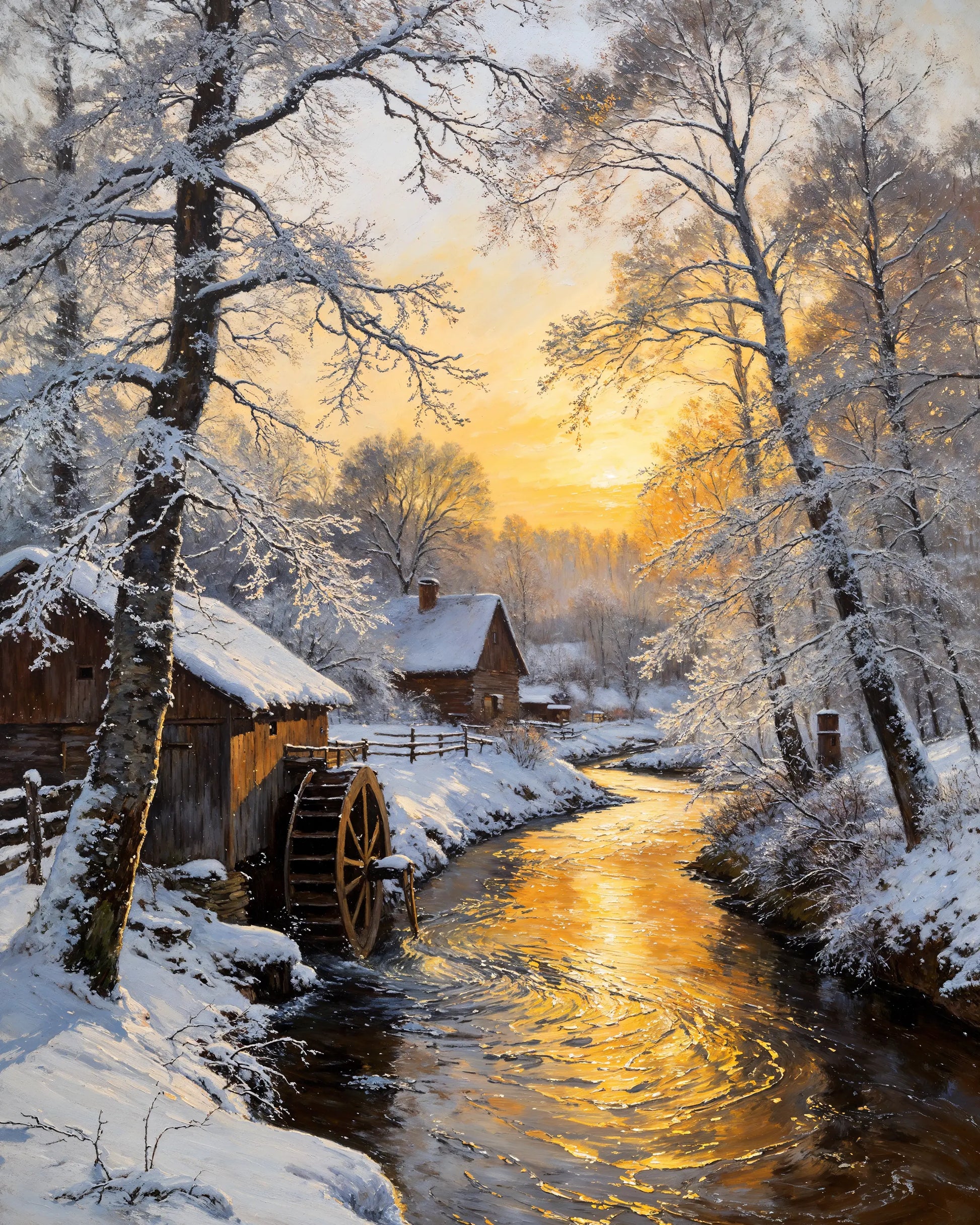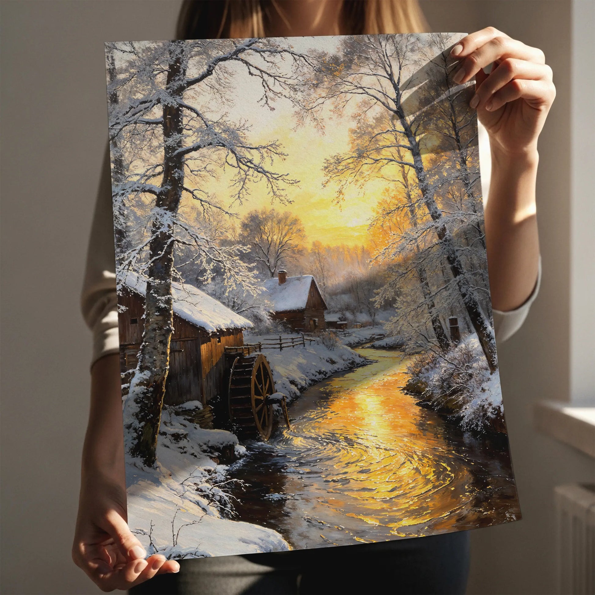 Flow captures the timeless rhythm of nature — a golden stream winding through a snow-covered village beneath the soft light of a winter sunrise.