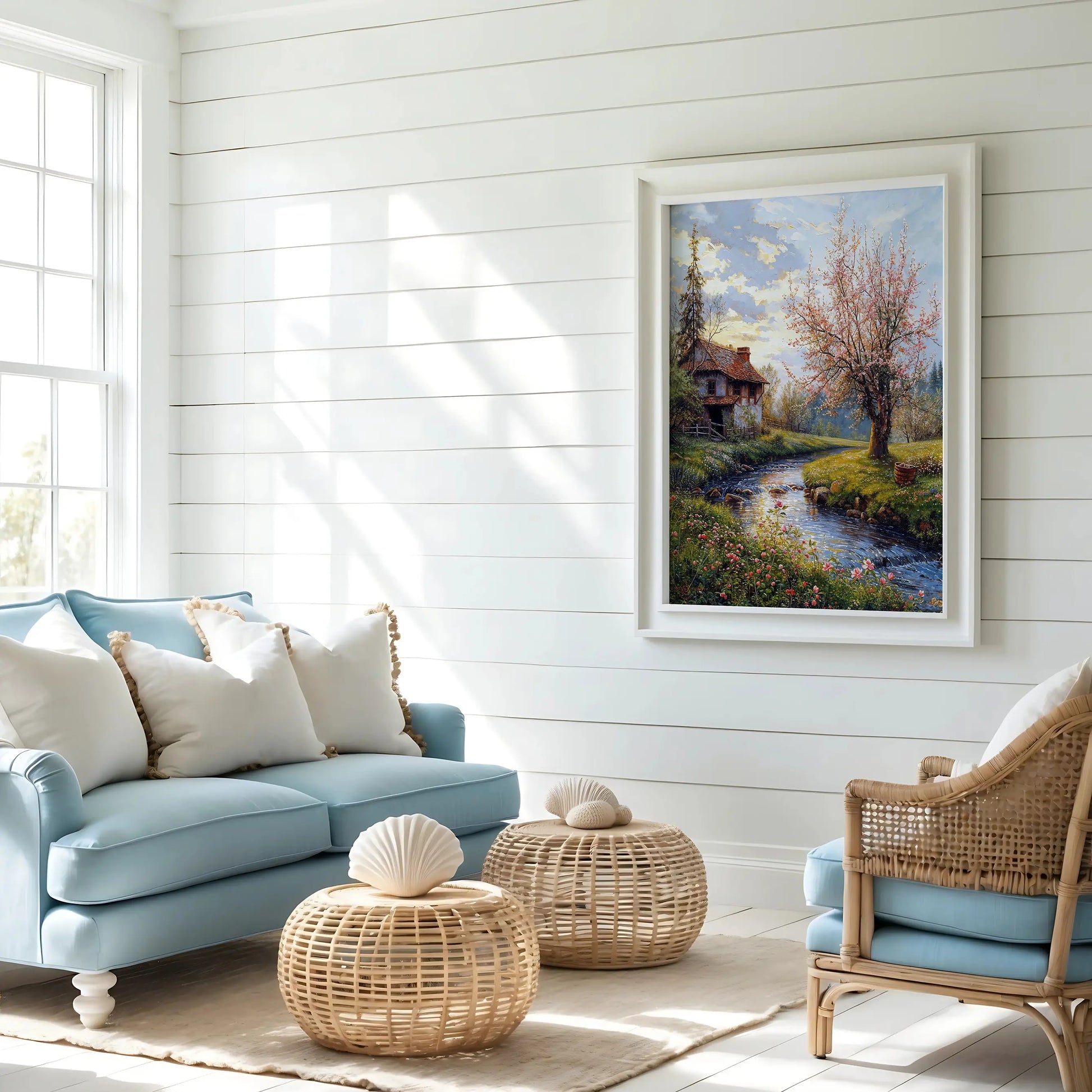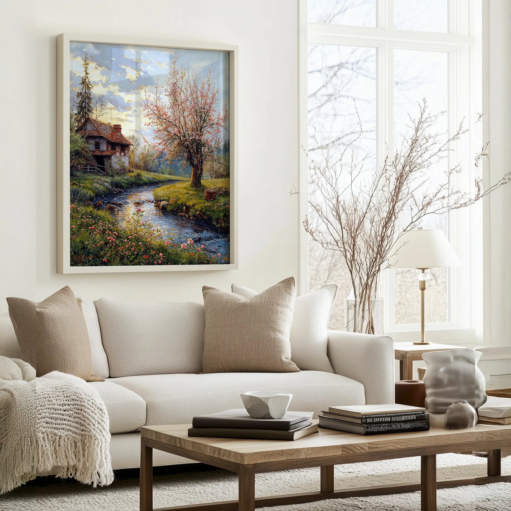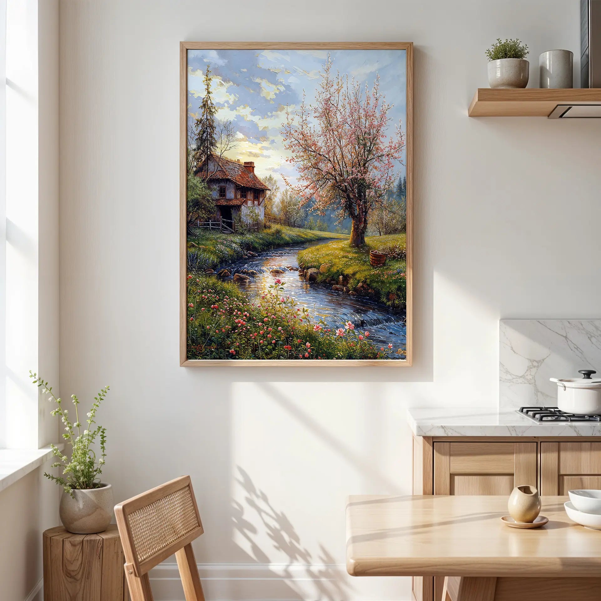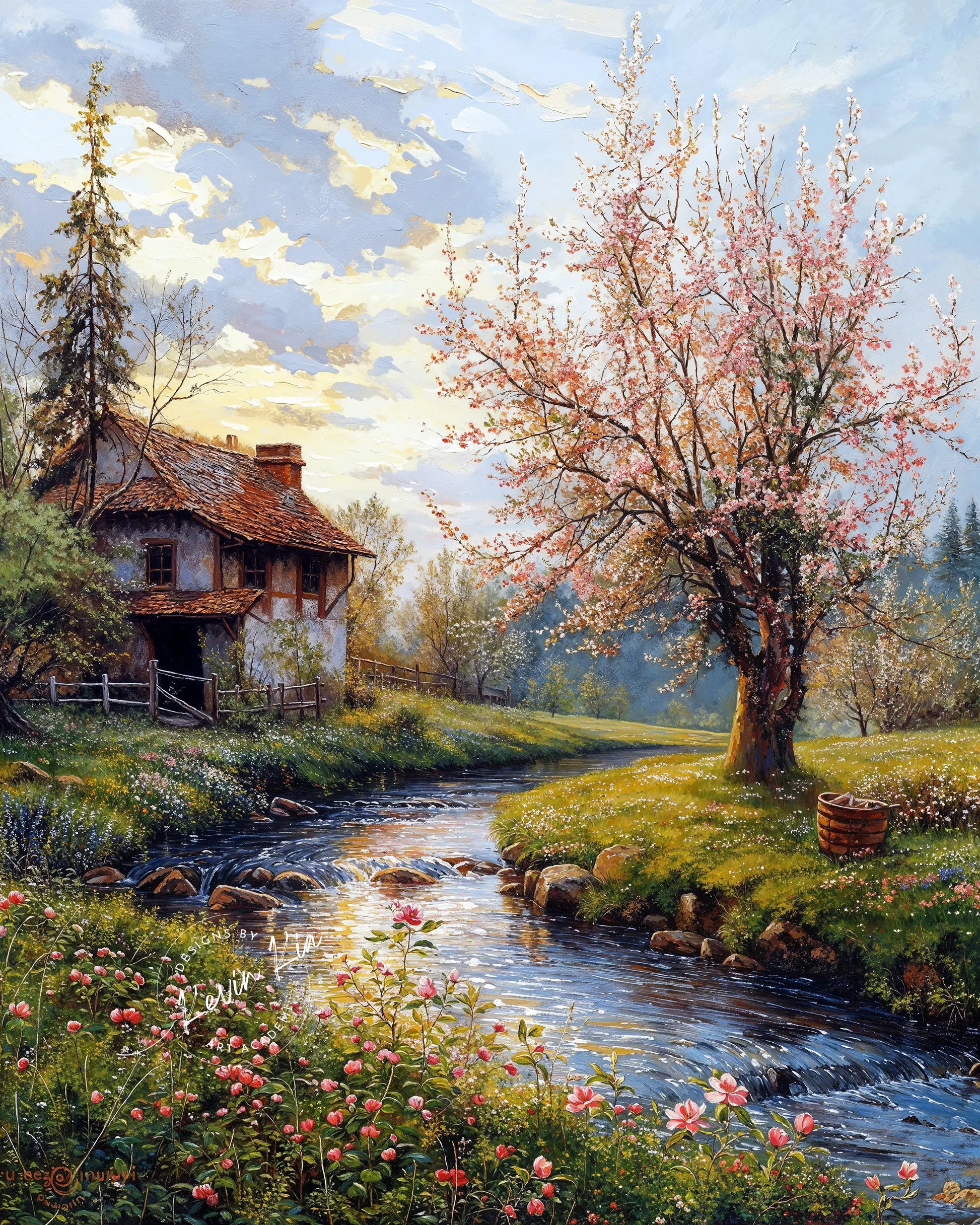 Freedom opens in tender hush, where light touches every surface like a secret kept in spring’s breath. A stone cottage stands quietly among meadows, its faded roof cradled by early blossoms and the soft descent of evening. The brook winds like a lyrical line through the foreground, its mirrored flow echoing the pale pinks and creams of nearby petals.