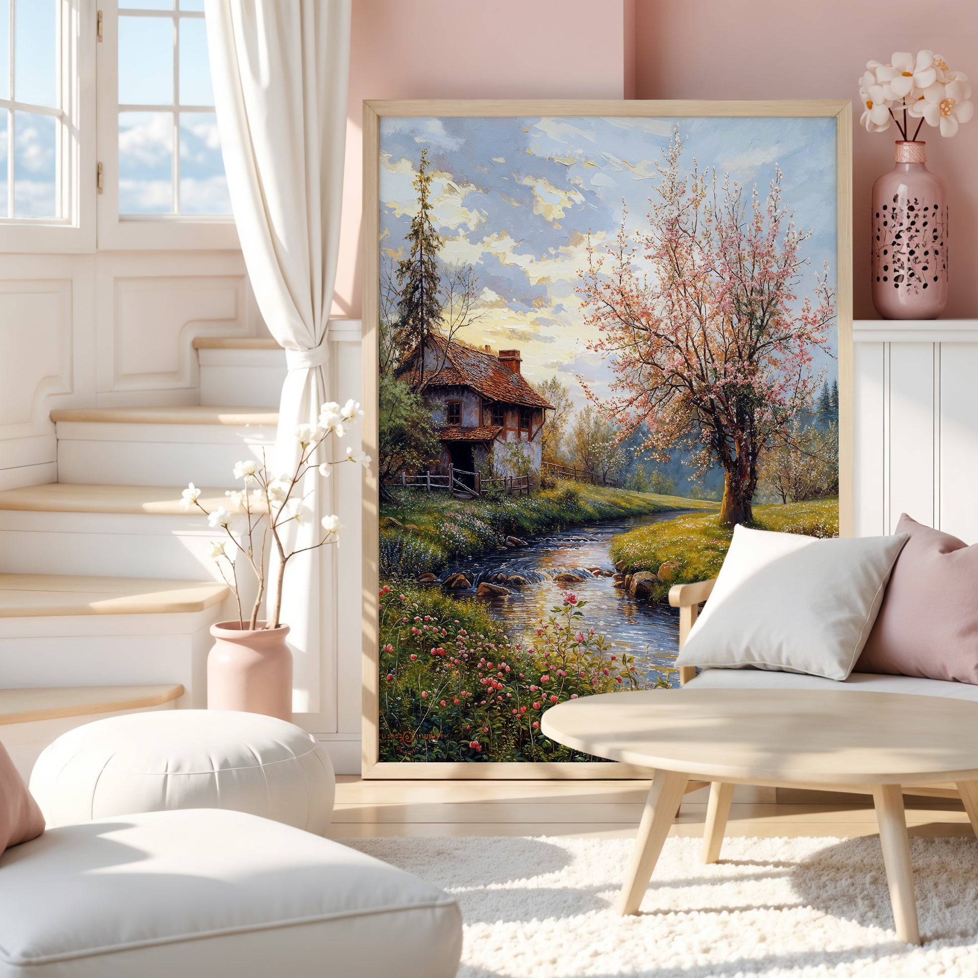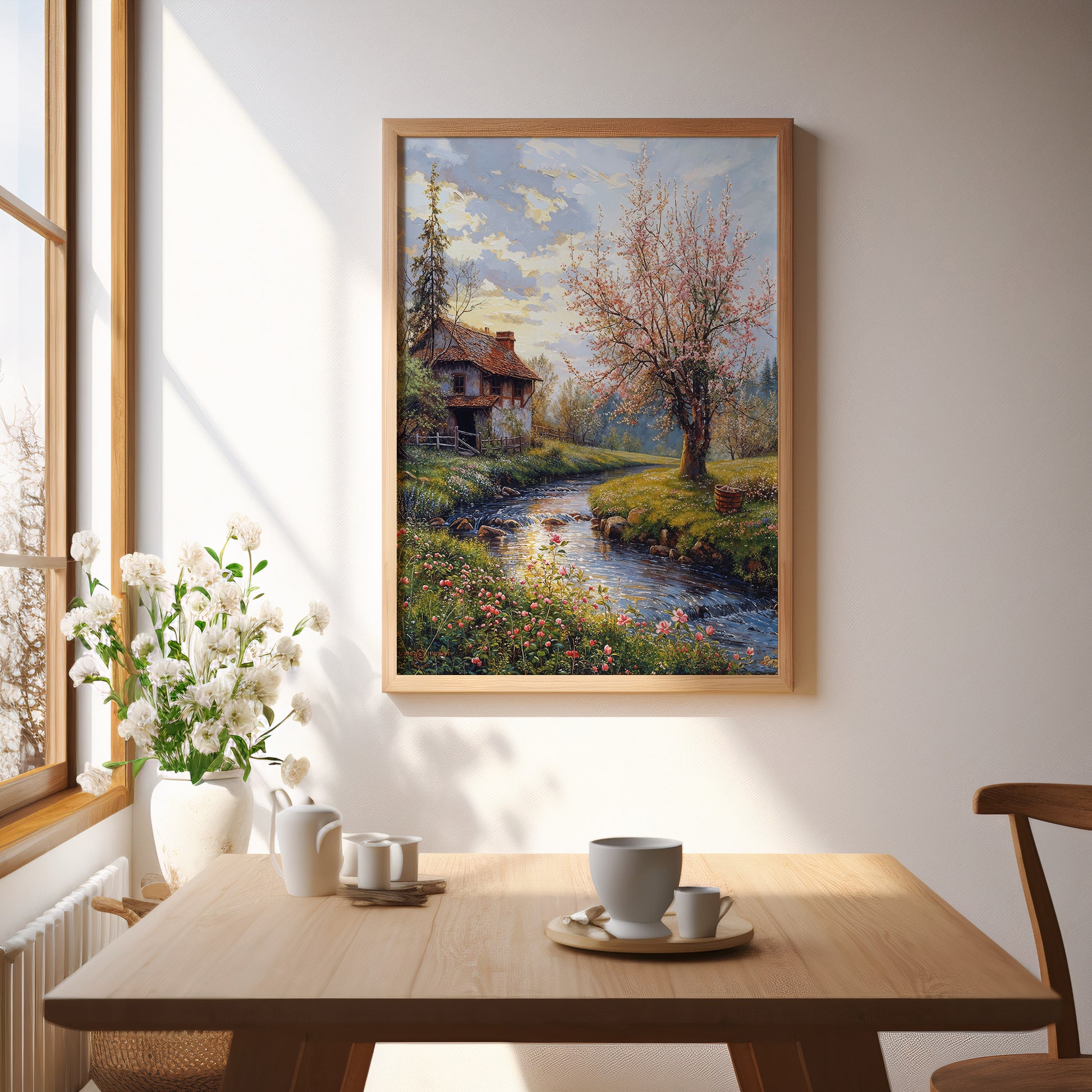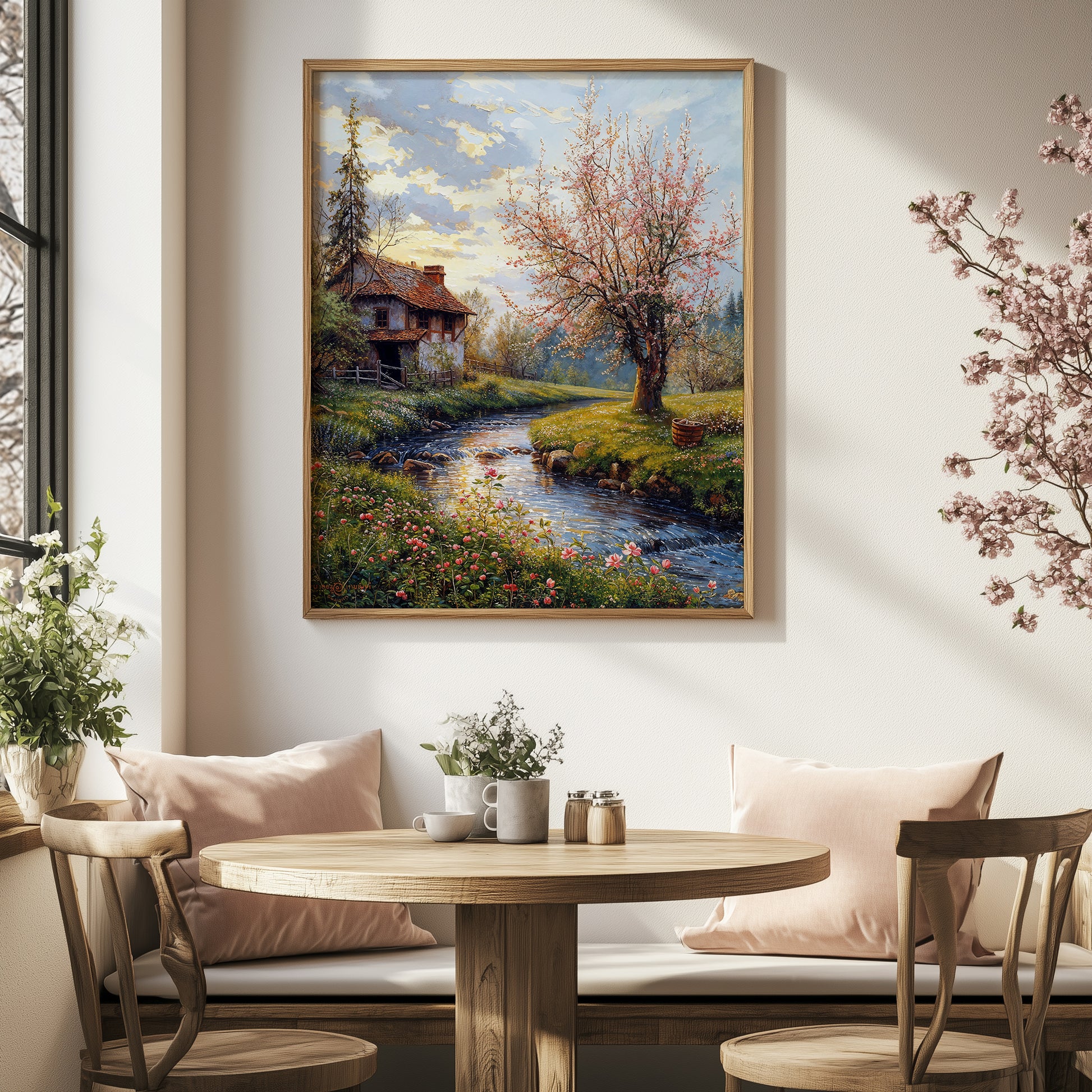 Freedom opens in tender hush, where light touches every surface like a secret kept in spring’s breath. A stone cottage stands quietly among meadows, its faded roof cradled by early blossoms and the soft descent of evening. The brook winds like a lyrical line through the foreground, its mirrored flow echoing the pale pinks and creams of nearby petals.
