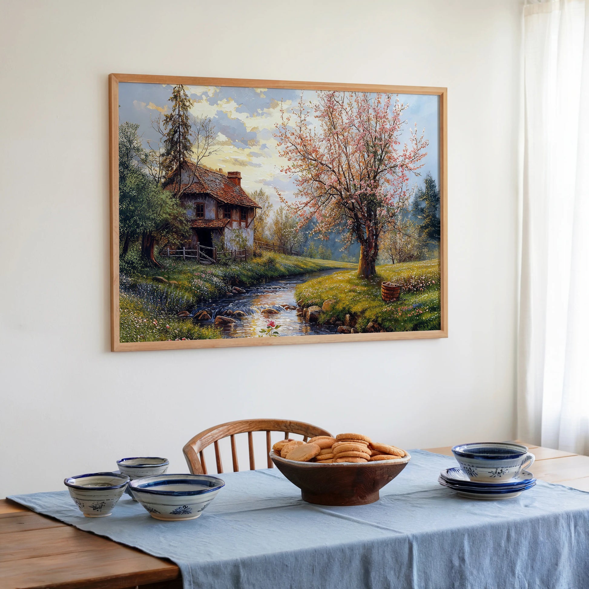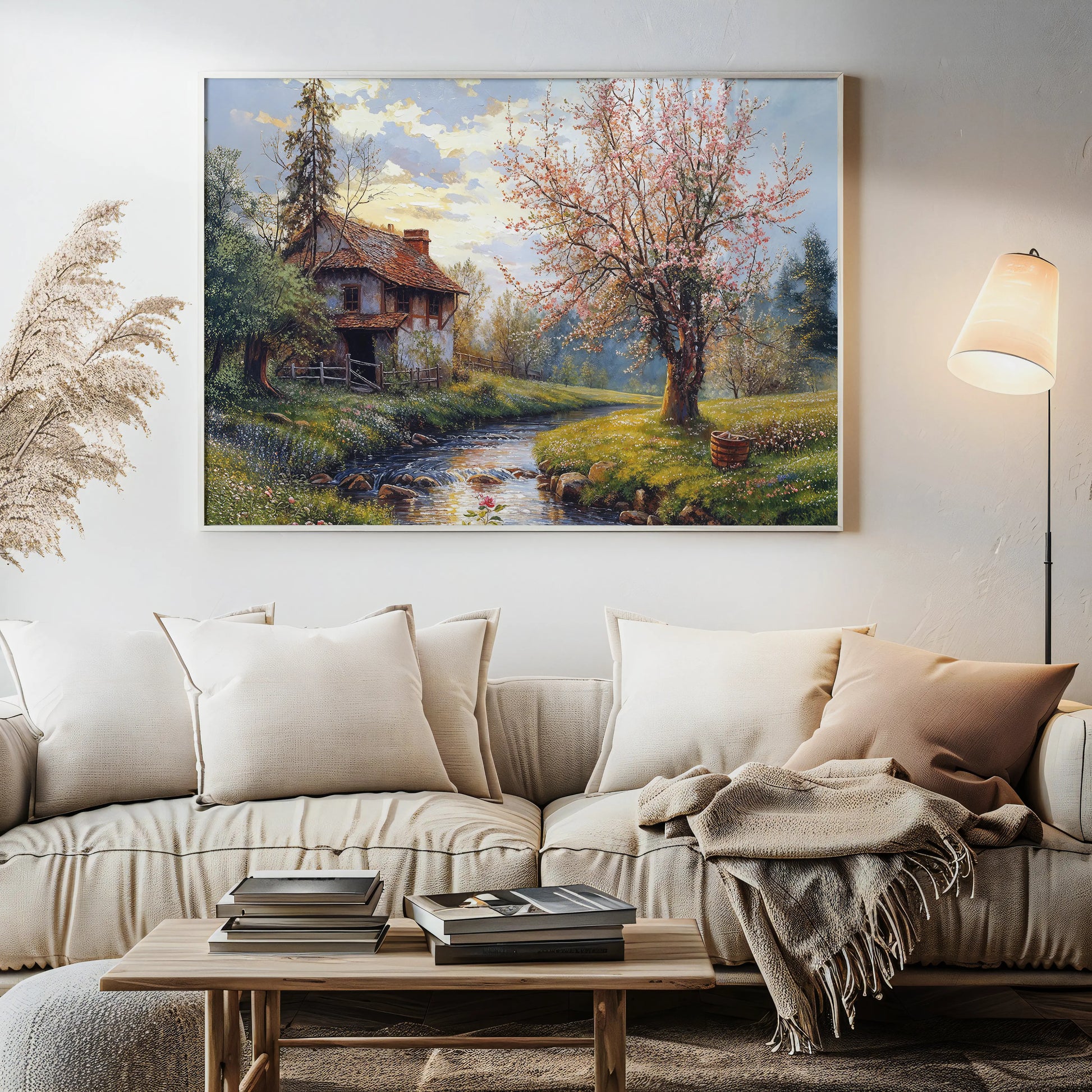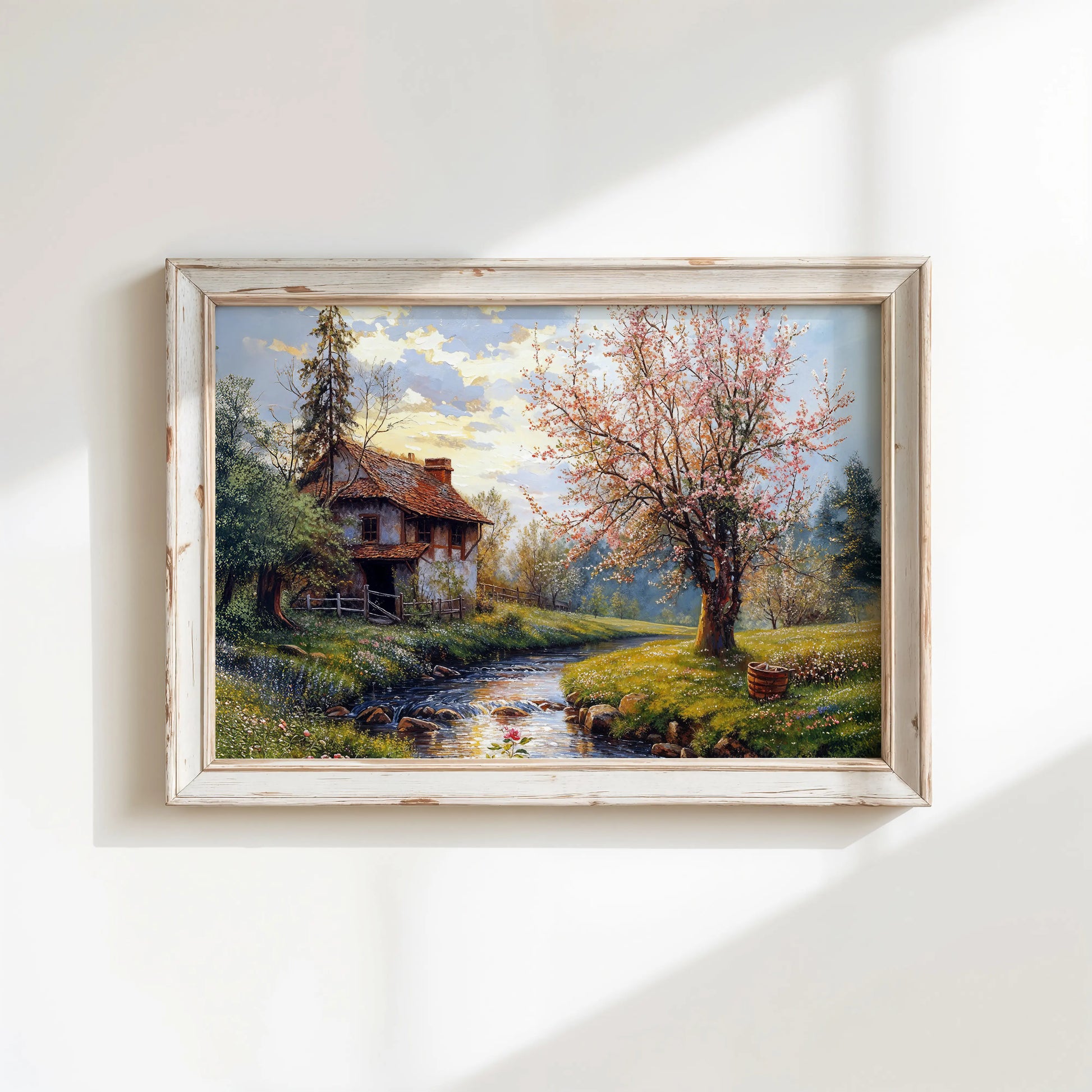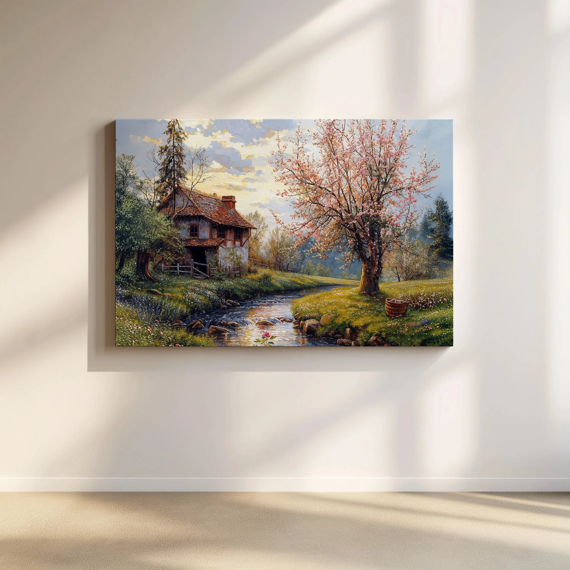 Freedom brings the serenity of rural spring to life with a charming scene: a blossoming pink tree glowing in the evening light, beside a quiet stream and a weathered cottage. The tranquil flow of water and golden tones of the sky evoke a sense of timeless beauty and warmth.