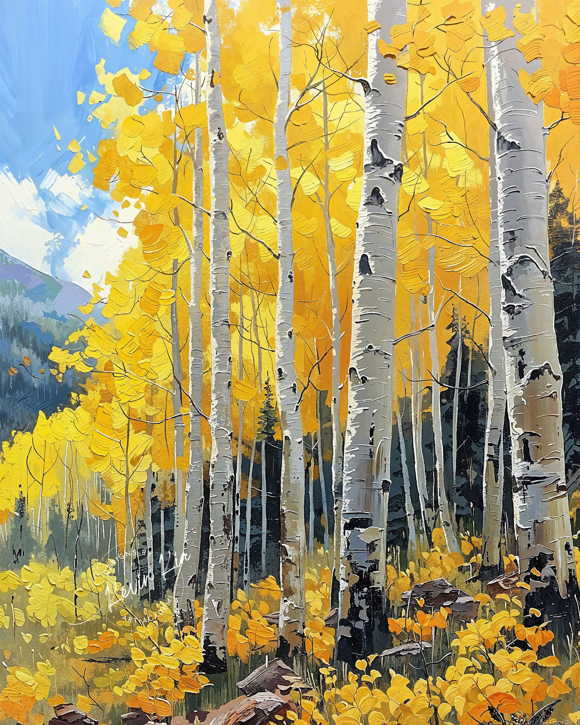 Golden Aspens stands in luminous stillness—a grove of aspens rising with quiet grace, their white trunks etched against a canopy of molten yellow. Leaves drift like light itself, layering the forest floor in amber and ochre, where silence becomes form.