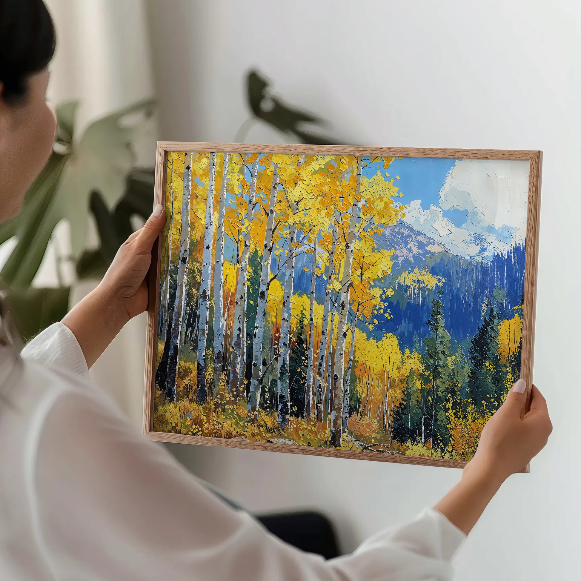 Golden Aspens II celebrates the radiant beauty of fall with a grove of golden aspen trees glowing beneath a bright blue sky. Towering trunks stretch skyward while a symphony of yellow leaves fills the air with warmth and energy.