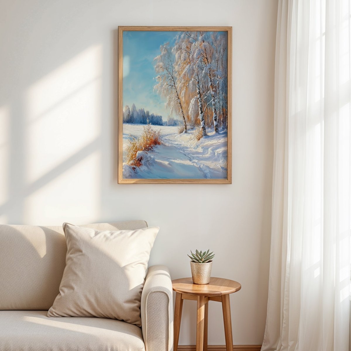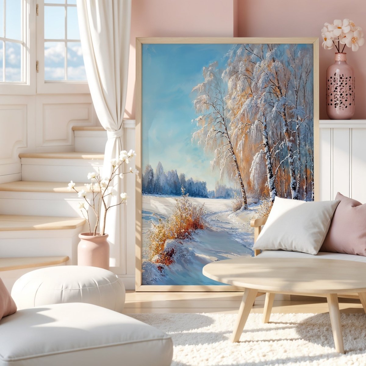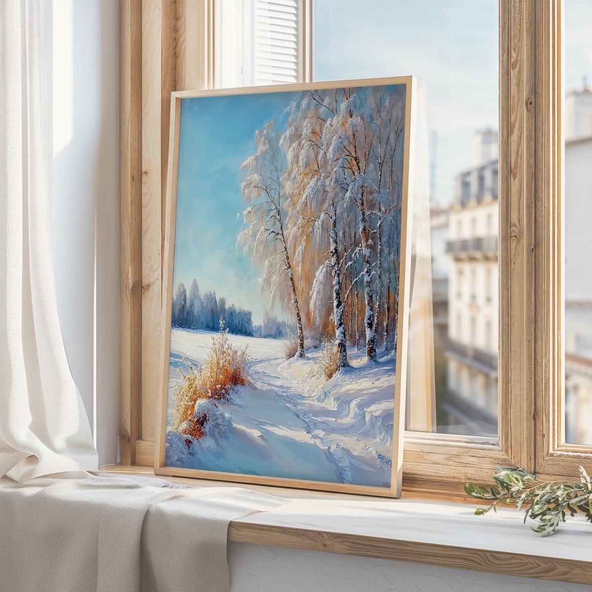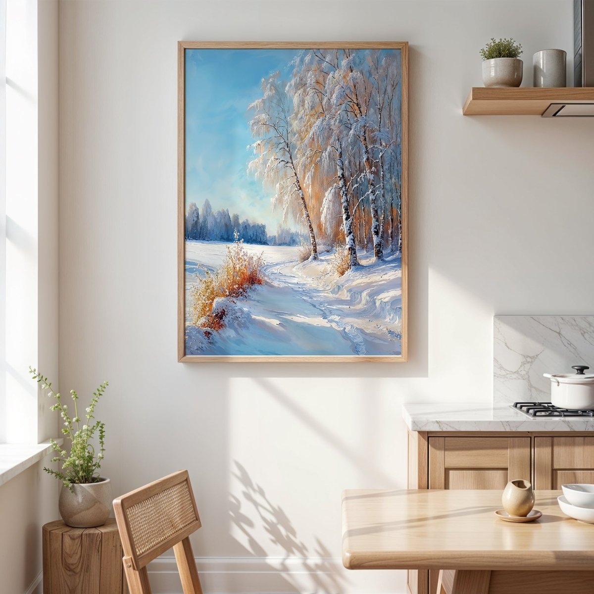 Frozen captures the reverent stillness of a snow-covered trail at first light. Tall birch trunks stretch vertically across the canvas, their bark rendered with delicate dry-brush texture and layered tonal contrast that mimics scumbling techniques found in traditional oil-on-canvas work. Light diffuses softly through the trees, illuminating untouched snow in luminous golds and silvers — a chiaroscuro of morning frost and warmth.