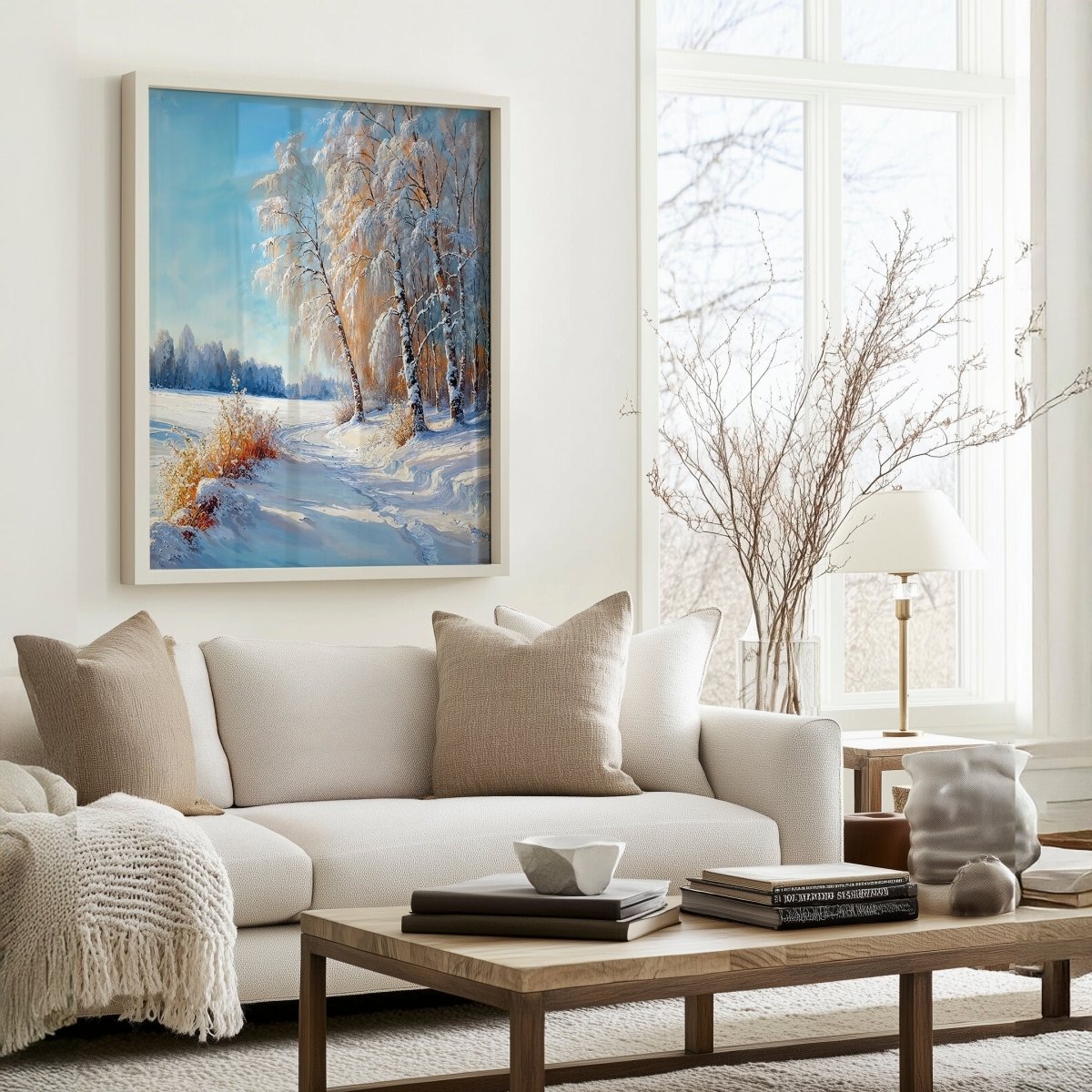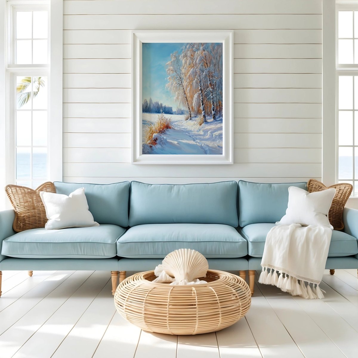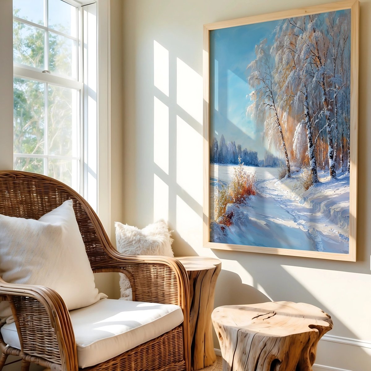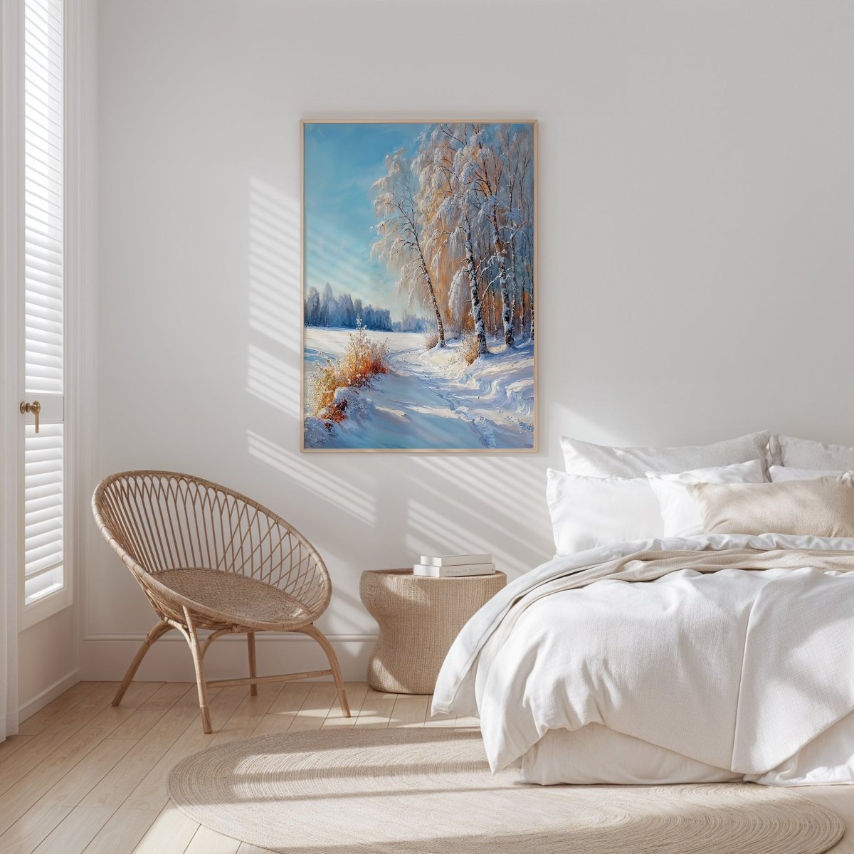 Frozen captures the reverent stillness of a snow-covered trail at first light. Tall birch trunks stretch vertically across the canvas, their bark rendered with delicate dry-brush texture and layered tonal contrast that mimics scumbling techniques found in traditional oil-on-canvas work. Light diffuses softly through the trees, illuminating untouched snow in luminous golds and silvers — a chiaroscuro of morning frost and warmth.