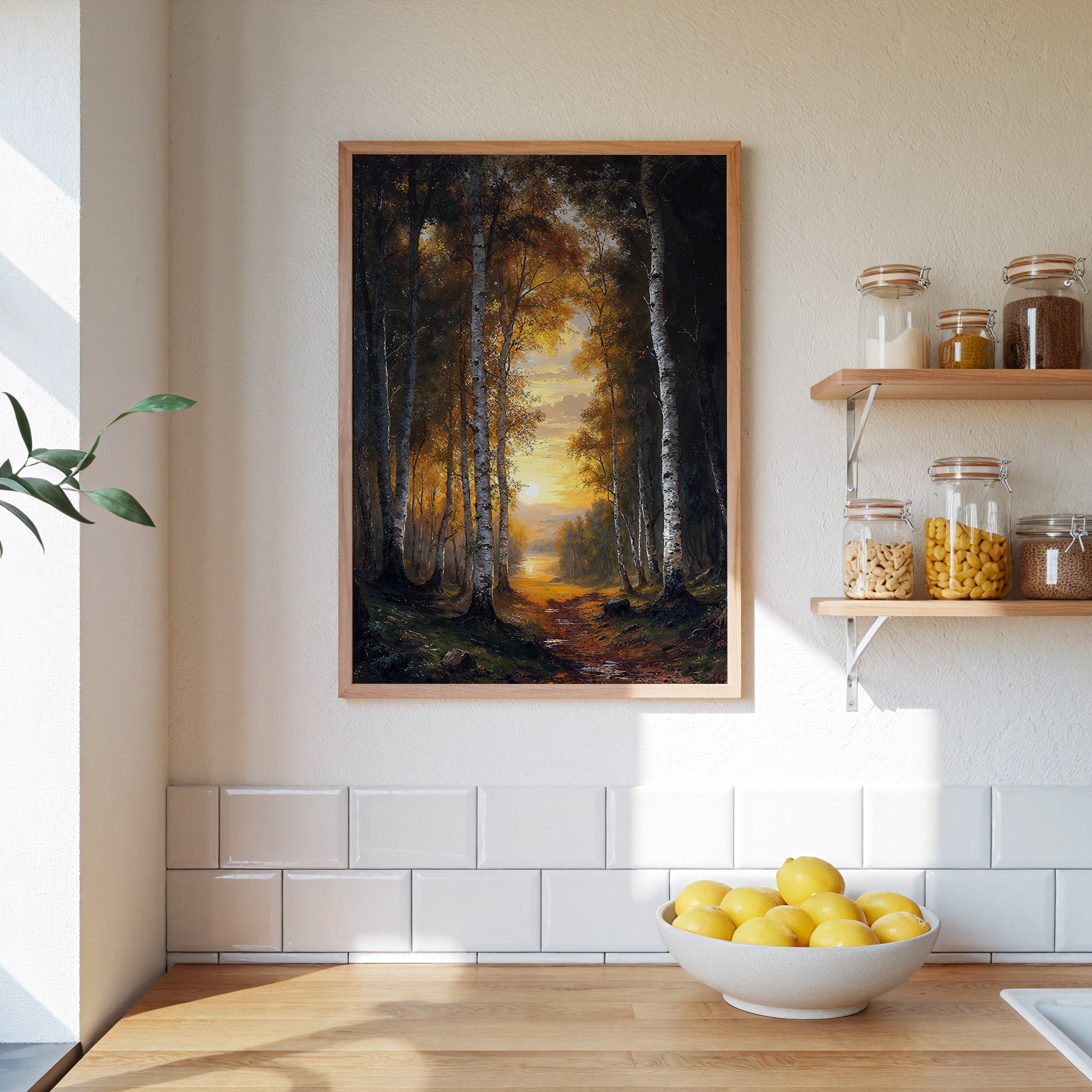 Golden Forest gathers where twilight breathes through tall birch and stillness pools between trees. A narrow path leads the eye beyond the frame, toward fading hills and the soft hush of dusk. Light pours low, catching bark and leaf in passing, creating a quiet rhythm between shadow and fire.