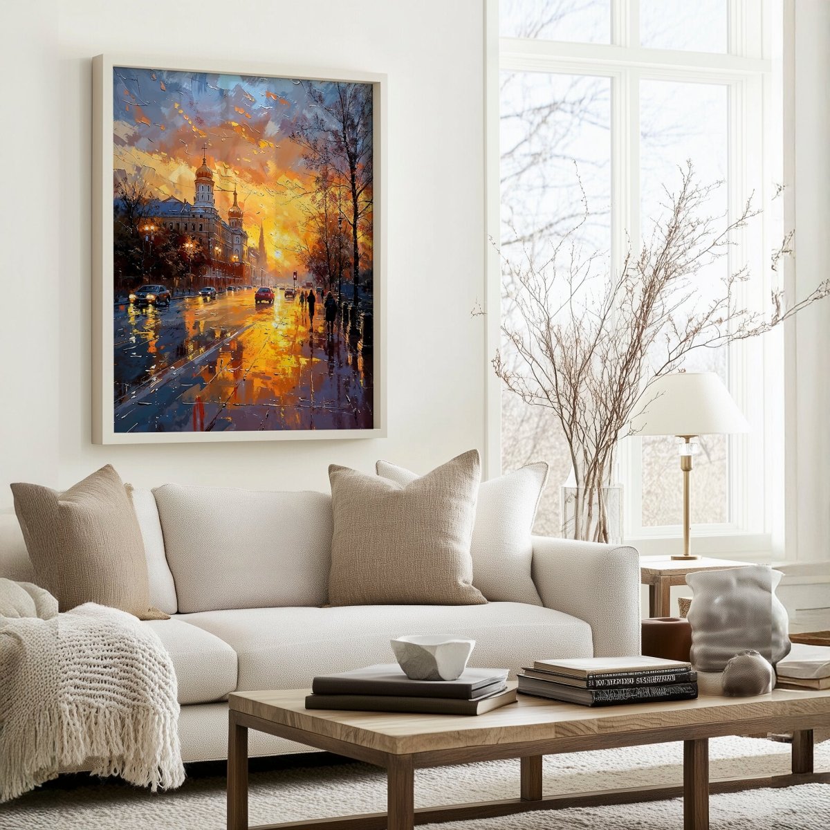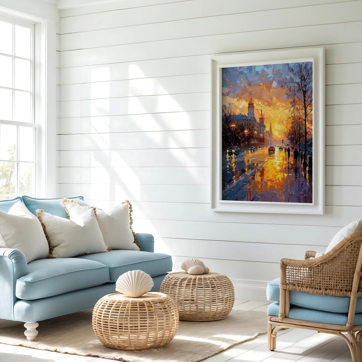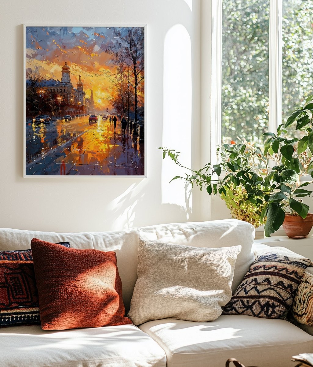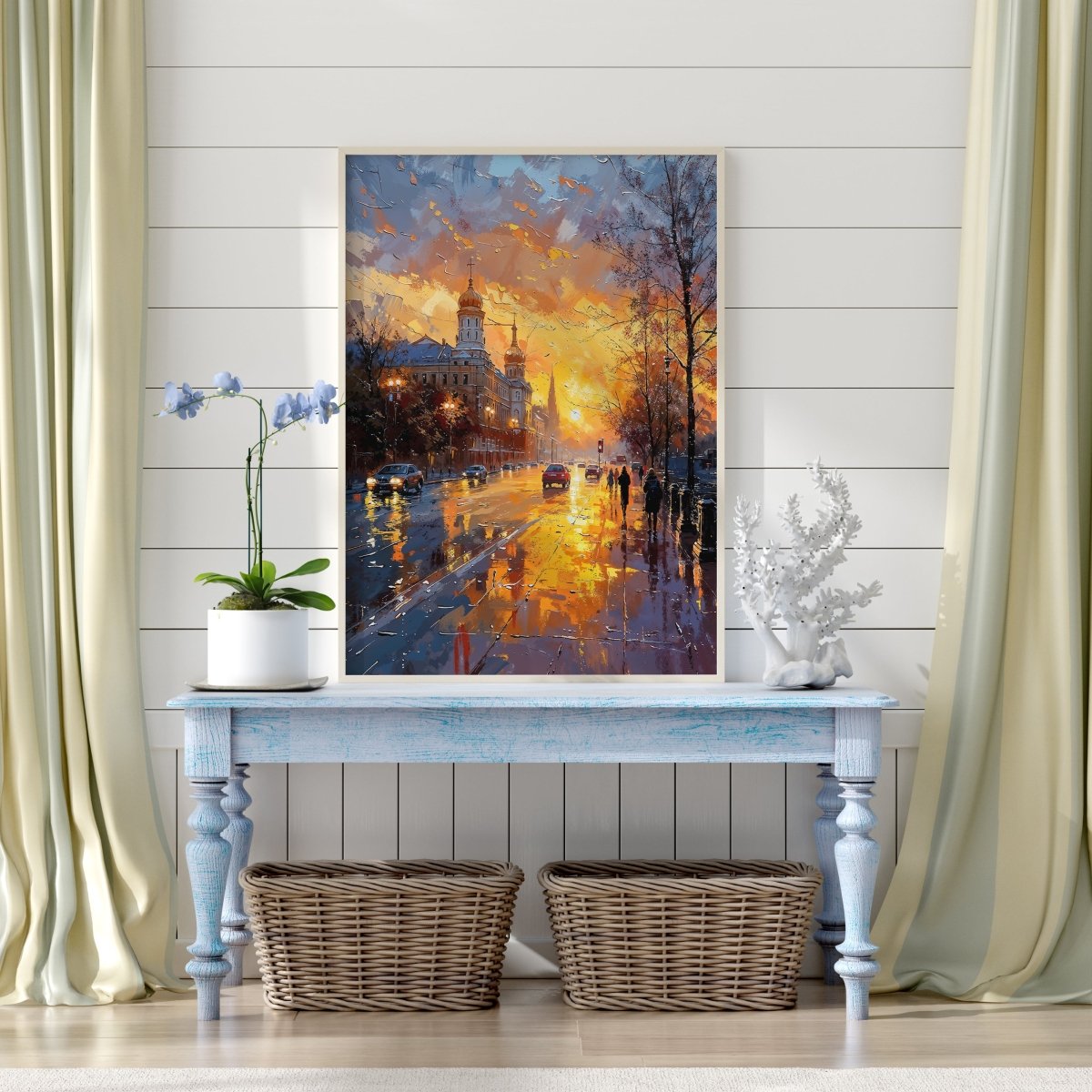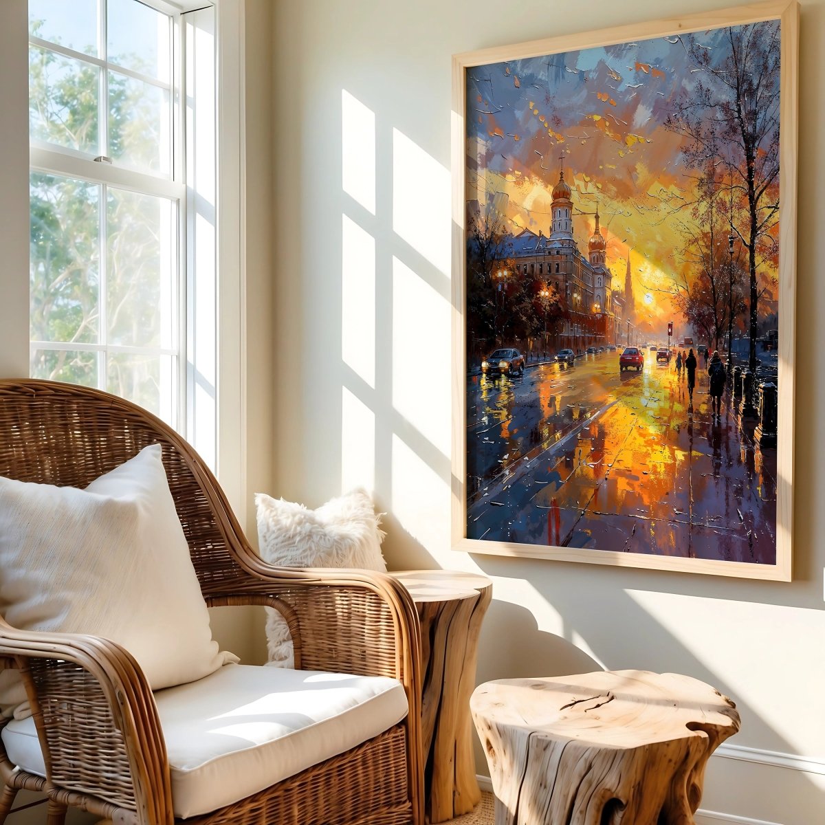 City of Gold captures the quiet breath between day and night—when streets glisten like memory and lamplight dissolves into shadow. Rain-slick stone and fading light create a warm, atmospheric blur that lingers like evening’s last breath.