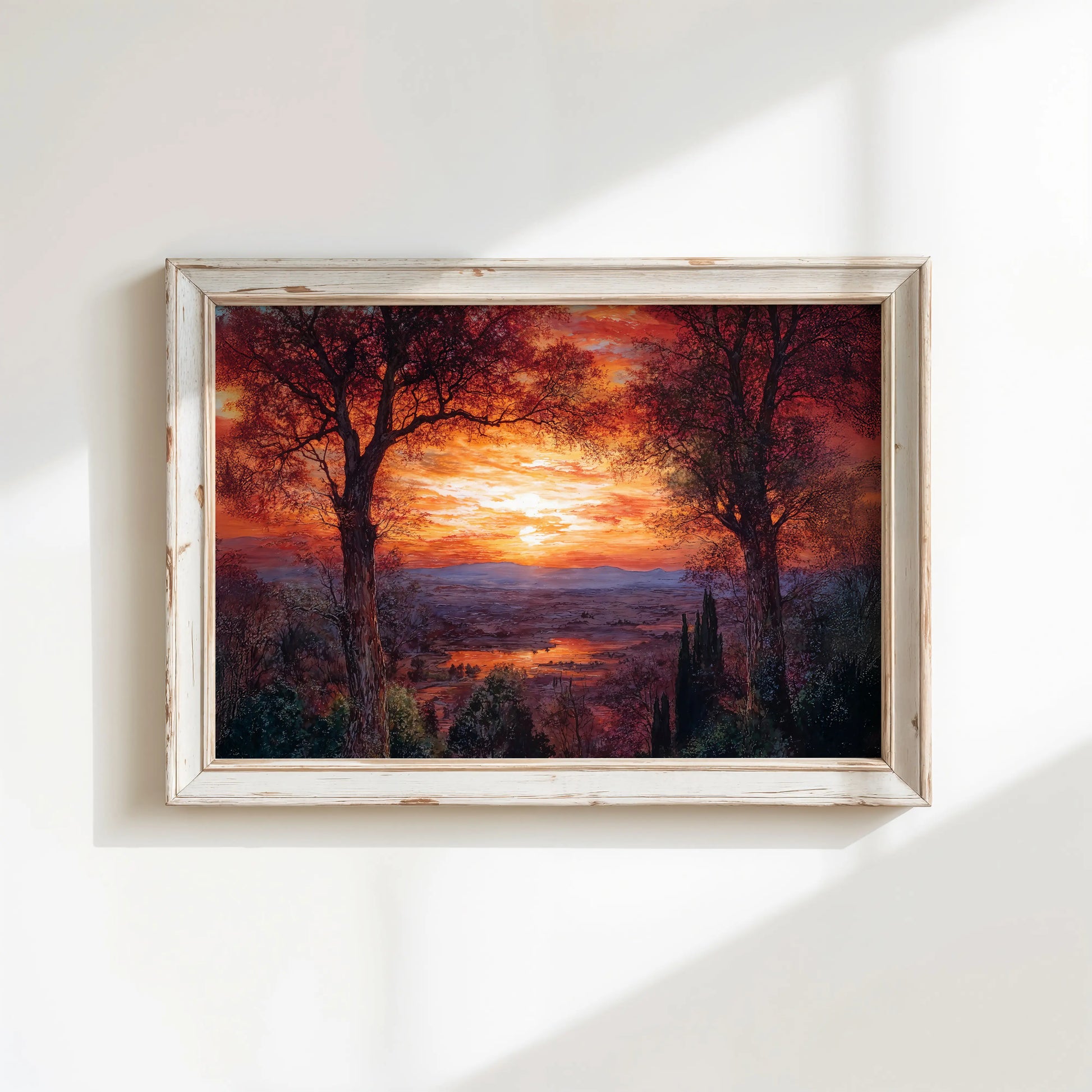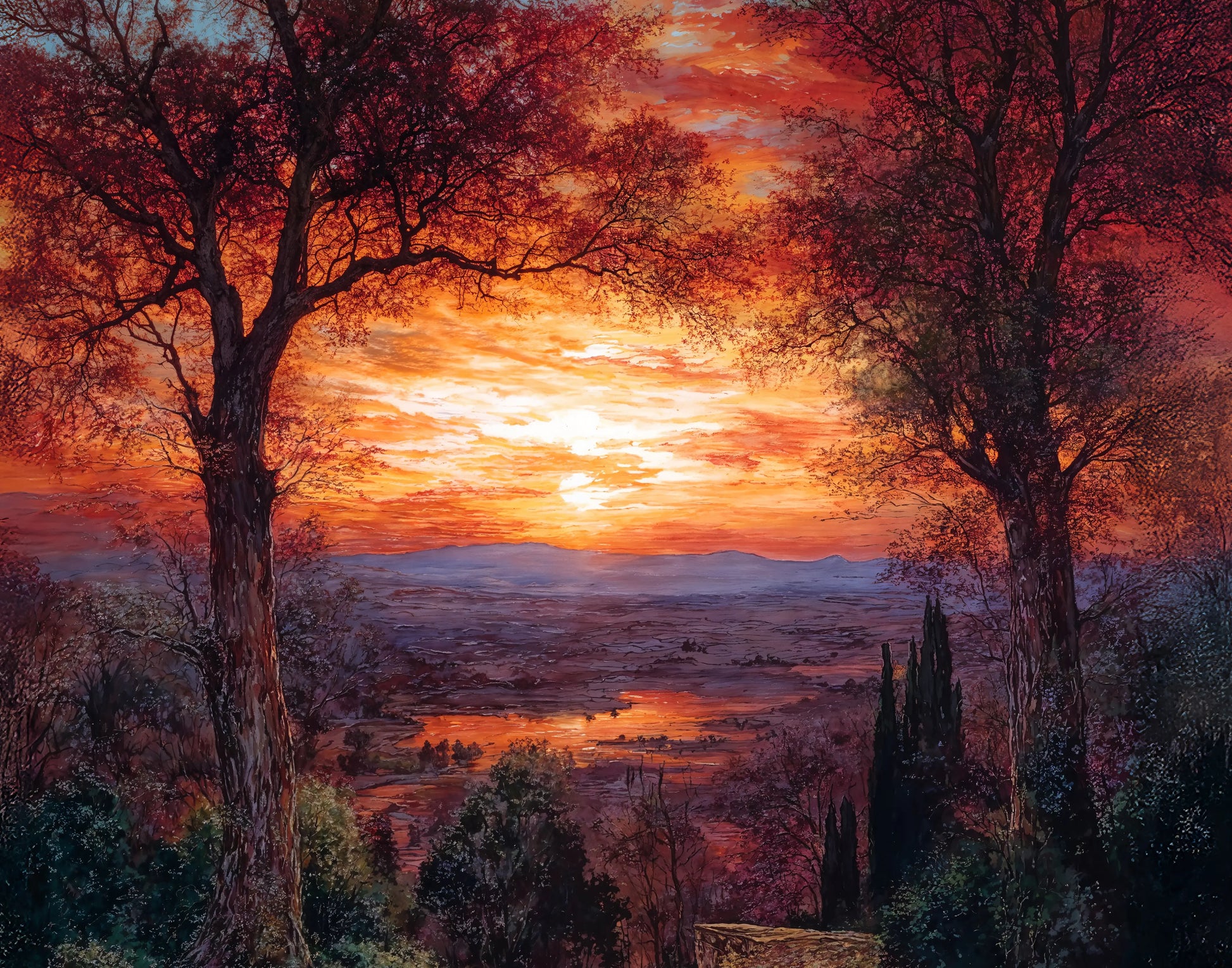 Golden Hour captures the moment the sun drops behind distant ridges, flooding the land with crimson light. Two ancient trees stand sentinel, framing the view like gates of memory, while reflections glimmer in winding waters below—each brushstroke dense with reverence and depth.