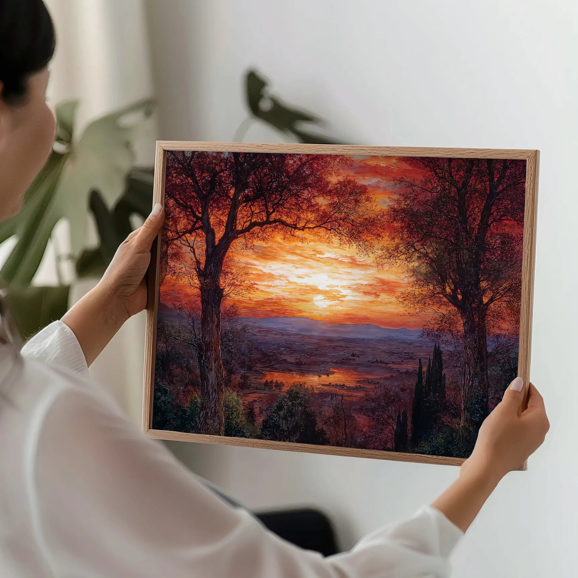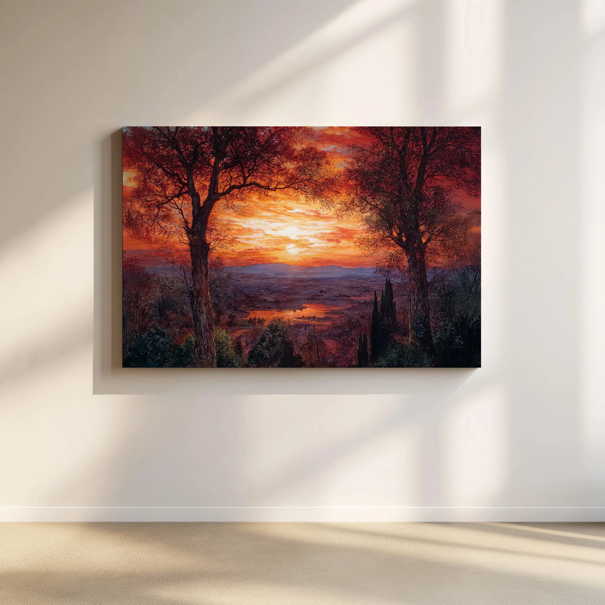 Golden Hour is a dramatic portal to nature’s grandeur. Perfect for statement walls, intimate sanctuaries, or sunset lovers’ spaces, its gallery-wrapped form glows with timeless contrast—where sky burns, trees whisper, and the horizon lives forever.