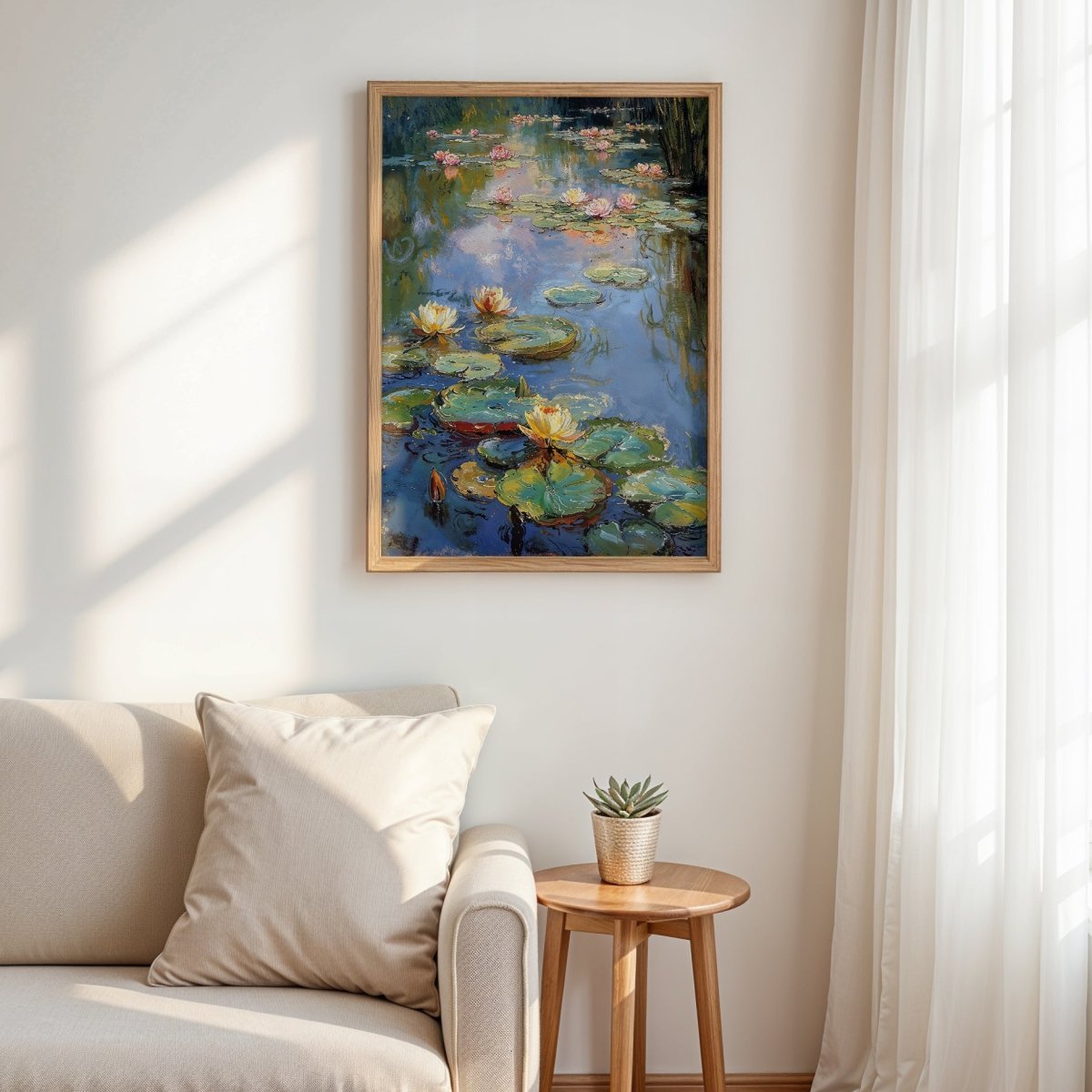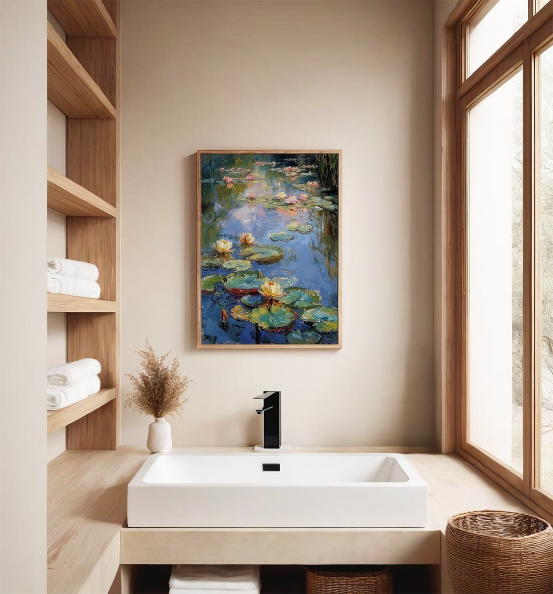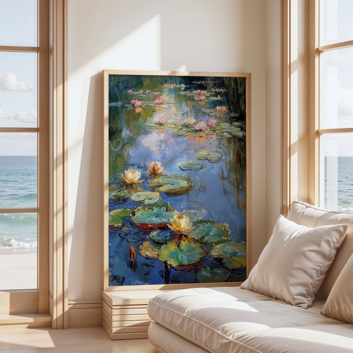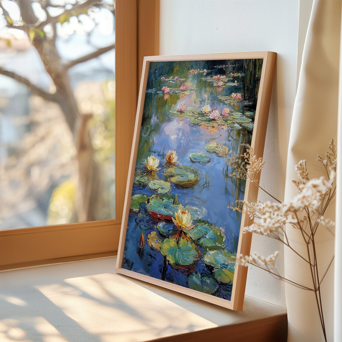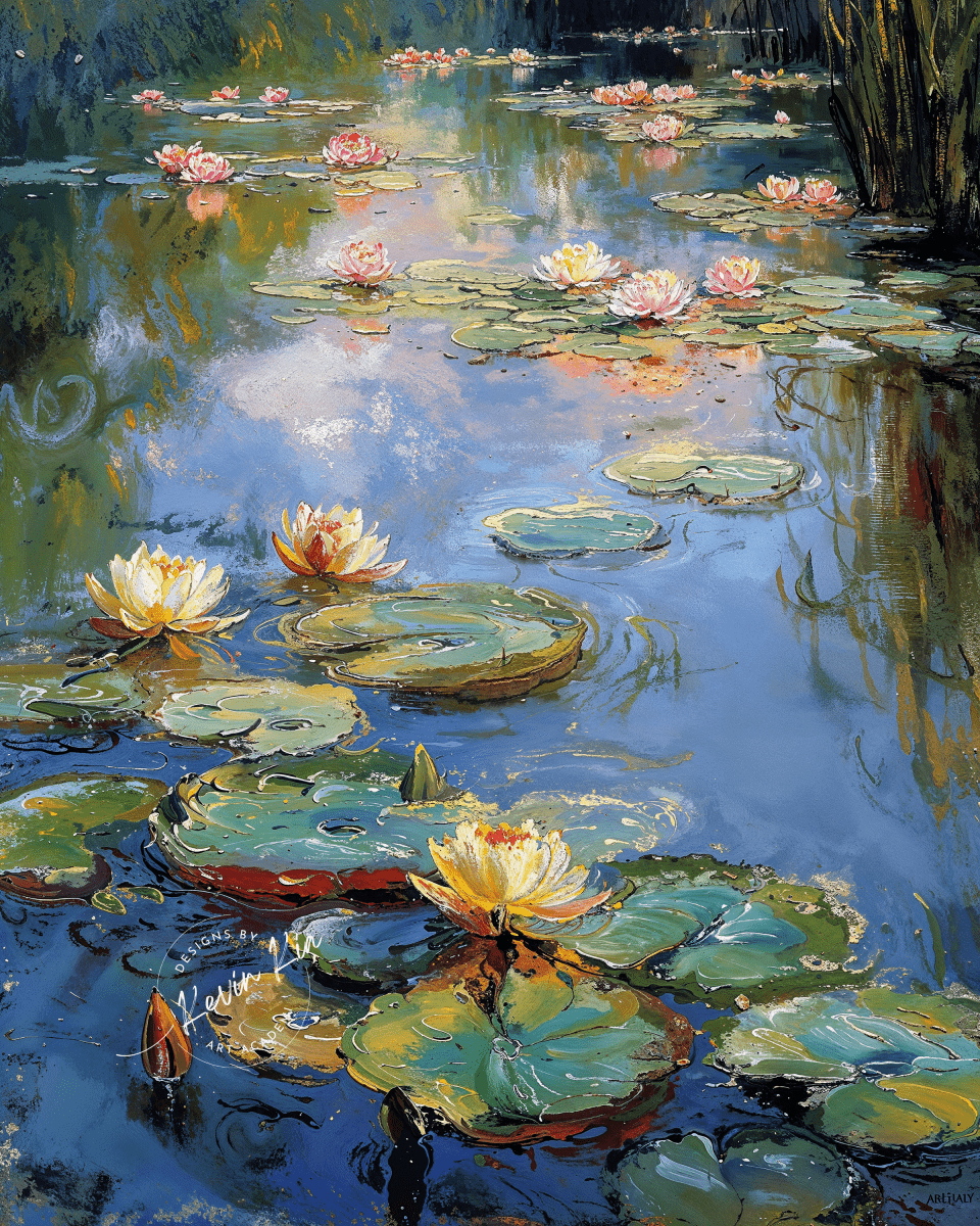 Mantra begins in silence. A still pond, flecked with lilies, holds the sun like a secret—each bloom a soft crescendo of gold and blush against mirrored sky. The composition moves with lyrical grace, where color flows as gently as breath.