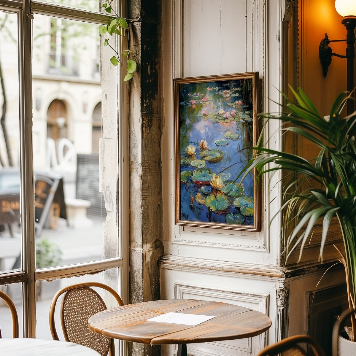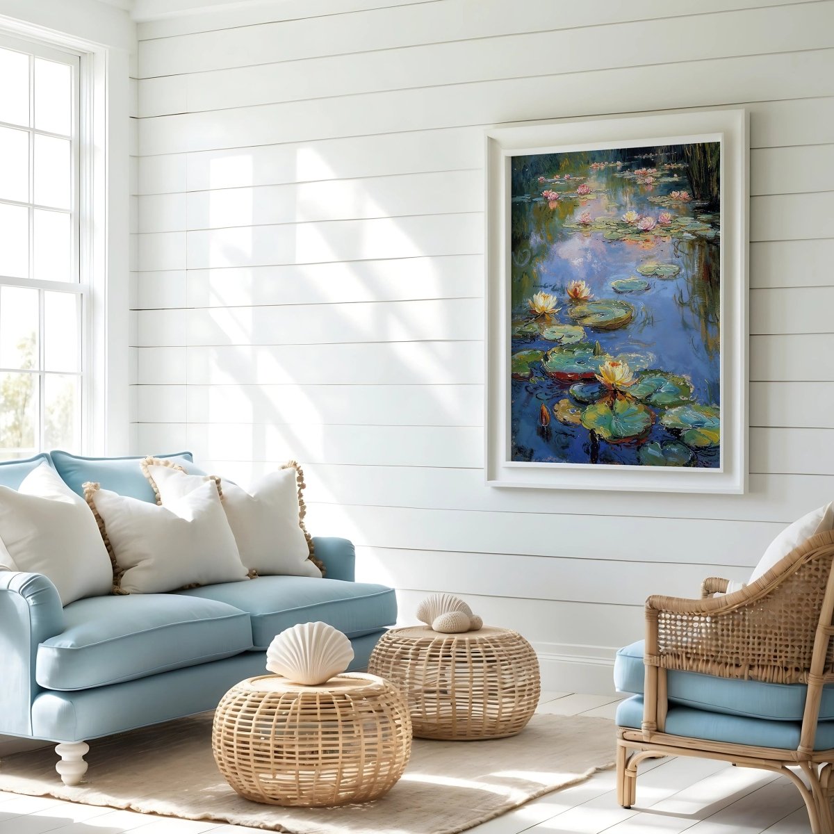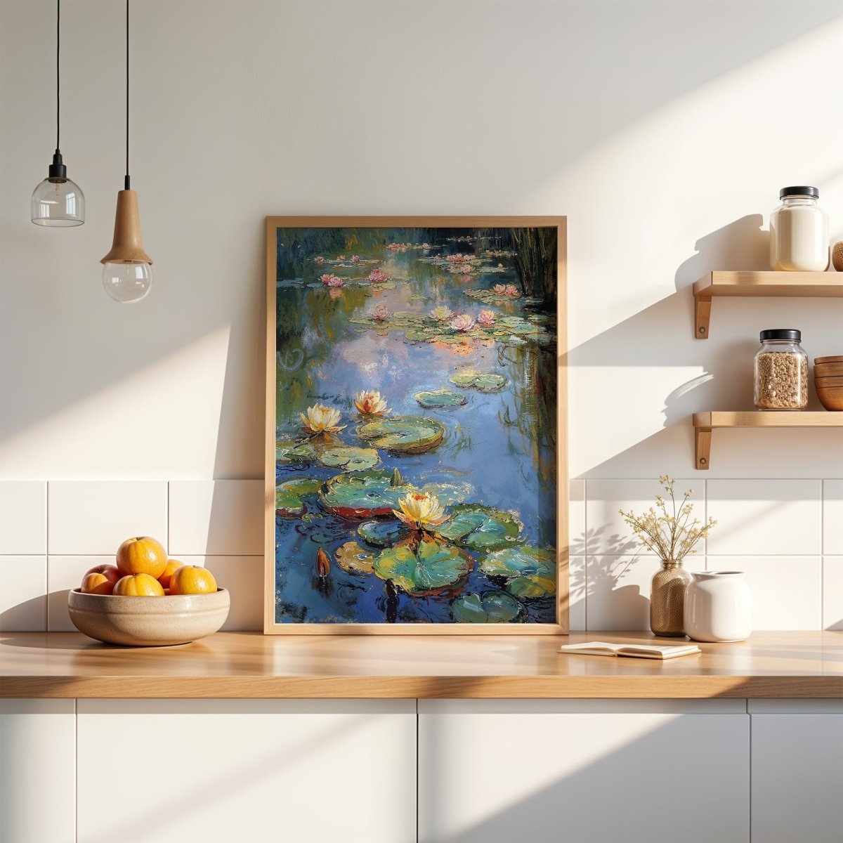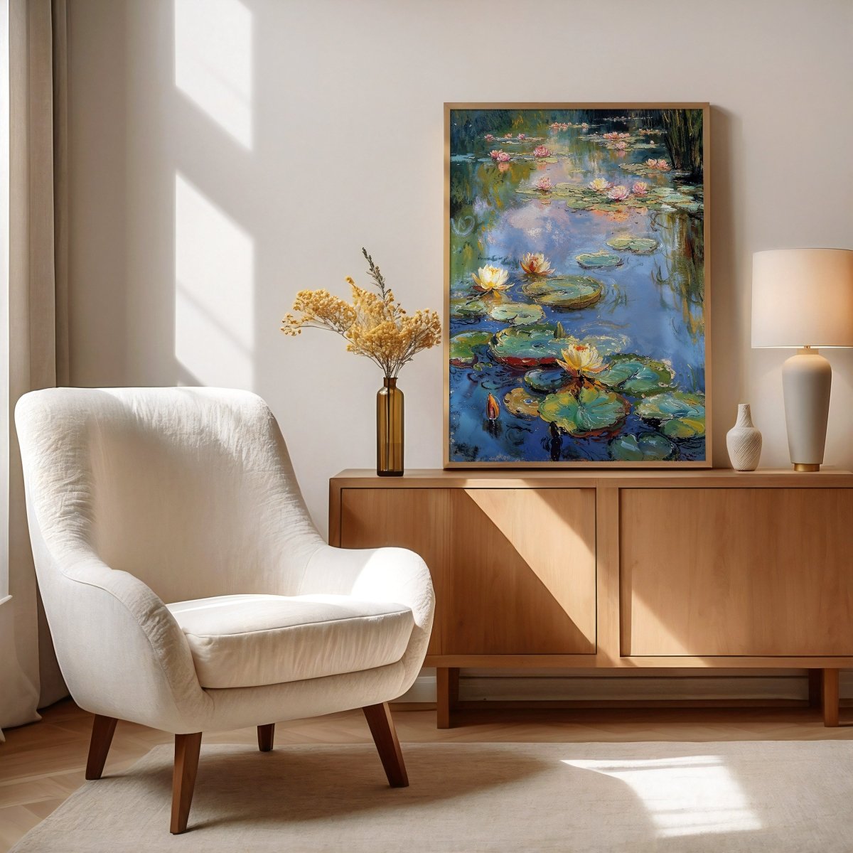 Mantra begins in silence. A still pond, flecked with lilies, holds the sun like a secret—each bloom a soft crescendo of gold and blush against mirrored sky. The composition moves with lyrical grace, where color flows as gently as breath.