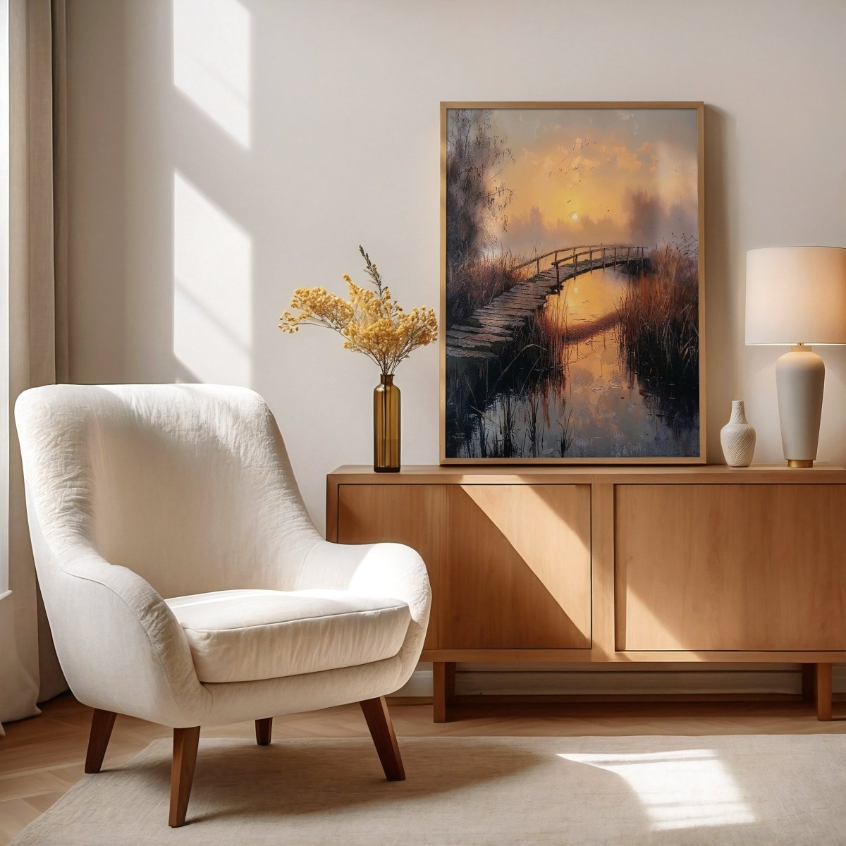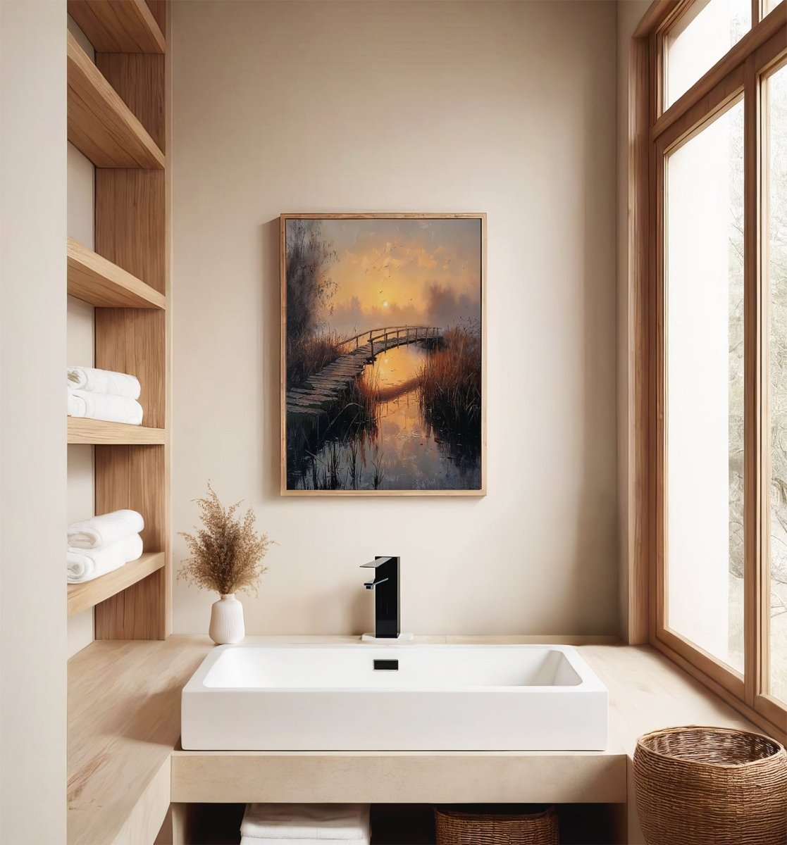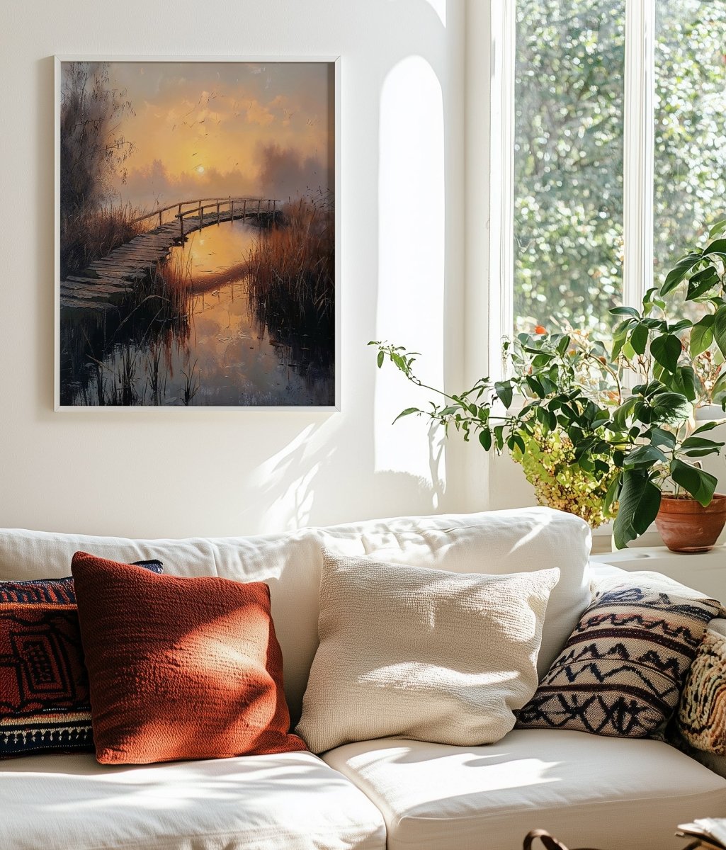 Bridge to Sunset slips low behind a quiet marsh, illuminating a weathered footbridge that arcs across still water like a suspended memory. The moment breathes—silent, amber, and serene. It captures that fleeting pause between day and night, where everything glows yet nothing moves.