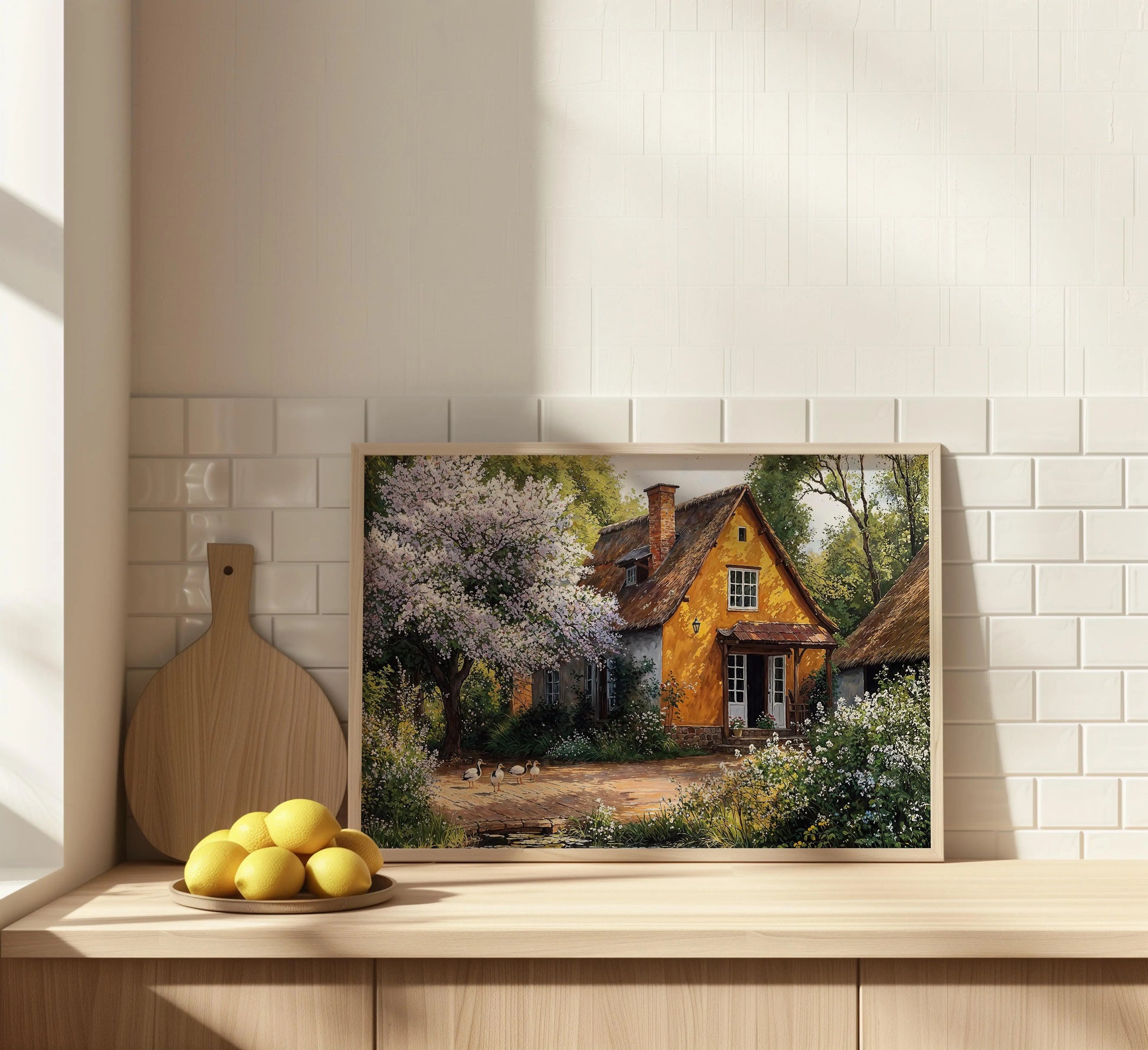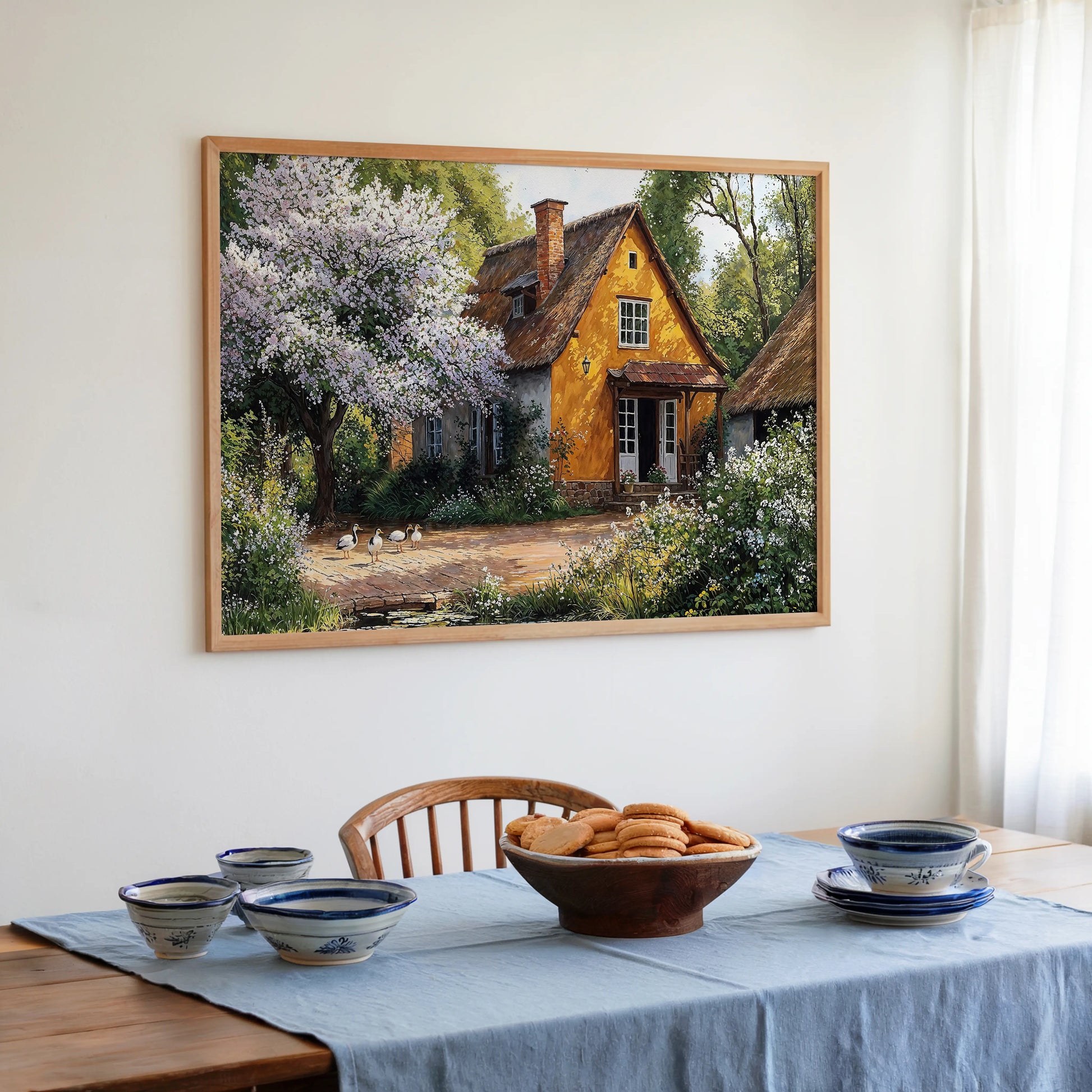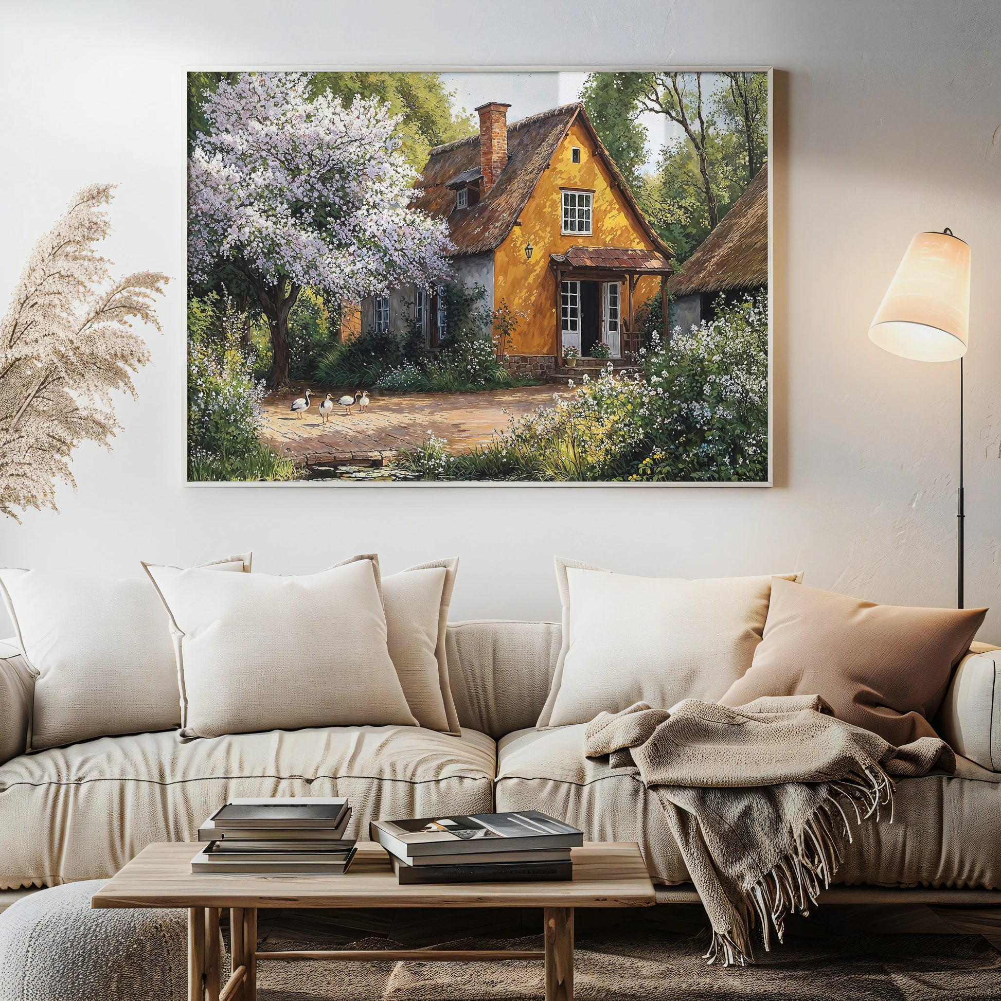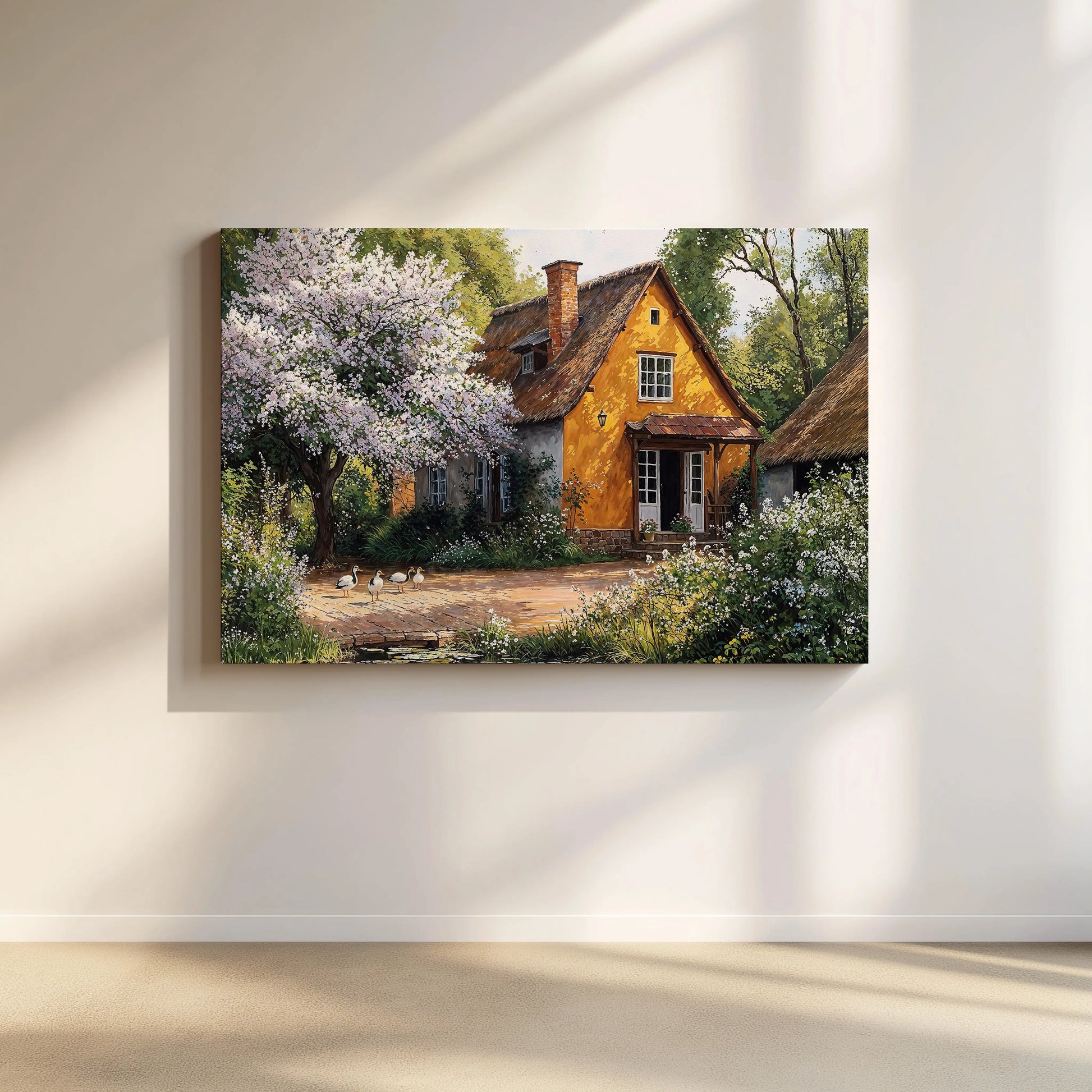 Golden Pond captures the peaceful rhythm of spring with a golden yellow thatched cottage nestled beneath a flowering tree. A group of ducks meanders near a calm pond, bathed in sunlight.