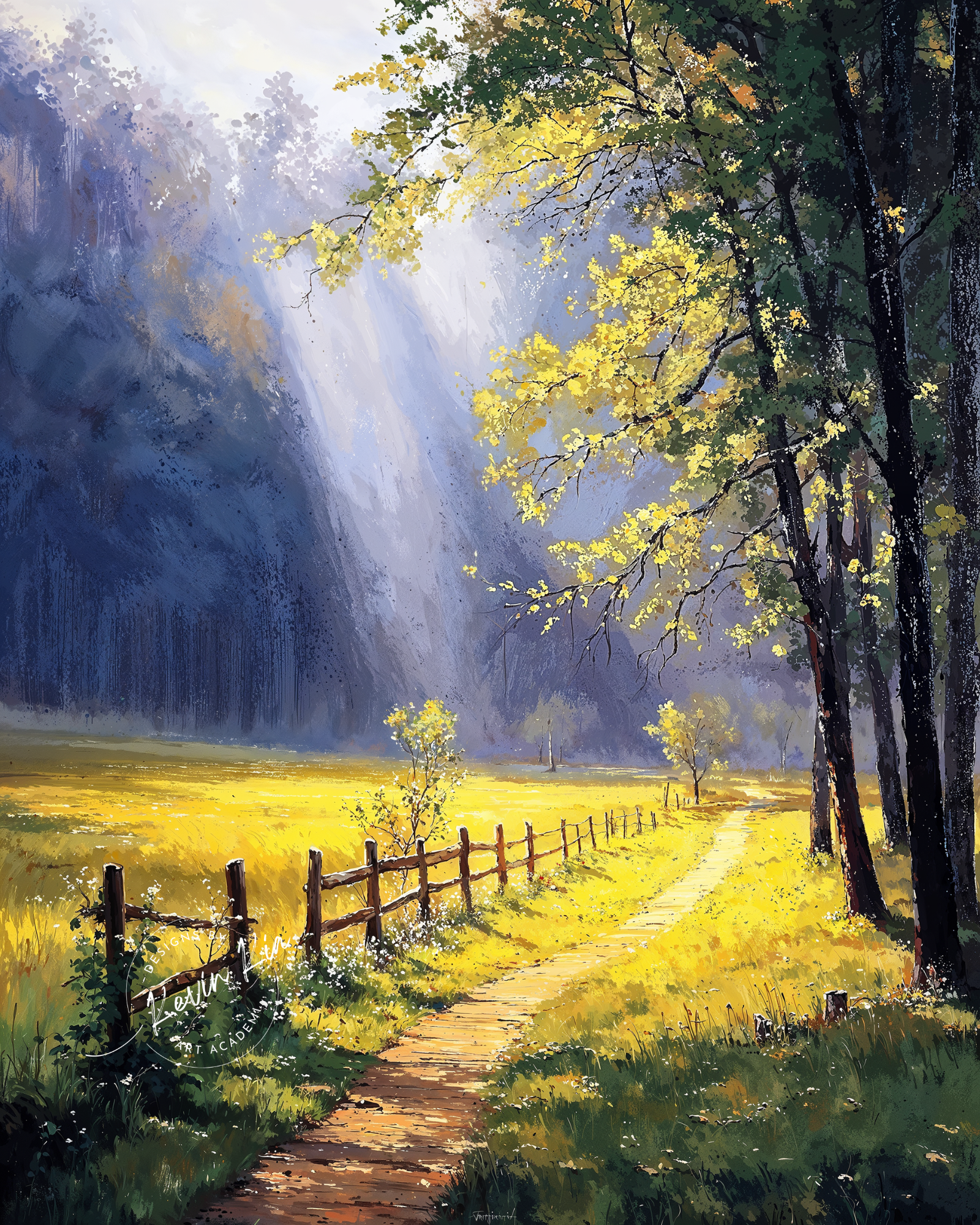 Golden Quietude unfolds where forest meets field, and sunlight dances gently across a winding trail. Dappled light spills through overhanging branches, layering shadow and brilliance in a rhythm only morning knows. Fence posts lean slightly with time, guiding the eye toward the horizon where gold meets haze.