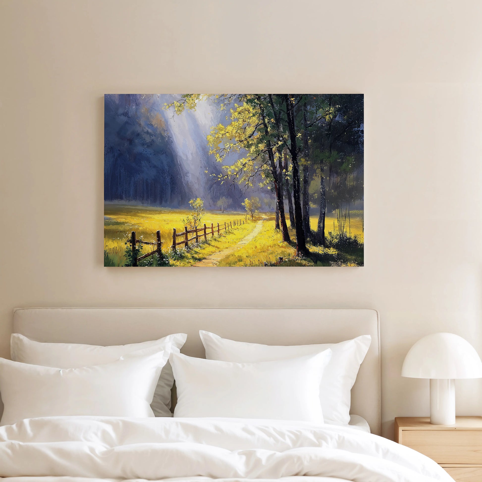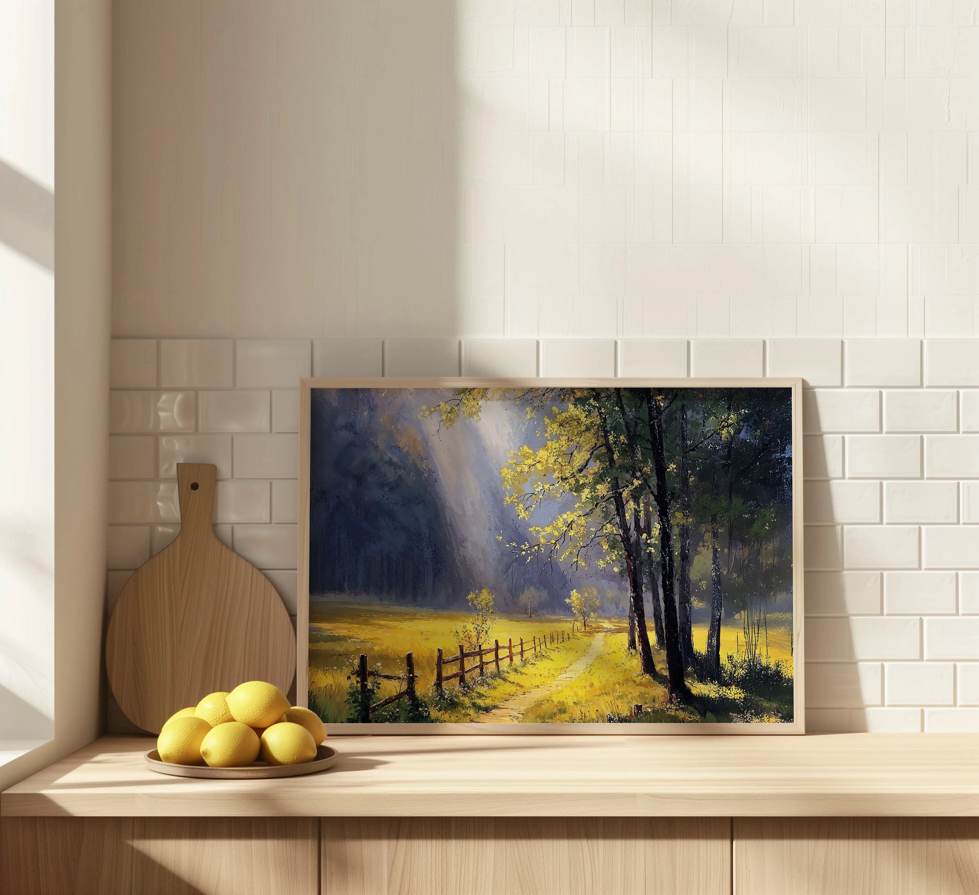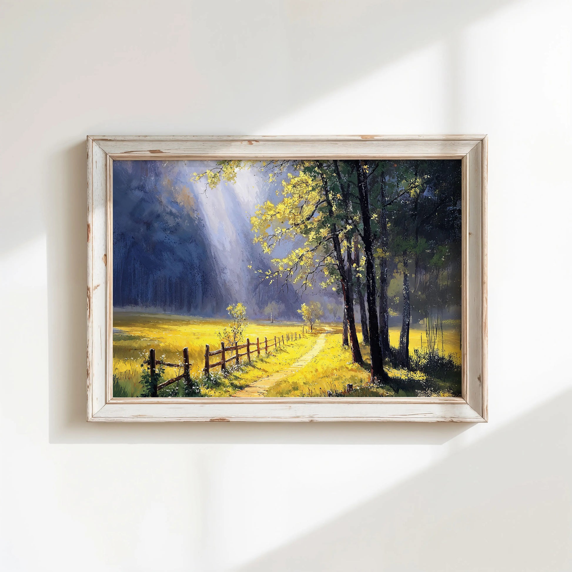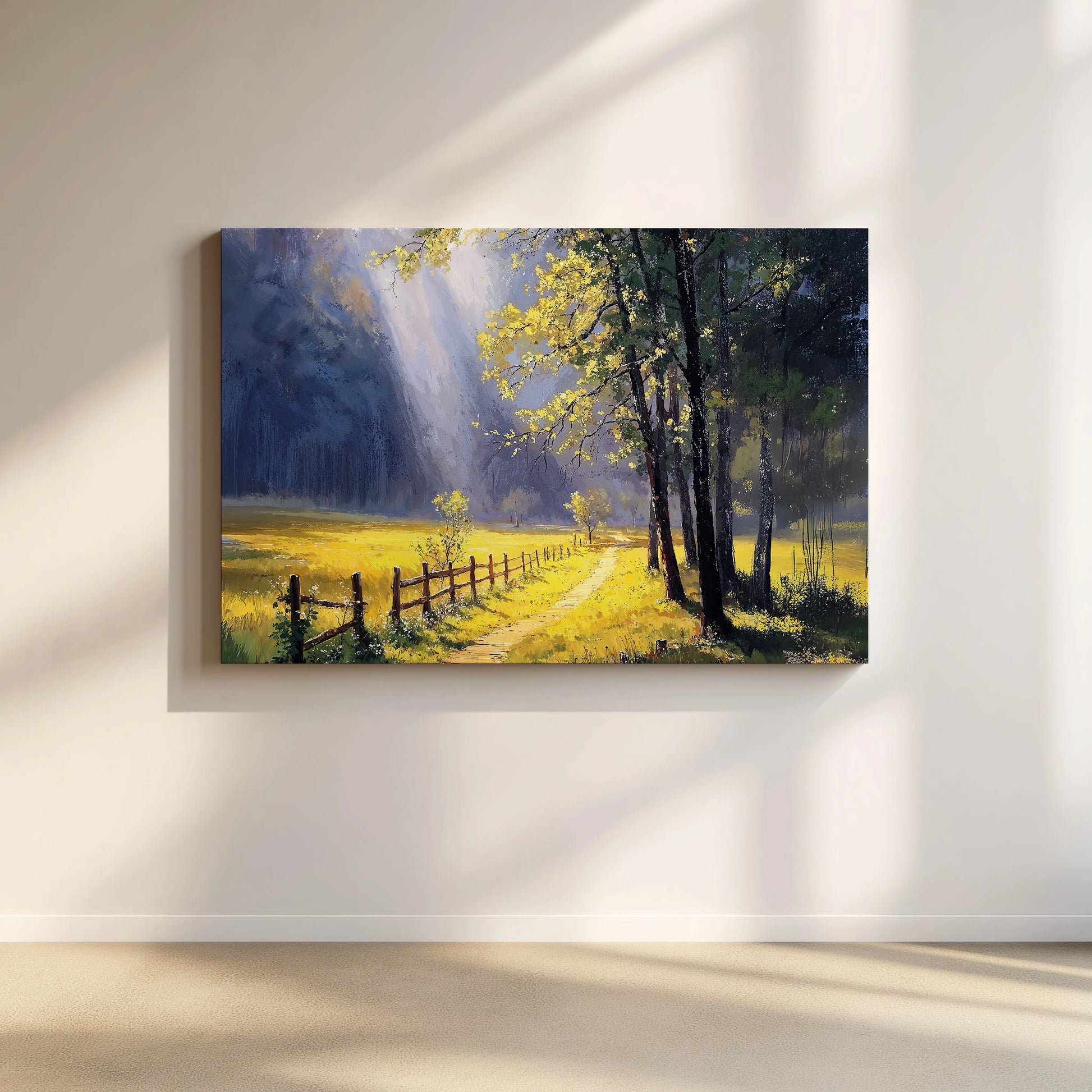 Golden Quietude invites you down a sunlit path through a glowing golden meadow, gently lined with trees casting soft shadows from the bordering woods. The morning light spills across the path, suggesting peace, freedom, and reflection.