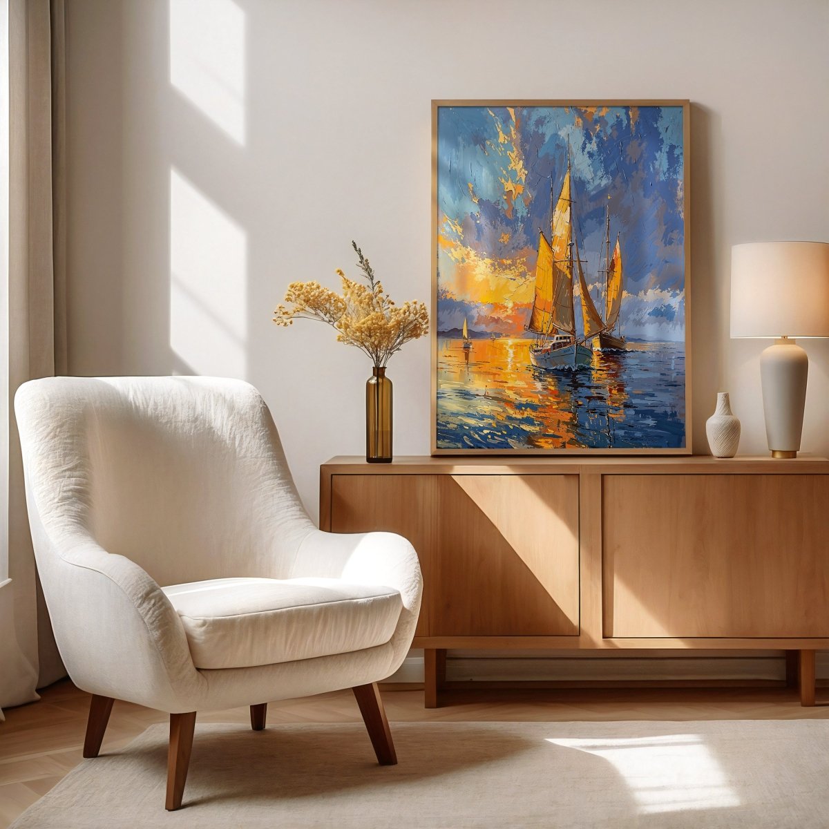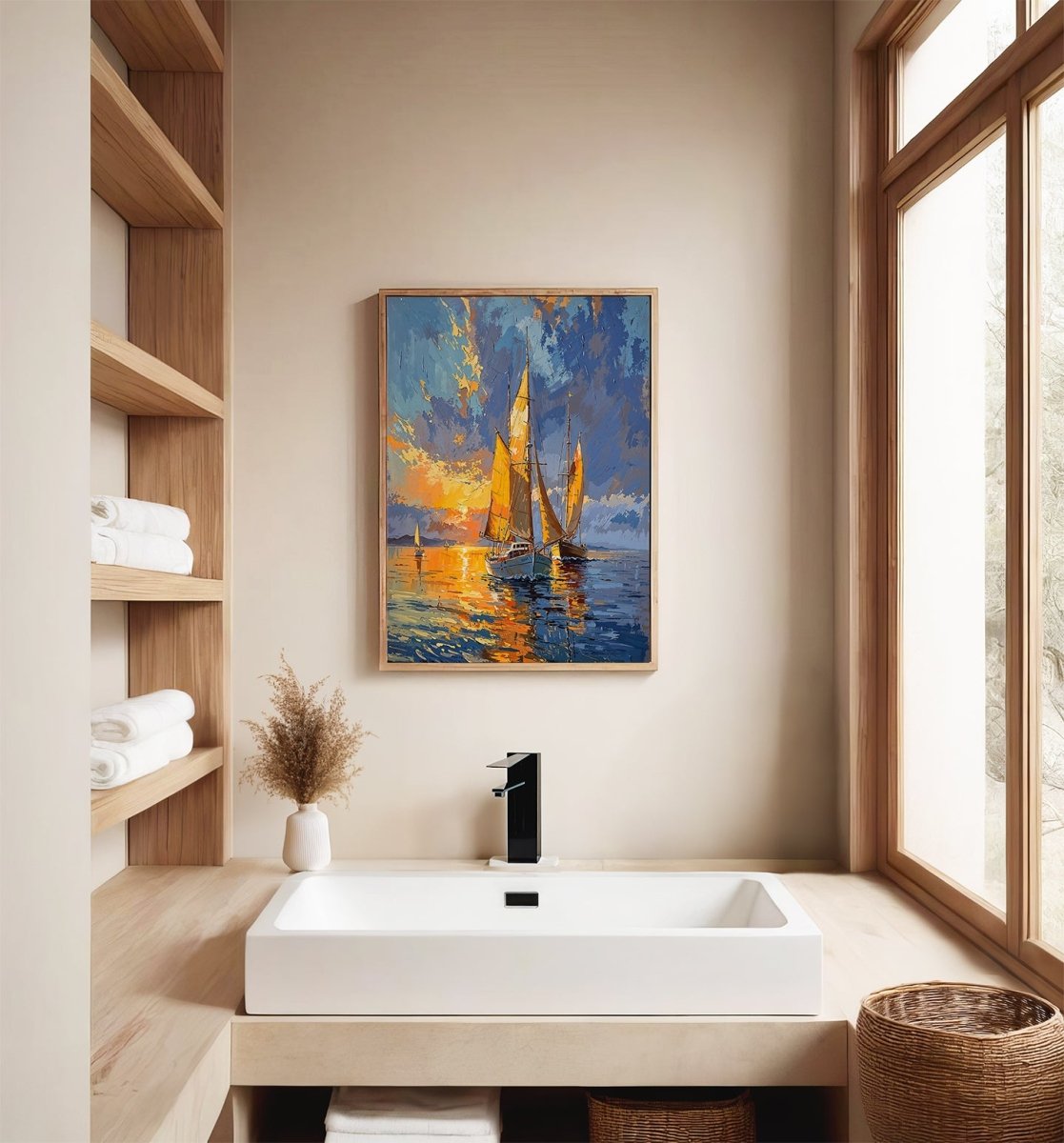 Ideal for contemporary coastal décor, relaxed modern interiors, or any space seeking warmth through elegance, Golden Sails offers a moment suspended—where movement is gentle, light is memory, and stillness glows.