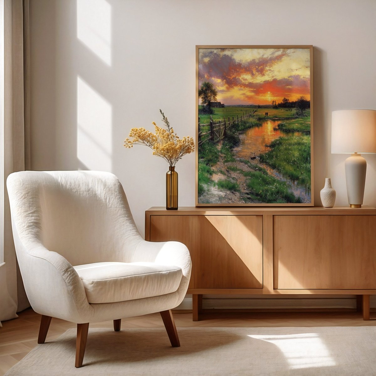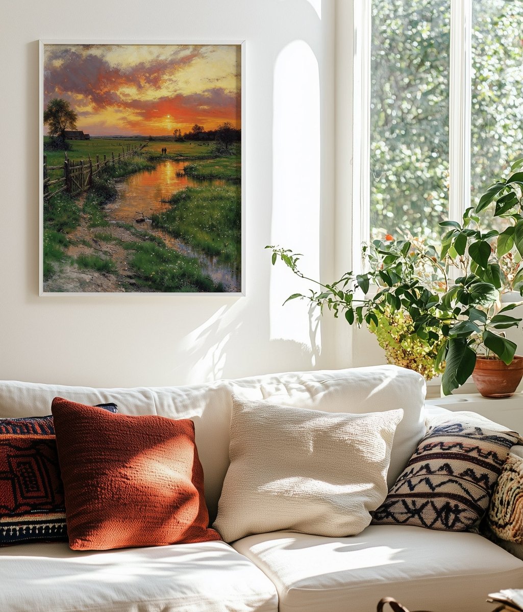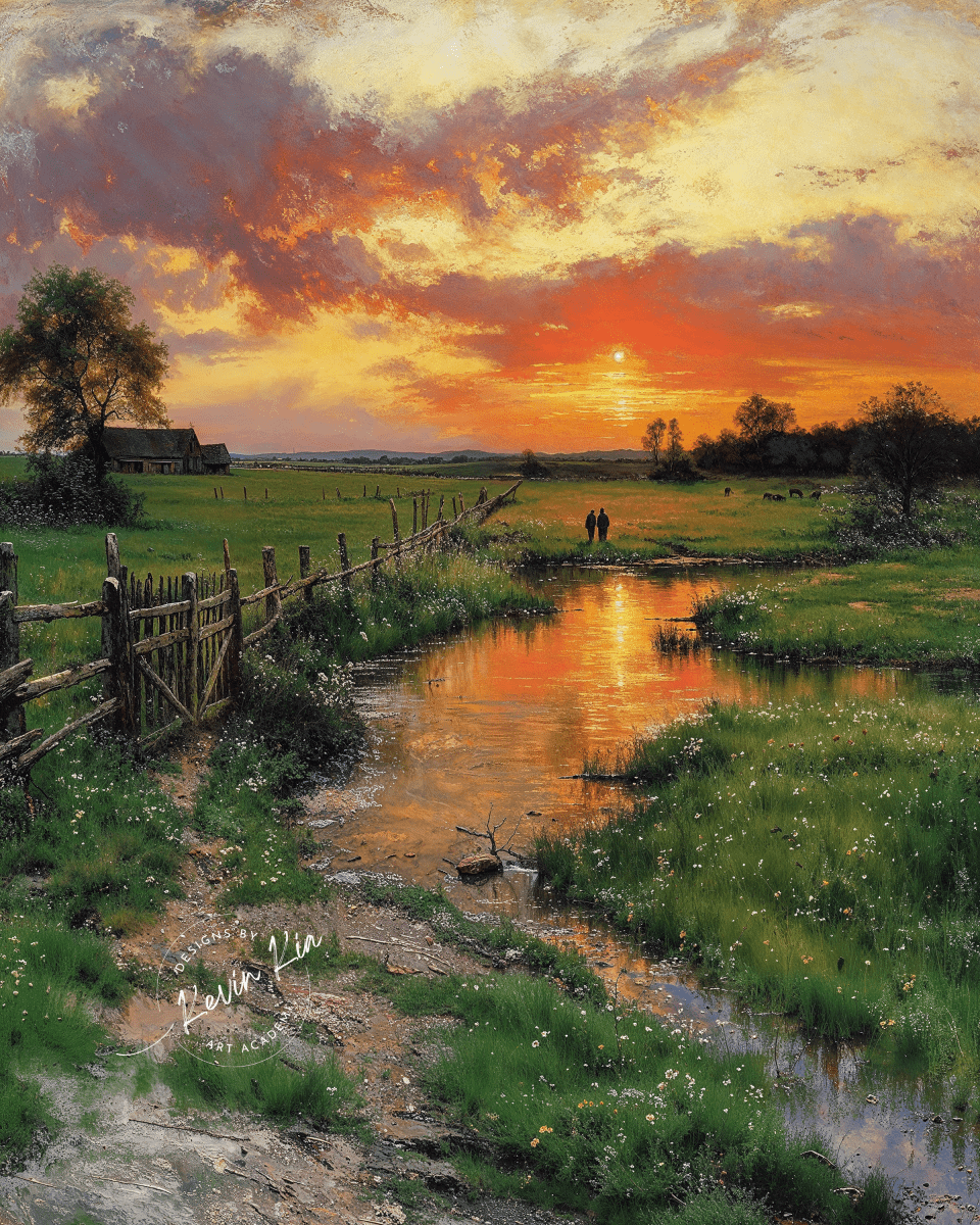 Heartfelt captures the hush of day's end as a golden stream winds through quiet pastureland, mirroring the embers of a sky in soft collapse. Two distant figures walk slowly toward the horizon, their closeness echoing the land’s quiet promise of rest. Sunlight rests low, tinting earth and water alike with farewell light.
