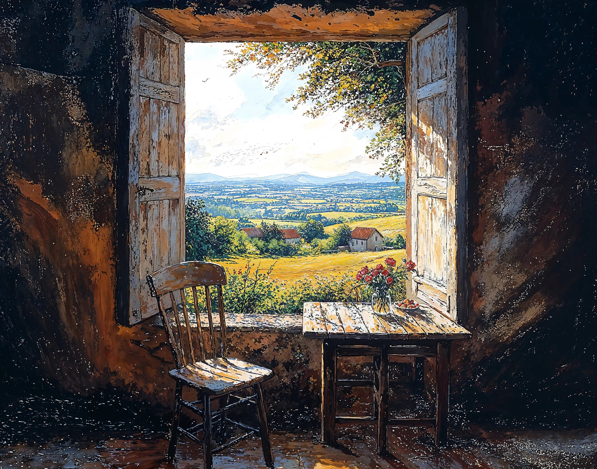 In Golden Threshold, the distant hills glow like old promises, the fields hum their gentle gold, and a single chair holds the warmth of someone who stepped away only for a moment.