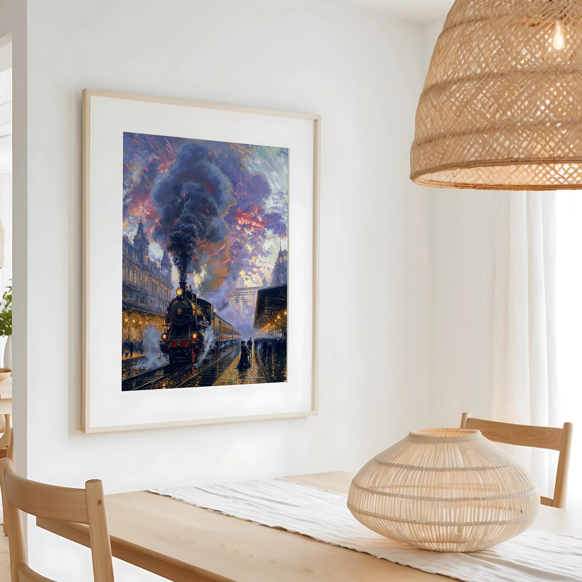 Grand Terminal captures the stillness between departure and arrival—a quiet moment bathed in amber dusk and rising steam. A lone station stands beneath a glowing sky, evoking a calm sense of anticipation.