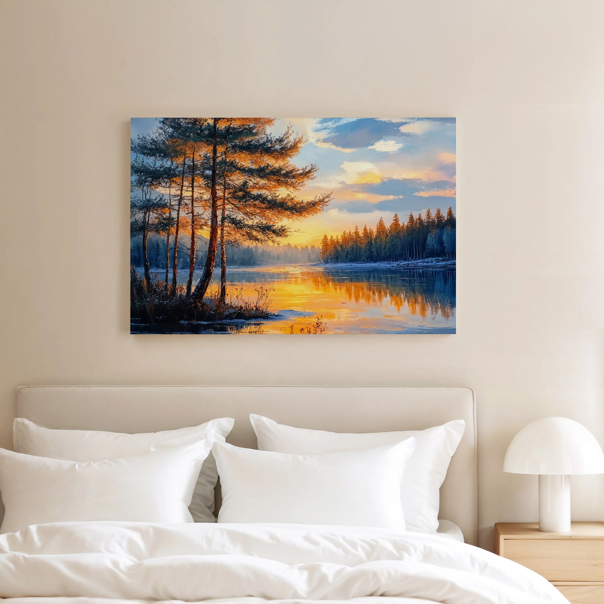 Gravity captures a fleeting pause at day’s end, where forest and sky dissolve into their mirrored reflections along still water. Warm amber light drifts across the surface, softened by cool blue passages and the gentle silhouettes of trees lining the riverbank. The composition rests in equilibrium, holding the viewer within a moment of quiet suspension.