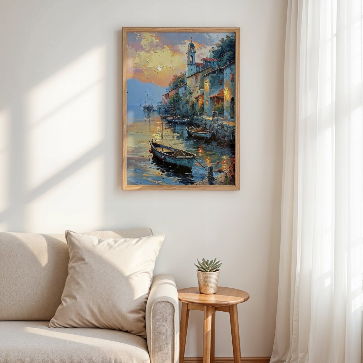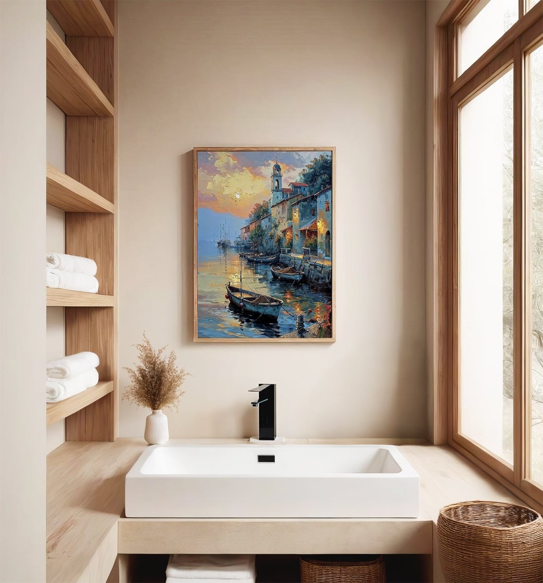 Harbor at Dusk captures the hush between day and night—where the last sun traces warm reflections across still waters and lanterns flicker to life along the stone quay. Small boats drift gently in the calm, their ropes slack, as rooftops and bell towers dissolve into the lavender sky.