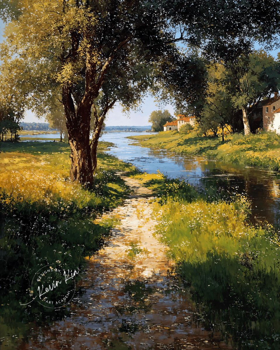 Harmony captures the union of light, water, and earth in a pastoral riverside scene. Gentle brushstrokes render the dappled play of sunlight across trees and meadows, while the reflective water carries soft blues and golden tones through the composition. The balance of open fields, rustic cottages, and winding river creates a sense of quiet completeness, as if every element belongs to the same tranquil rhythm.