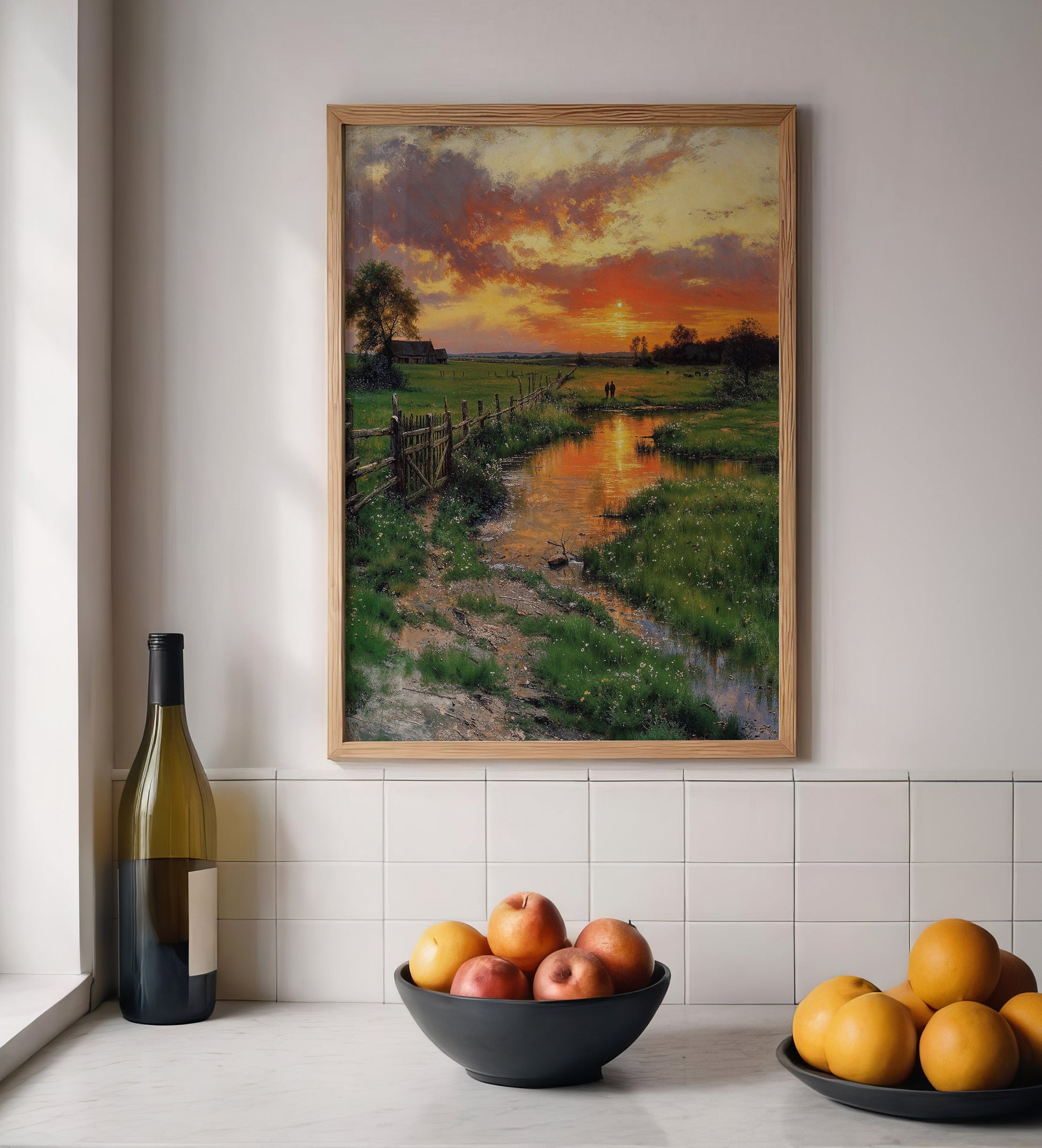 Heartfelt captures the hush of day's end as a golden stream winds through quiet pastureland, mirroring the embers of a sky in soft collapse. Two distant figures walk slowly toward the horizon, their closeness echoing the land’s quiet promise of rest. Sunlight rests low, tinting earth and water alike with farewell light.