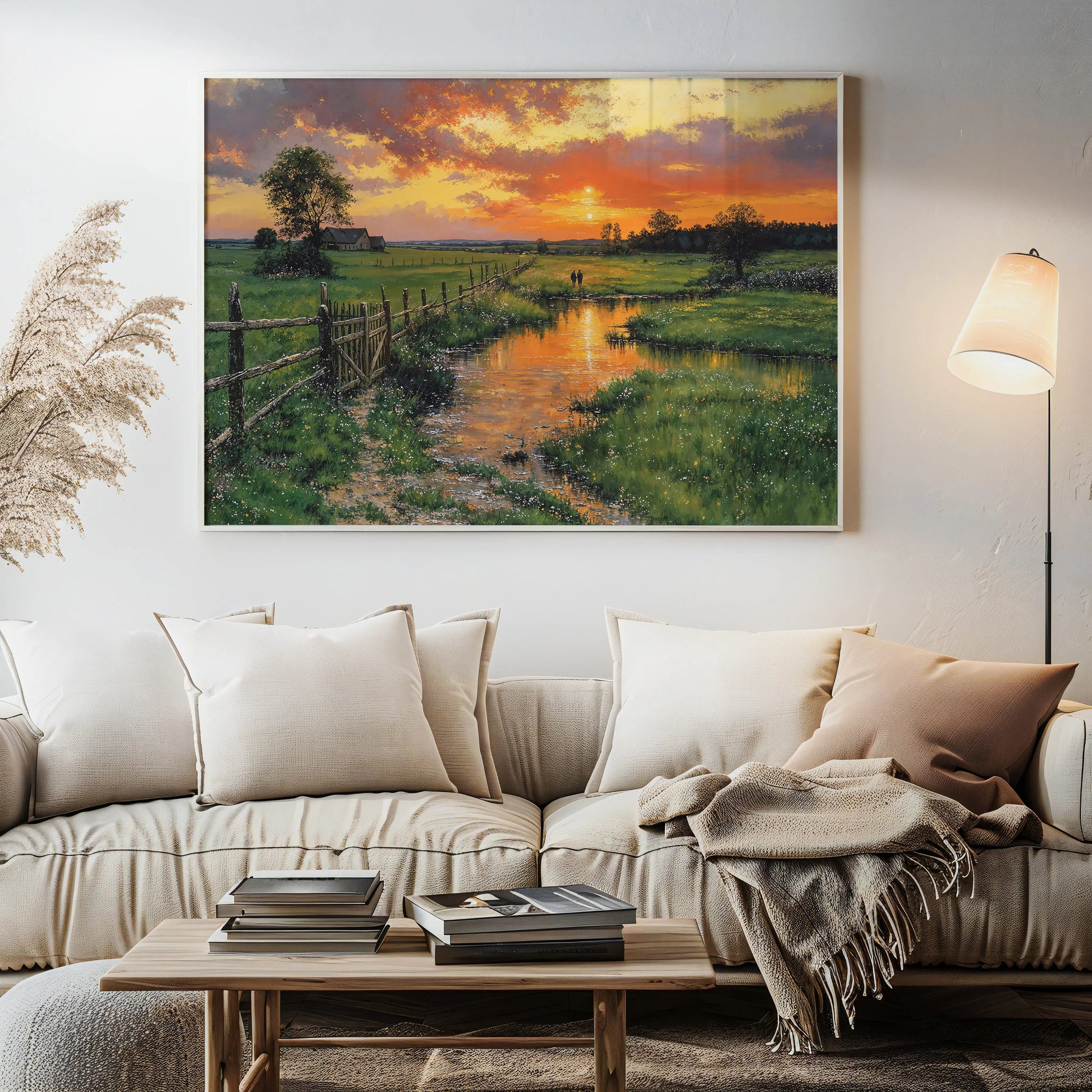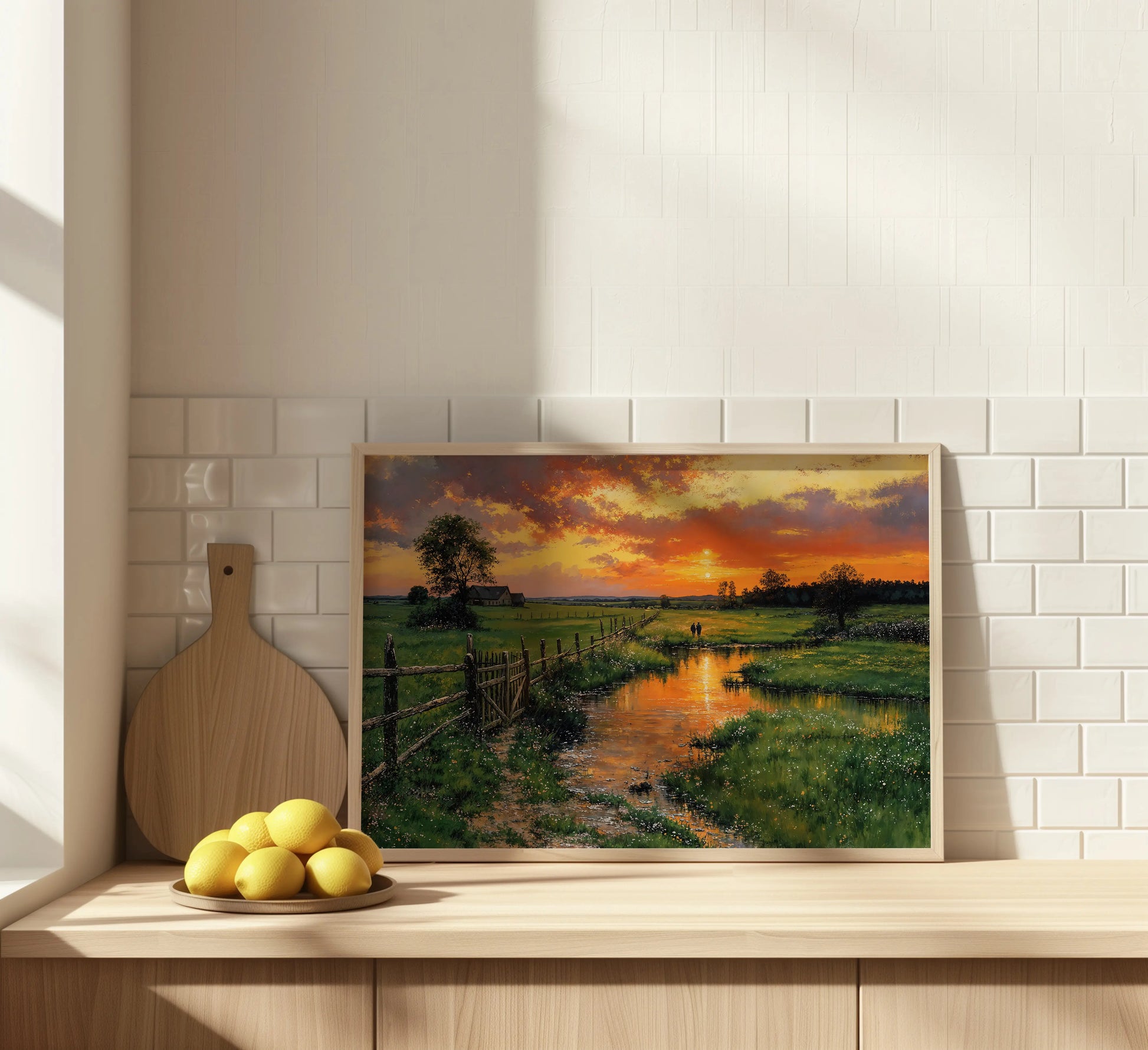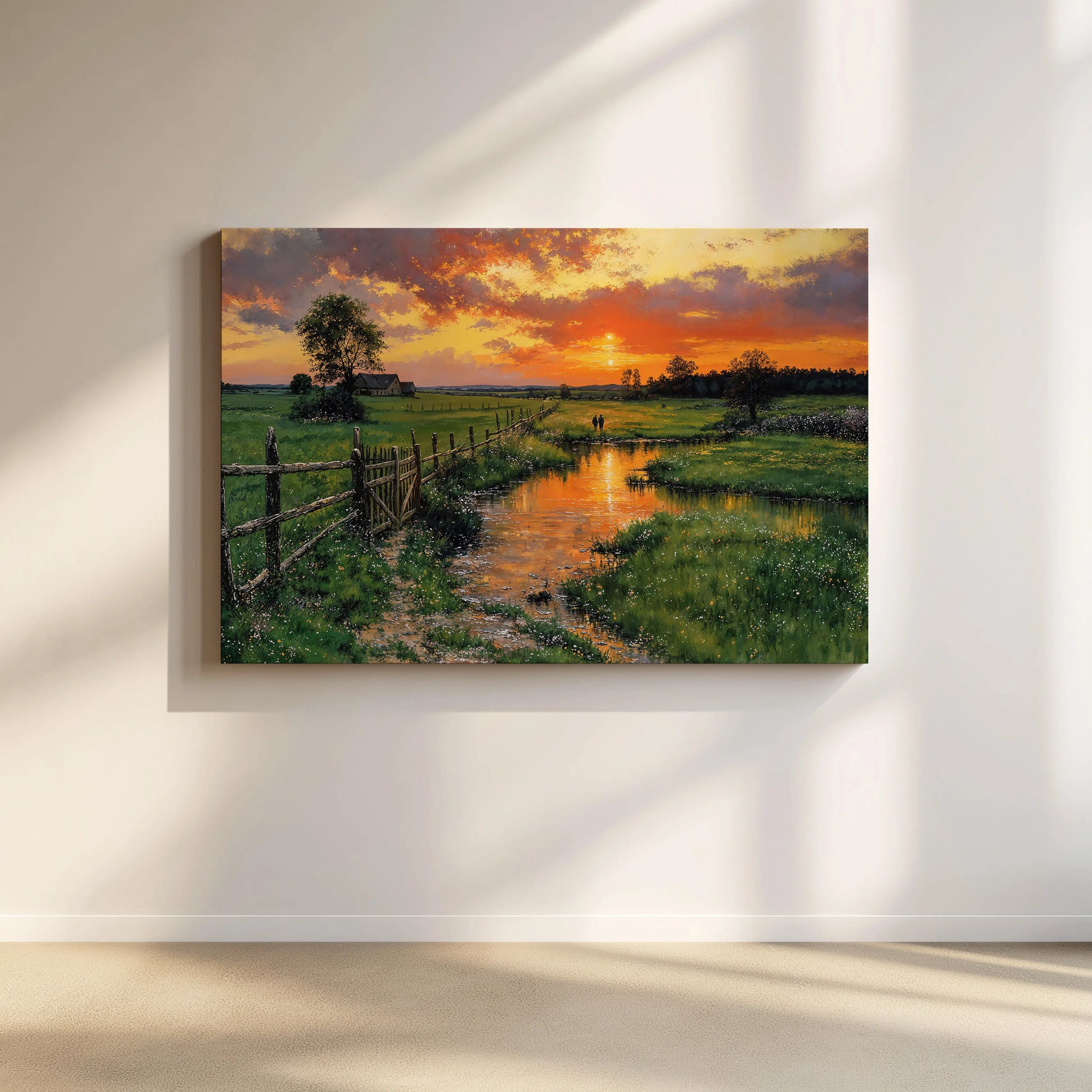 Heartfelt brings calm radiance to kitchens, sunrooms, or cozy interiors. Its gallery-wrapped edges create a seamless window into countryside serenity—where the sky burns low, the grass leans gently, and stillness walks beside you.