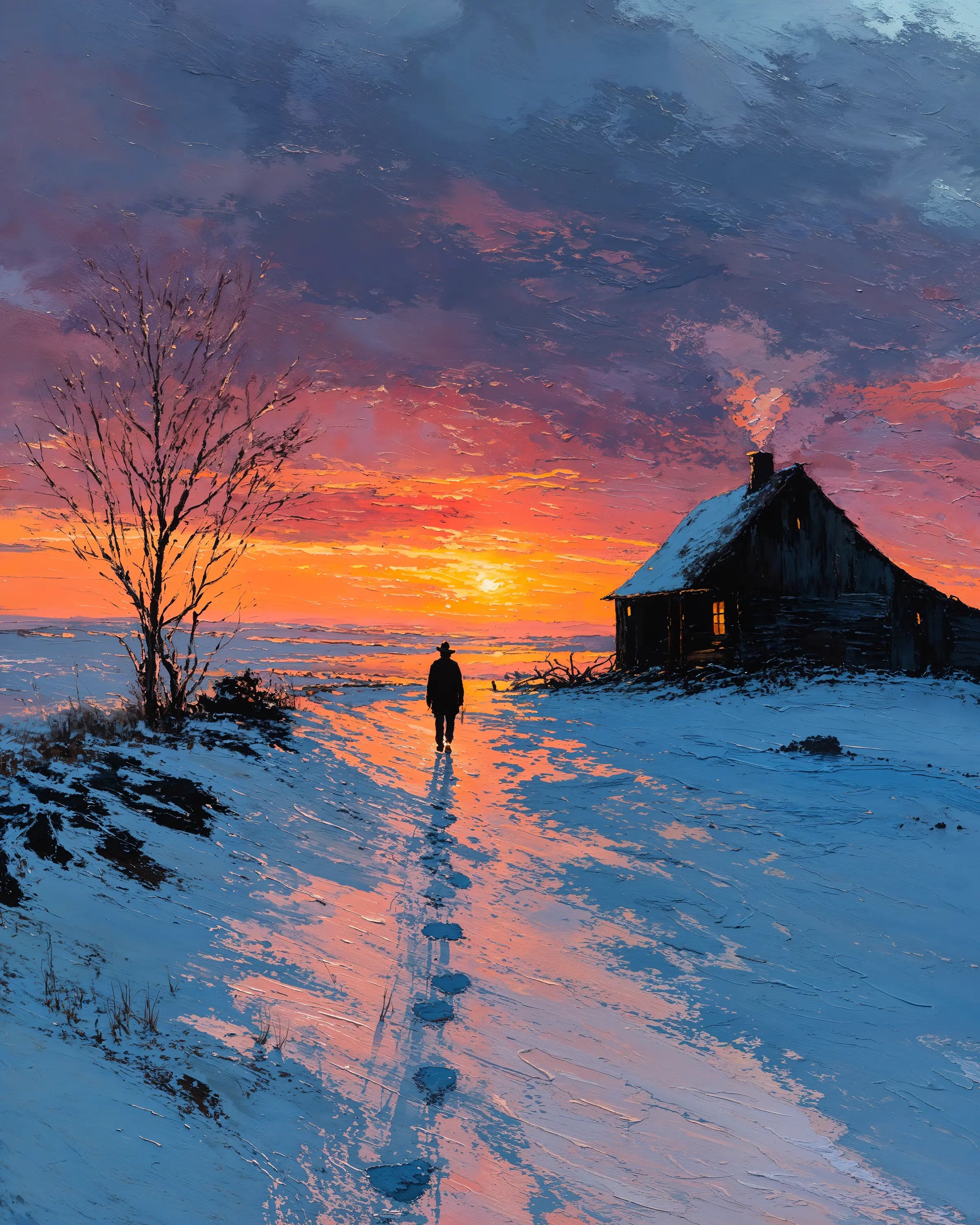 In Holyole, a lone figure walks away from a snow-covered cabin as the horizon blazes with color—violet clouds above, firelight below. Footprints trail across icy ground, catching the last golden light of day, while smoke curls softly from the cabin’s chimney.
