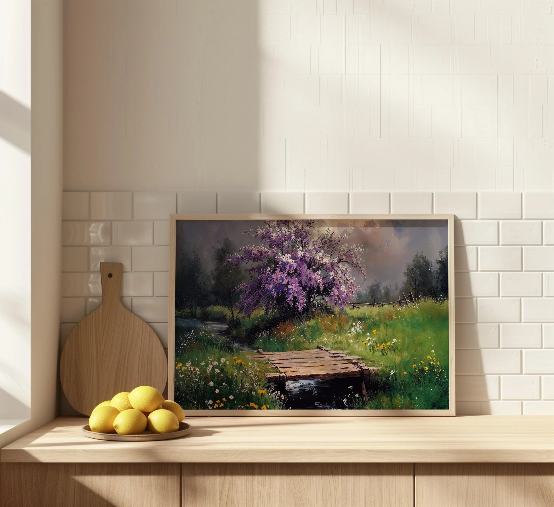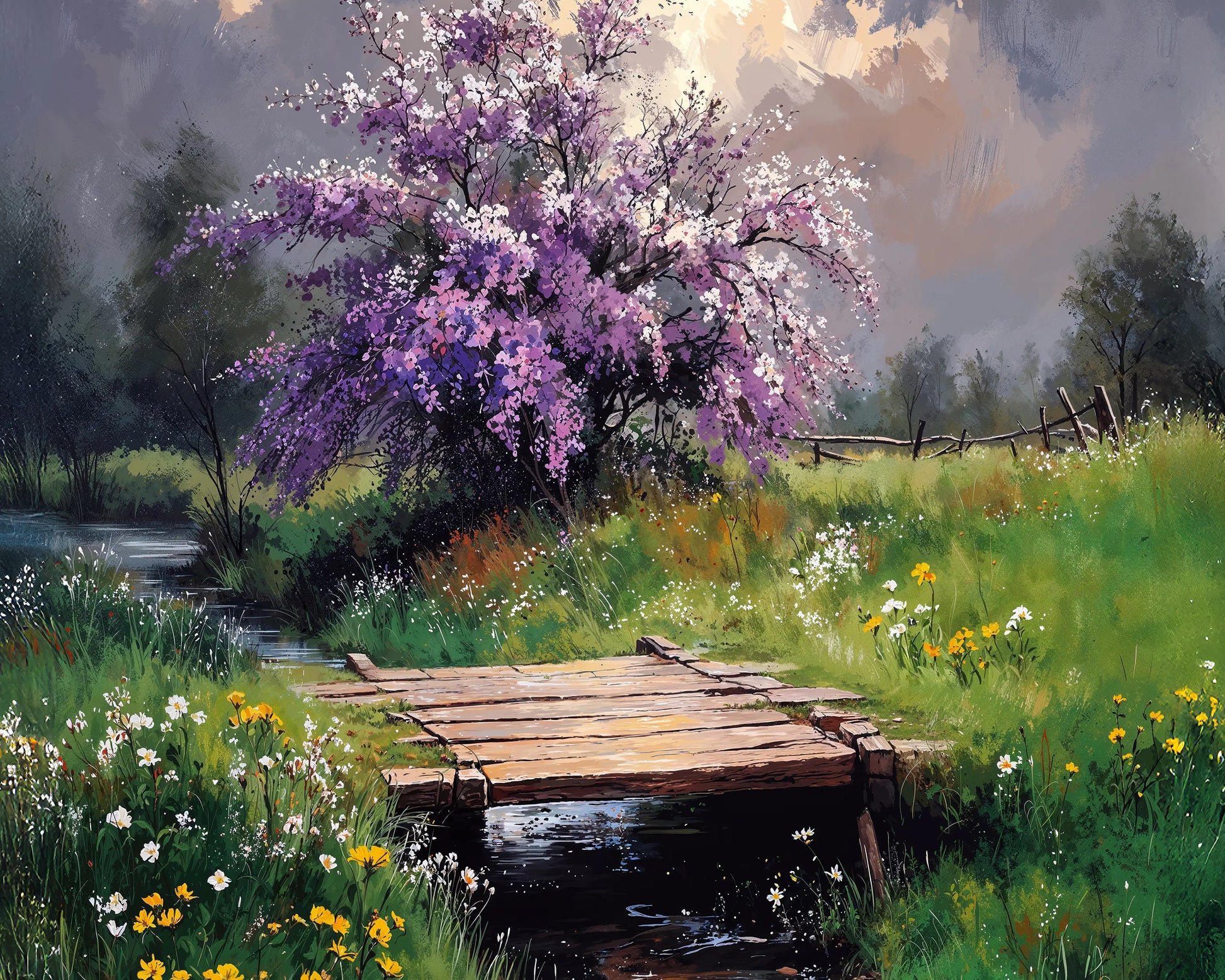Homeland captures the poetic calm of a spring countryside. A charming wooden footbridge spans a gentle stream, framed by a vibrant wildflower meadow and a blossoming cherry tree. The moody sky adds depth, balancing color with atmosphere.