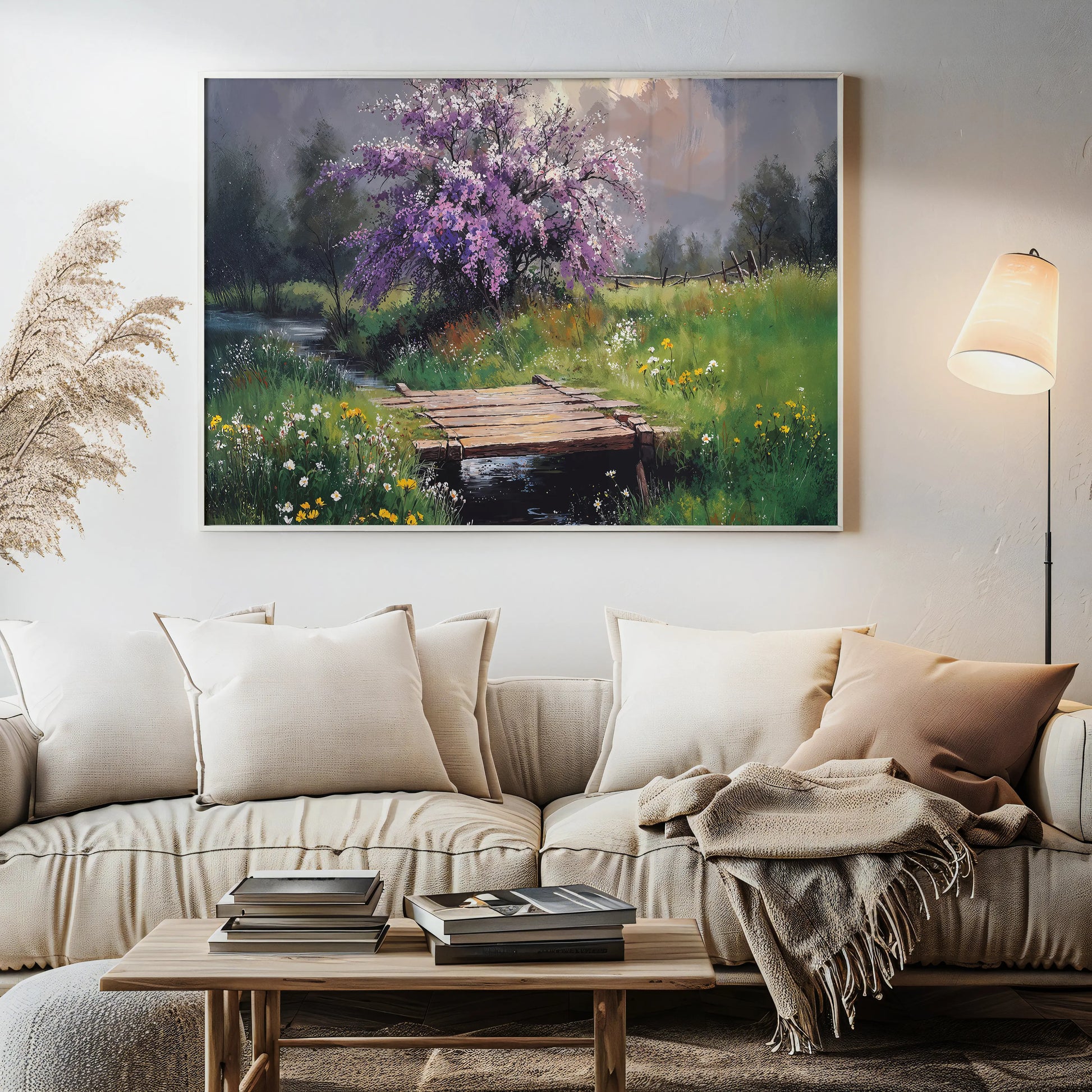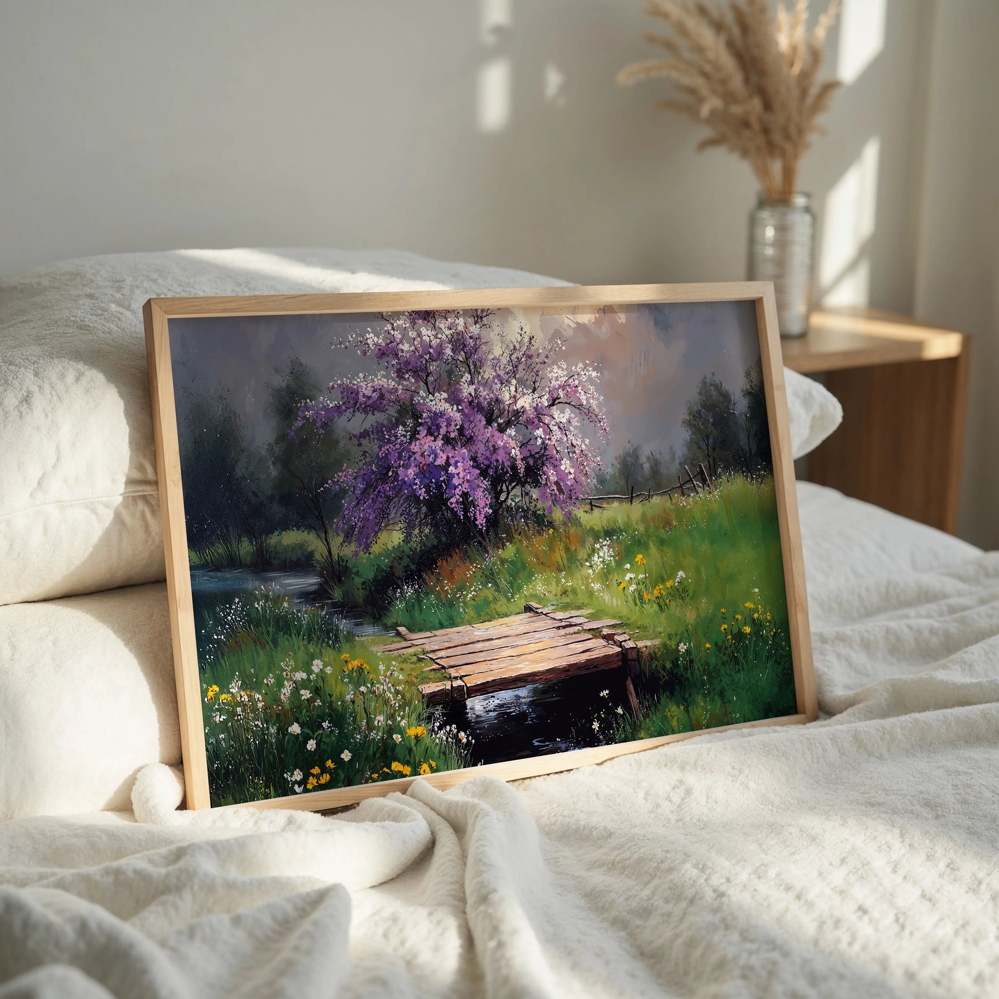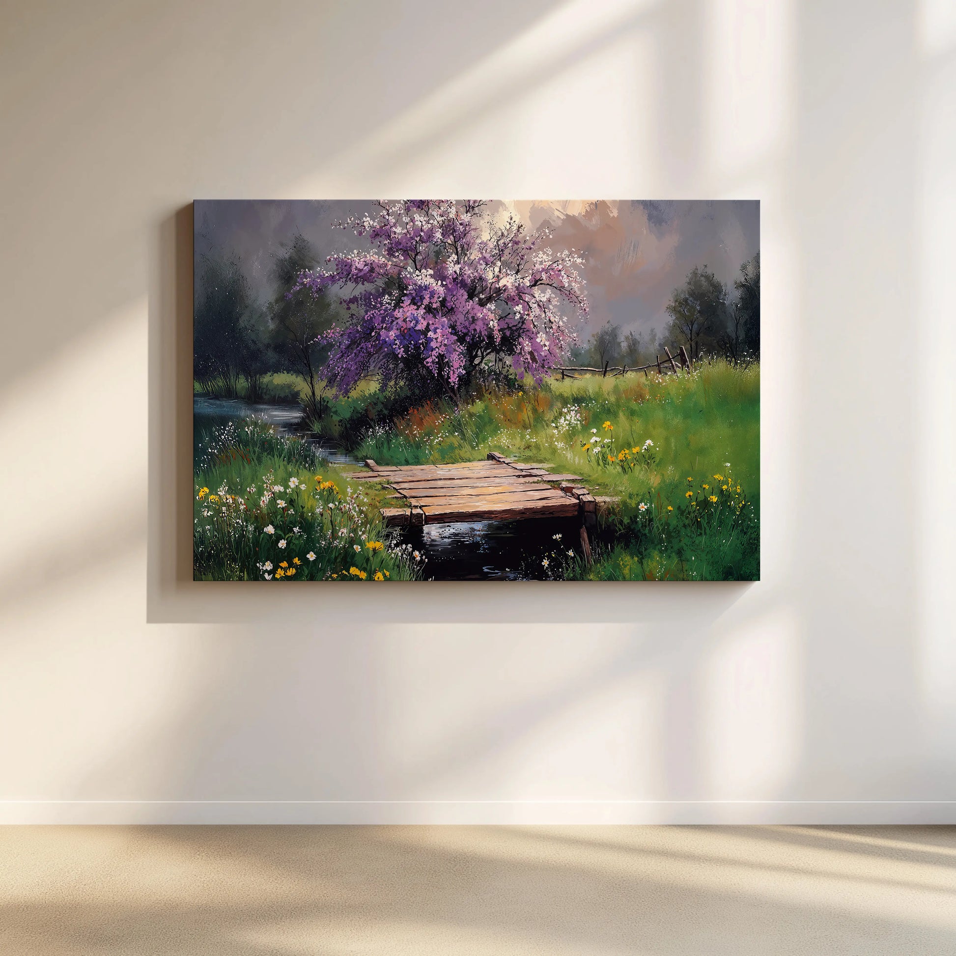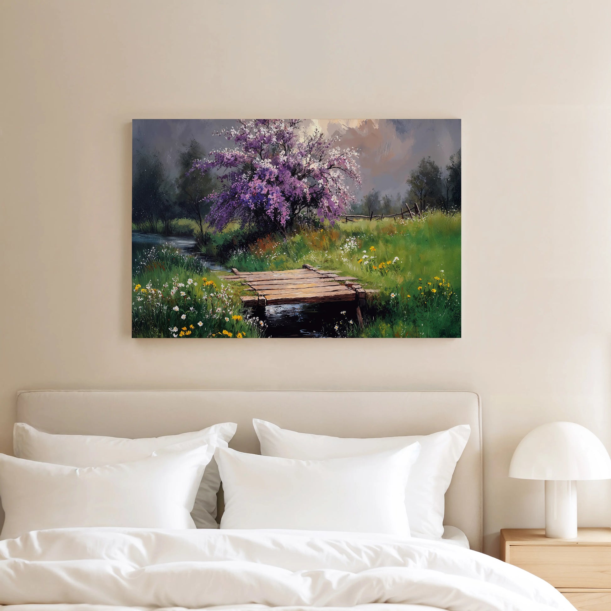 Printed on stretched canvas, this piece brings serenity and rustic beauty into any living space. Perfect for those who love peaceful landscapes and the gentle charm of spring.