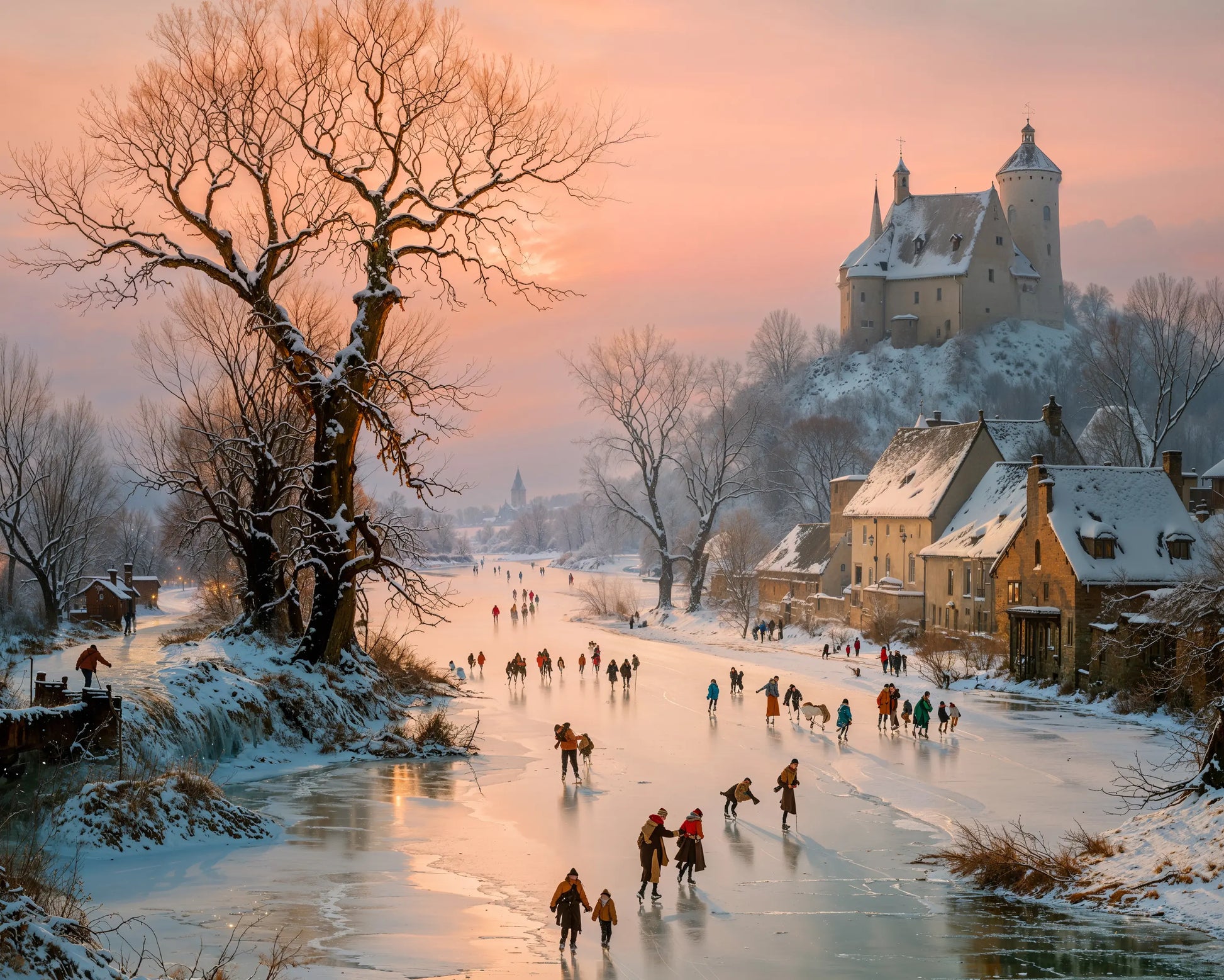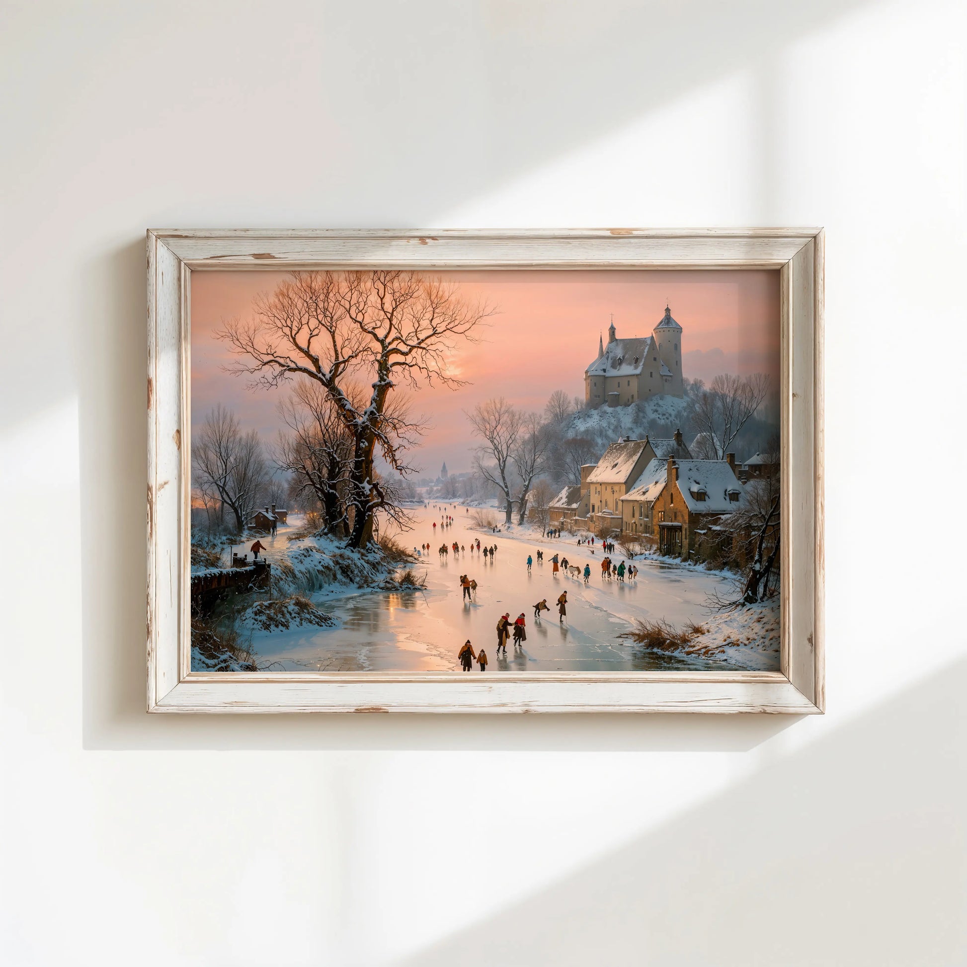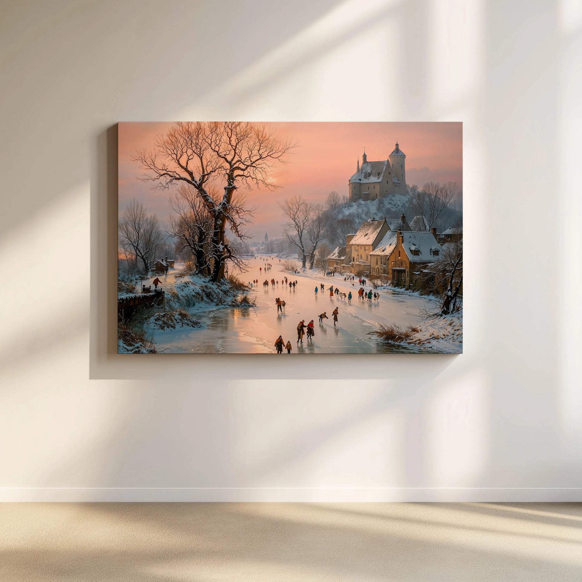 Ice Dance is a heartwarming winter scene capturing the magic of a frozen river at sunset. Villagers joyfully skate beneath a snow-covered hill crowned by a castle, surrounded by quaint homes and golden-pink skies. It’s a perfect blend of nostalgia, romance, and seasonal beauty.