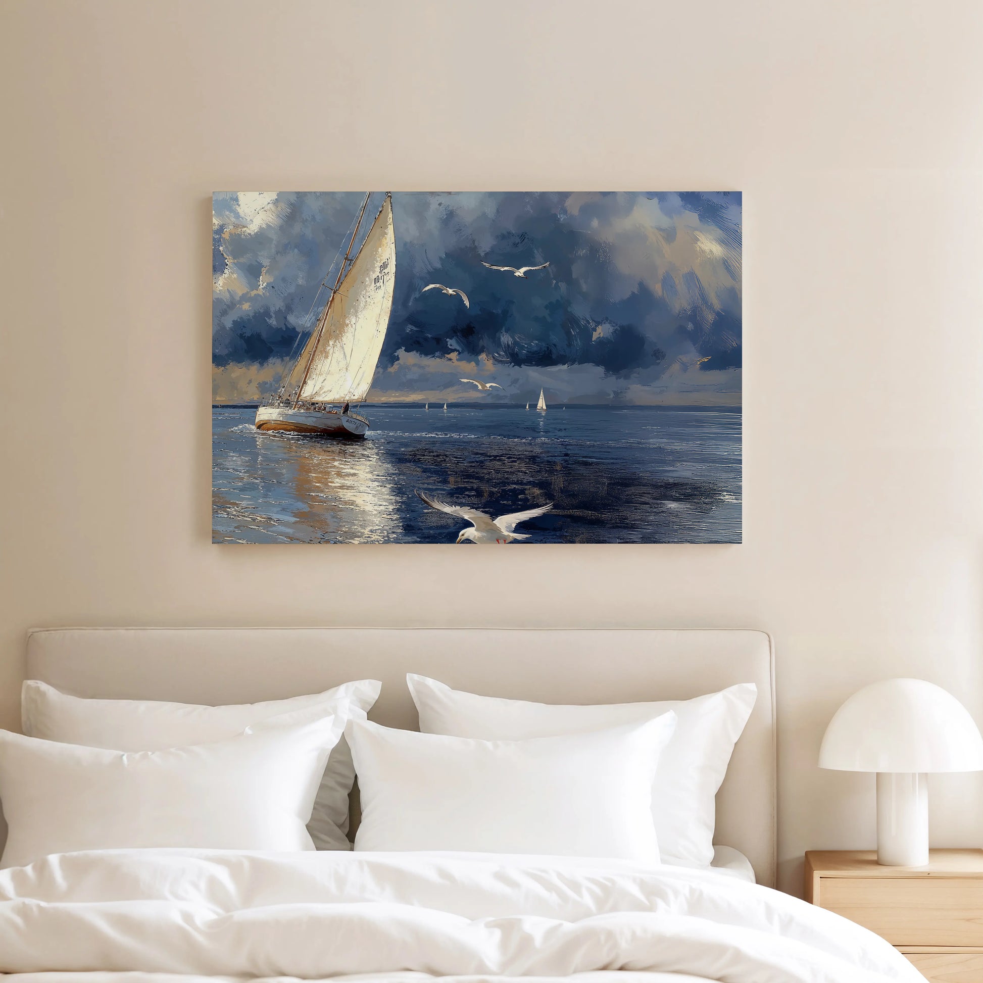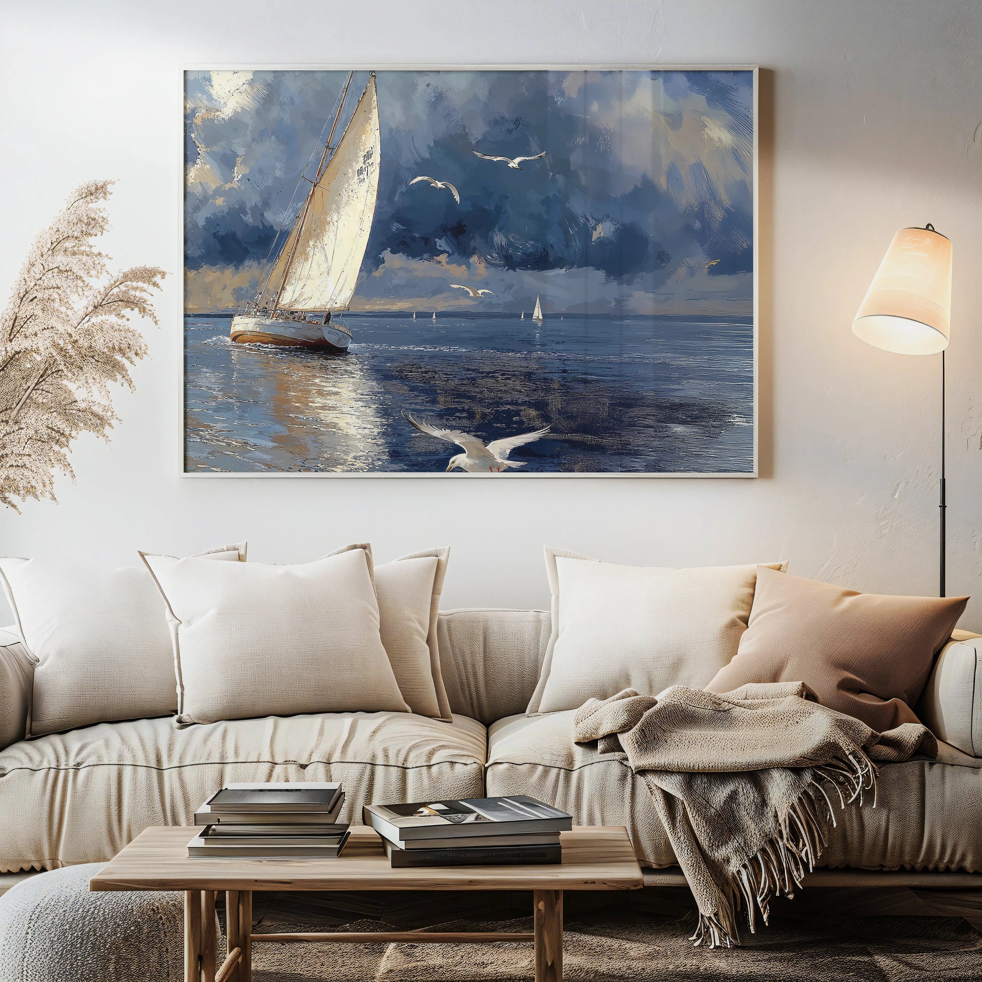 Momentum cuts cleanly through churning sea as Jonathan Livingston captures the charged breath before a tempest. The sail bows to wind’s will, while clouds swell above in moody contrast. Gulls flank the vessel like omens, and light fractures through shadowed skies—fleeting, yet fierce.