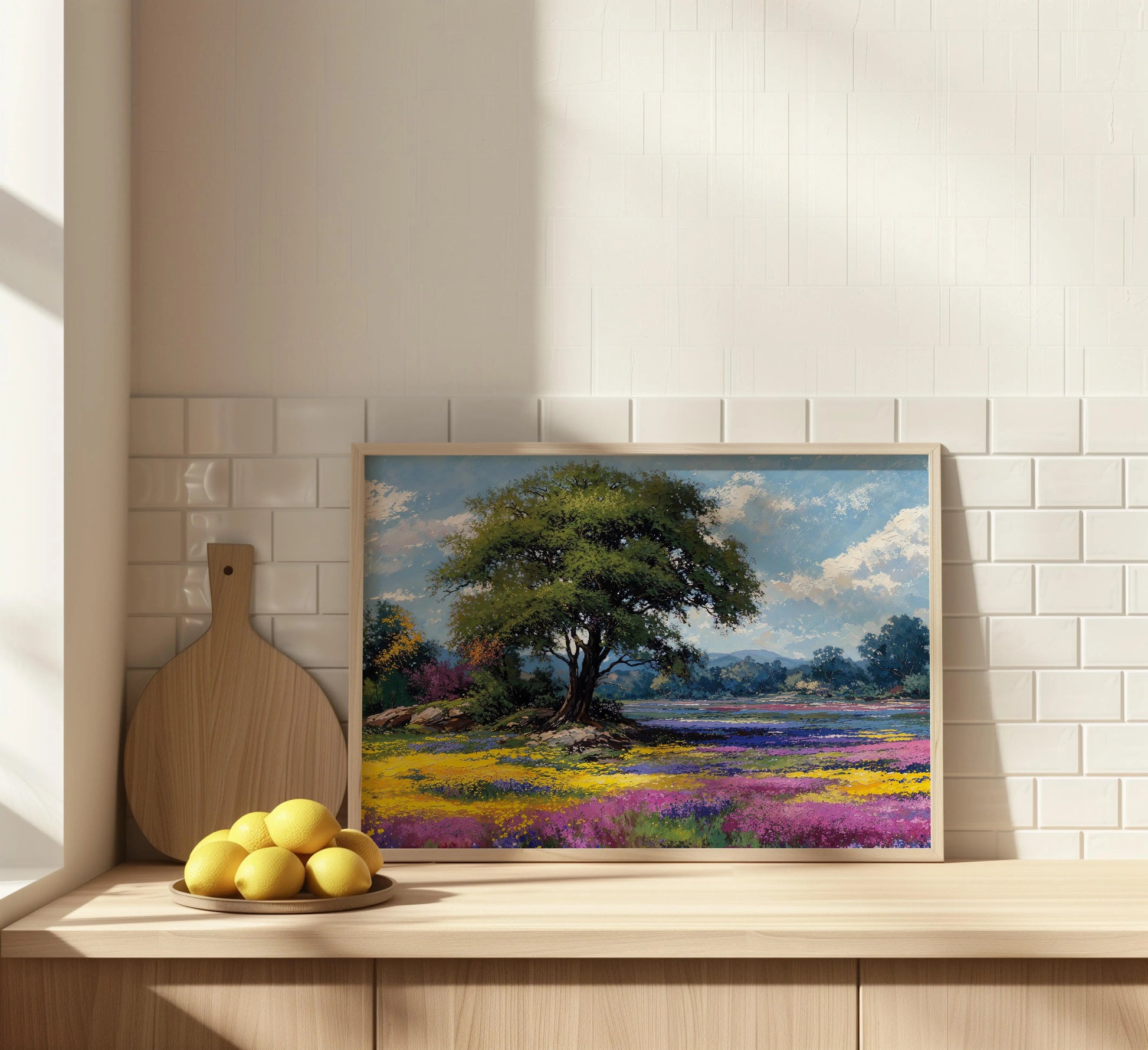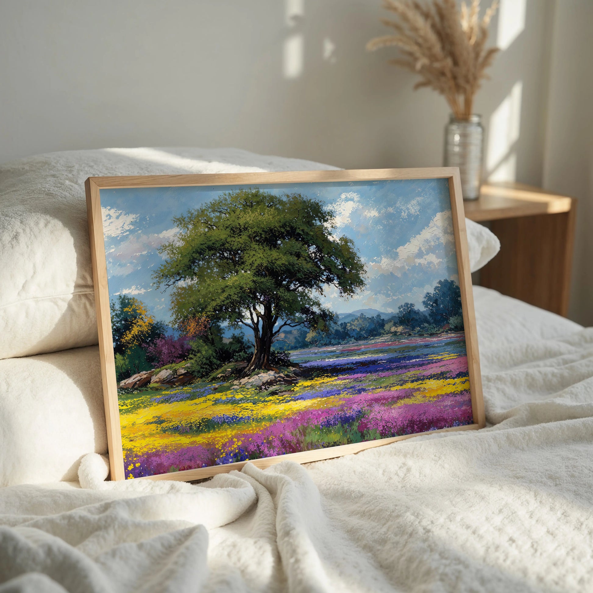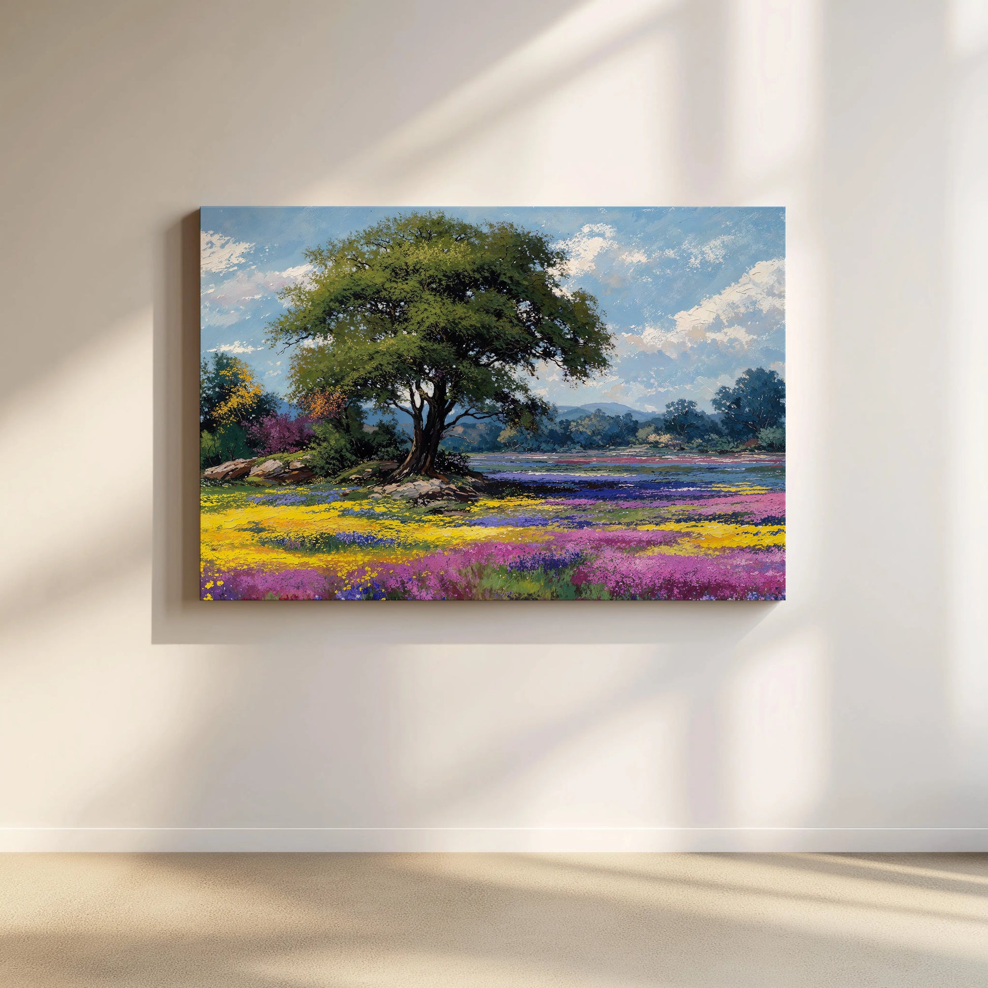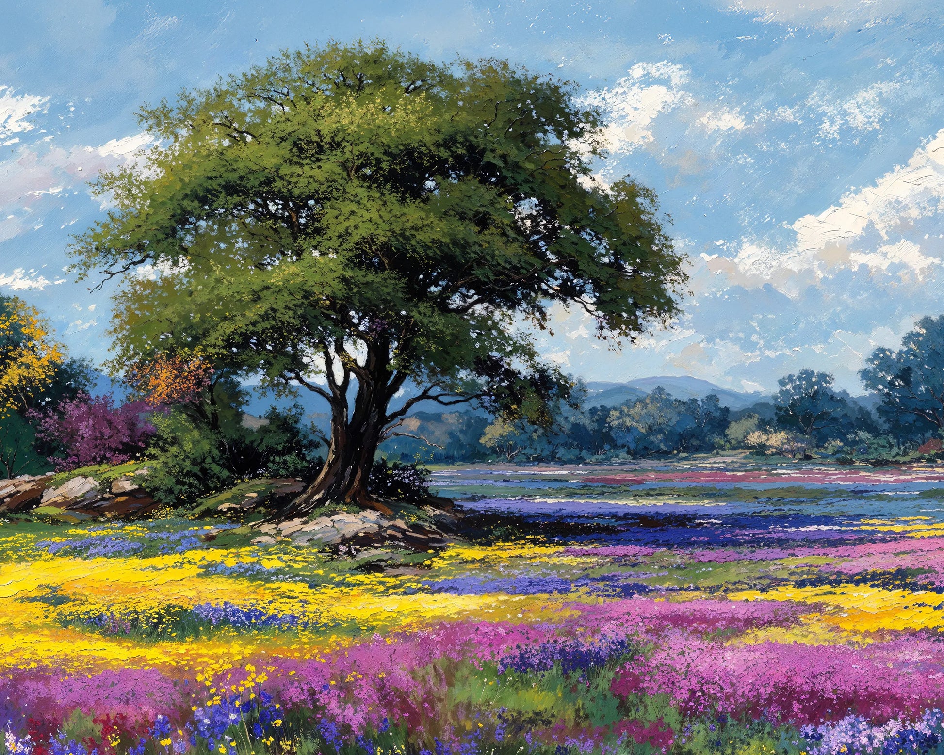 Knowing is a radiant celebration of spring’s full bloom. At the center stands a majestic tree, rooted in serenity, while fields of yellow, purple, and magenta wildflowers stretch endlessly across the scene. Rolling hills and a soft blue sky complete the tranquil composition.