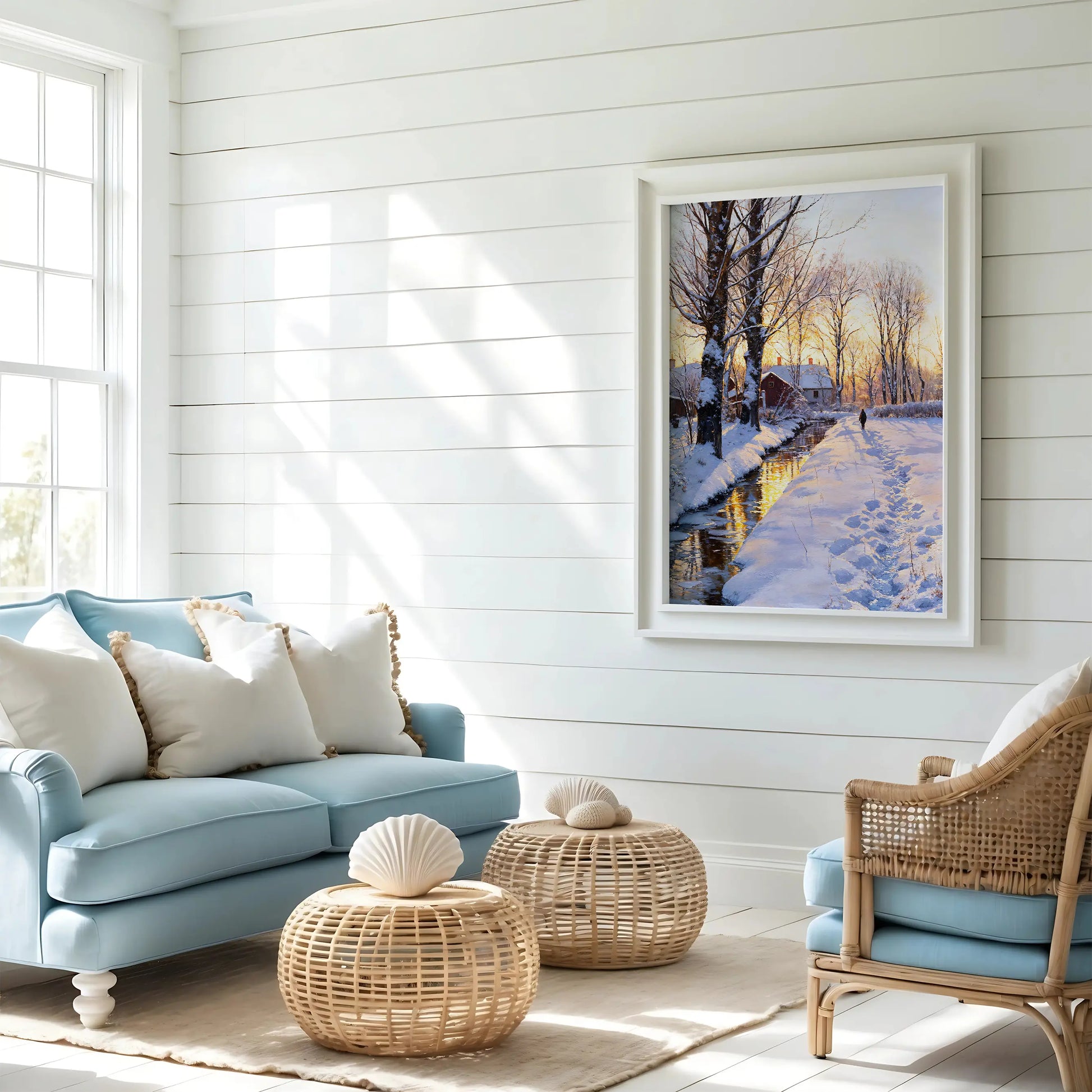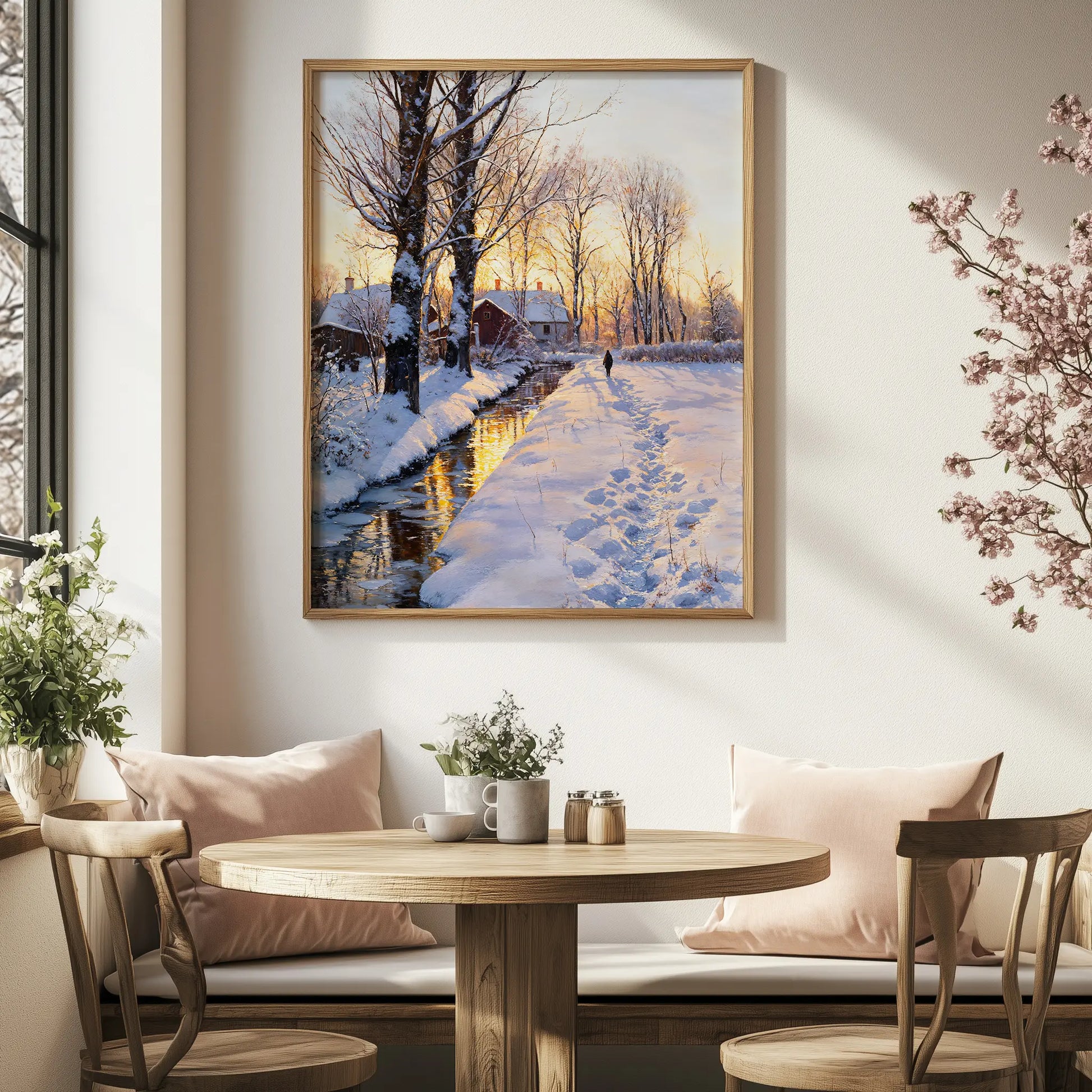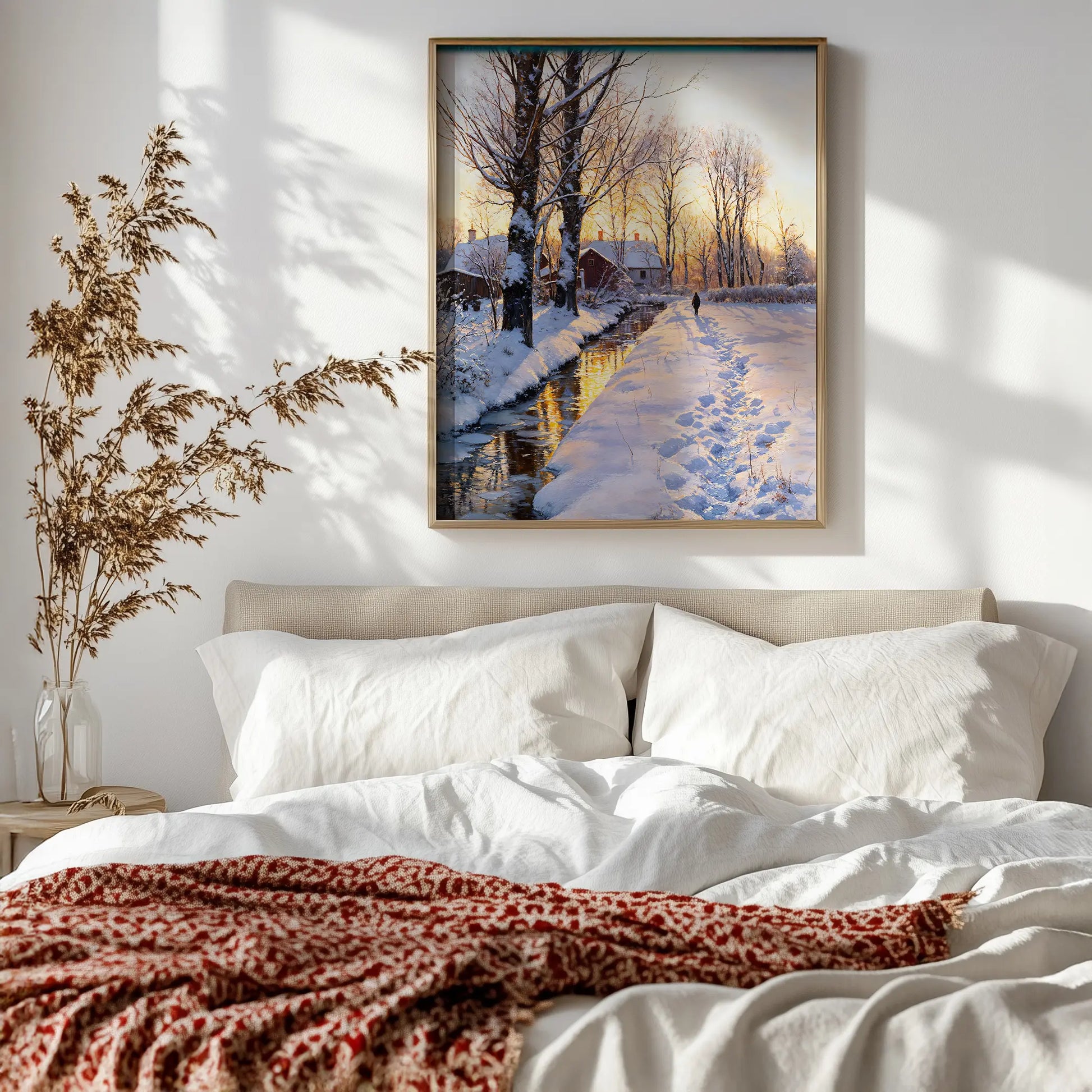 Last Light II is a portrait of farewell and peace — the fleeting moment when the sun’s final warmth brushes the snow with gold. A narrow stream mirrors the sky’s glow, while a single traveler follows a winding path through the quiet fields.
