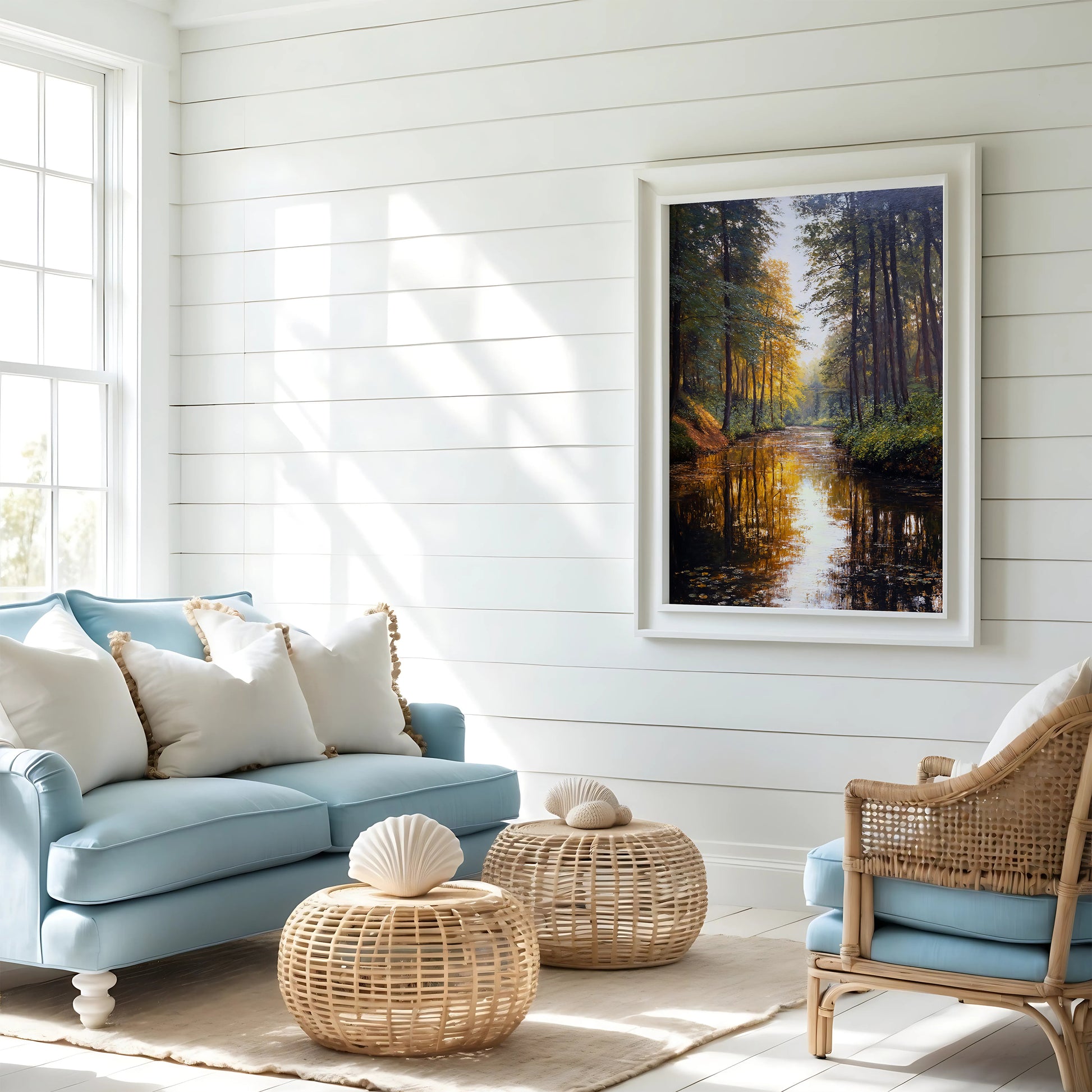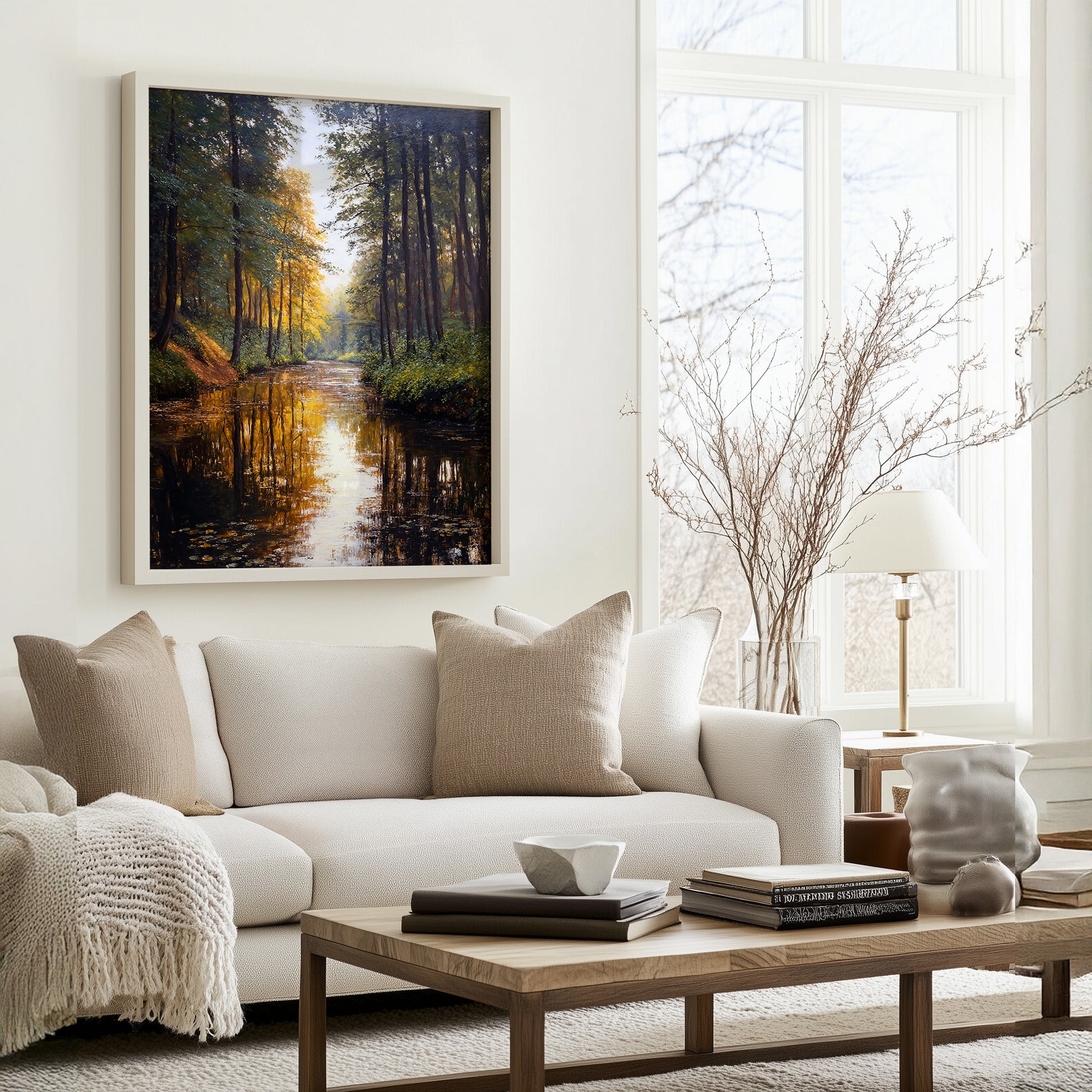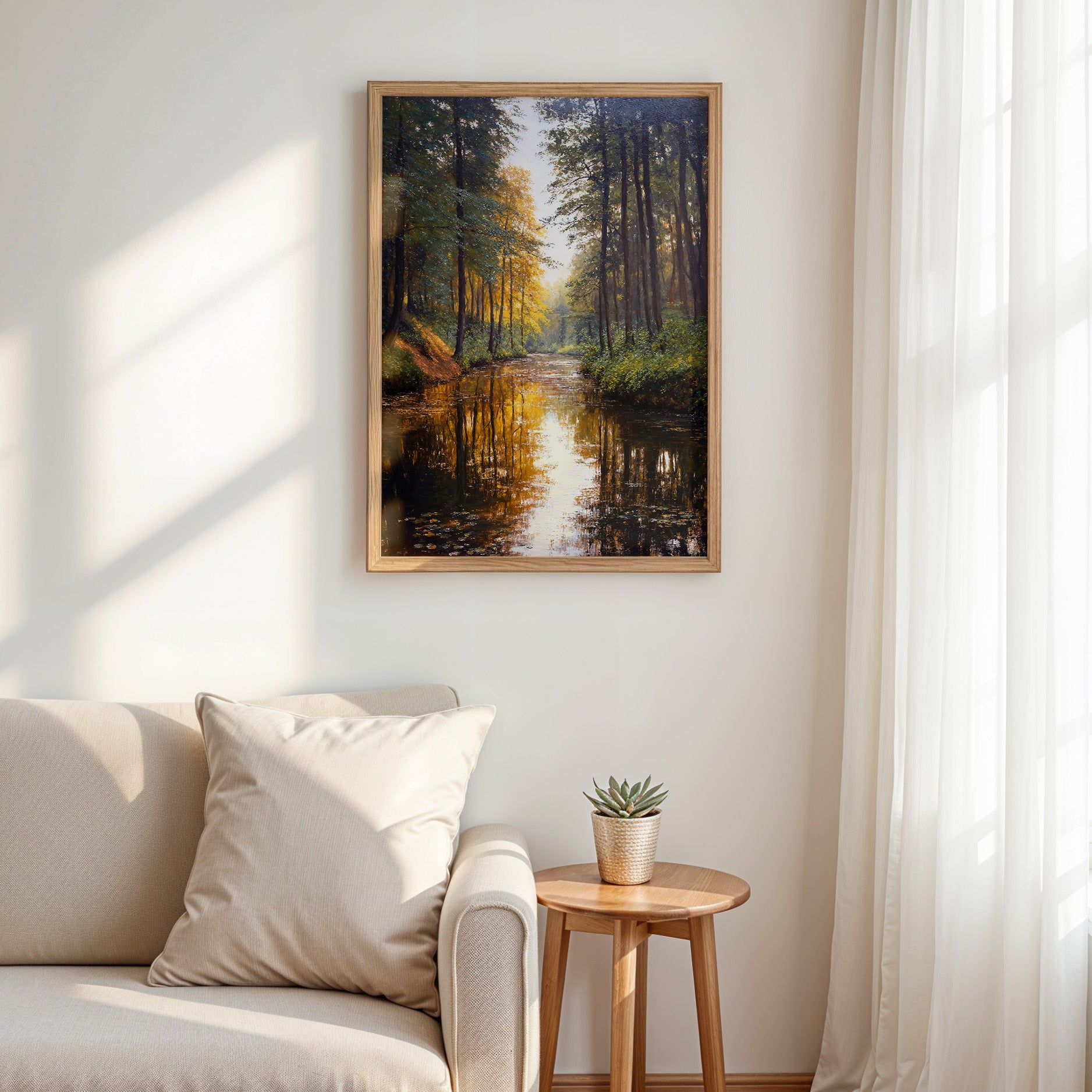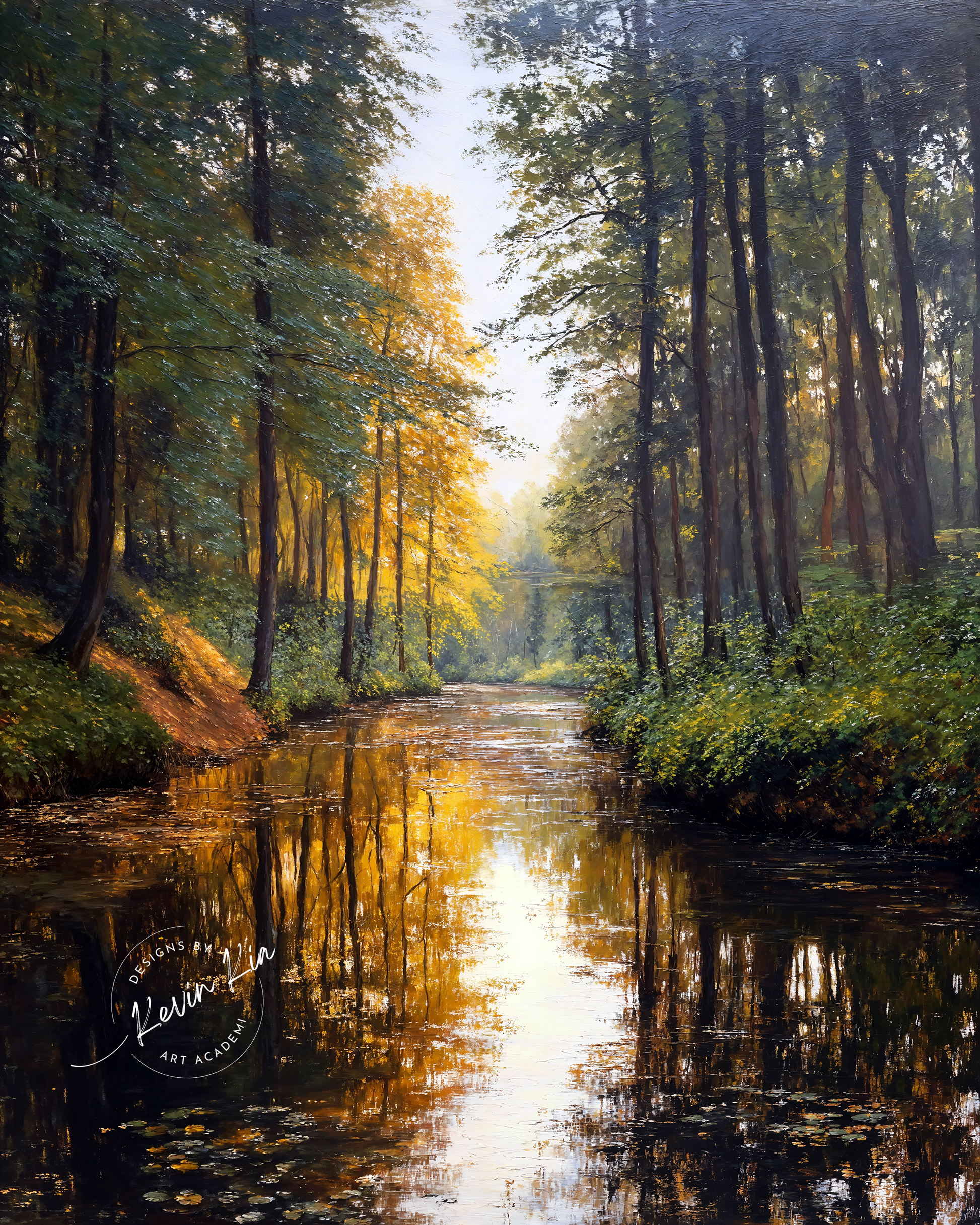 Light & Shadow captures a serene woodland river, where warm sunlight filters through towering trees and reflects across the still water's surface. The contrast of bright golden tones against soft shadows creates a natural balance that feels both peaceful and profound.