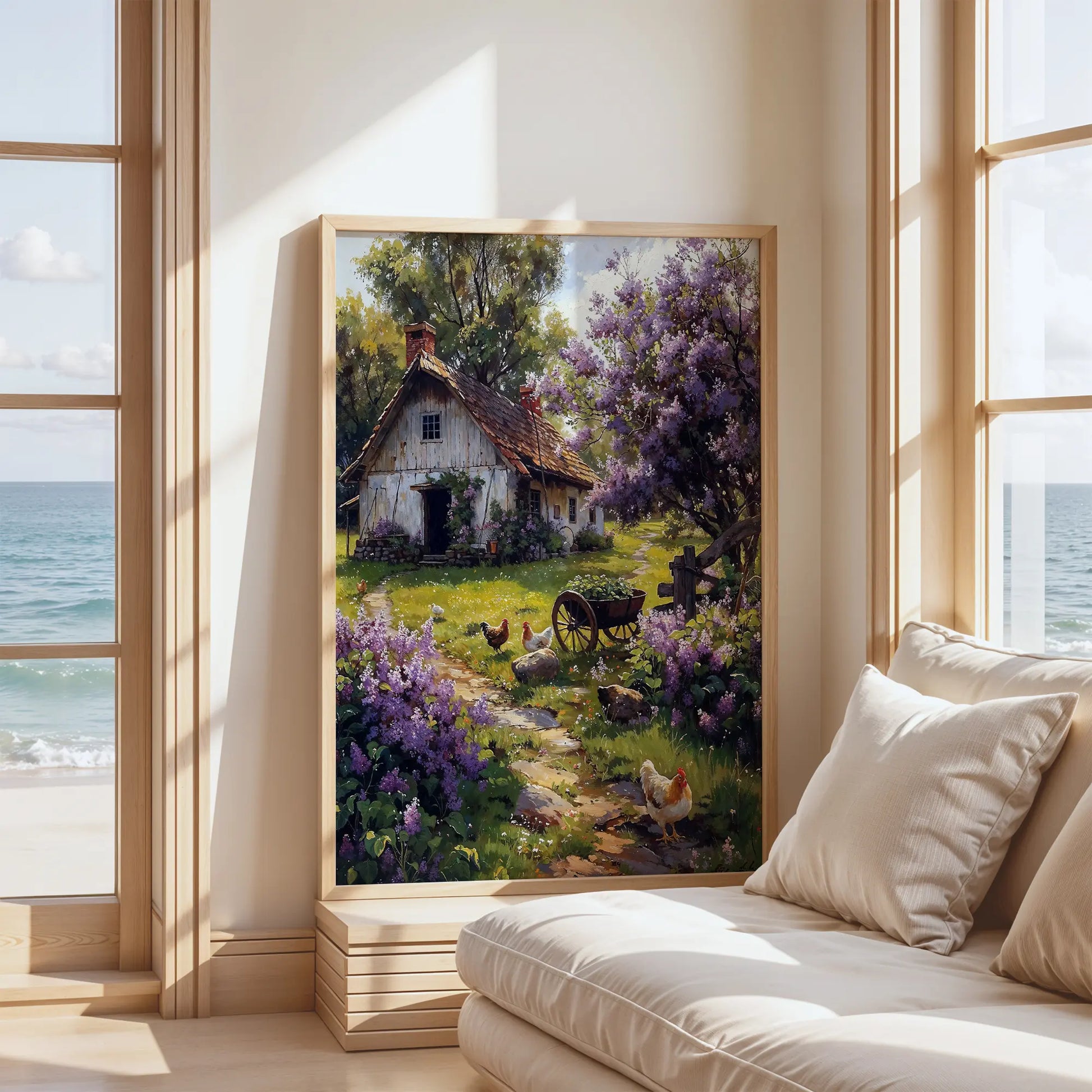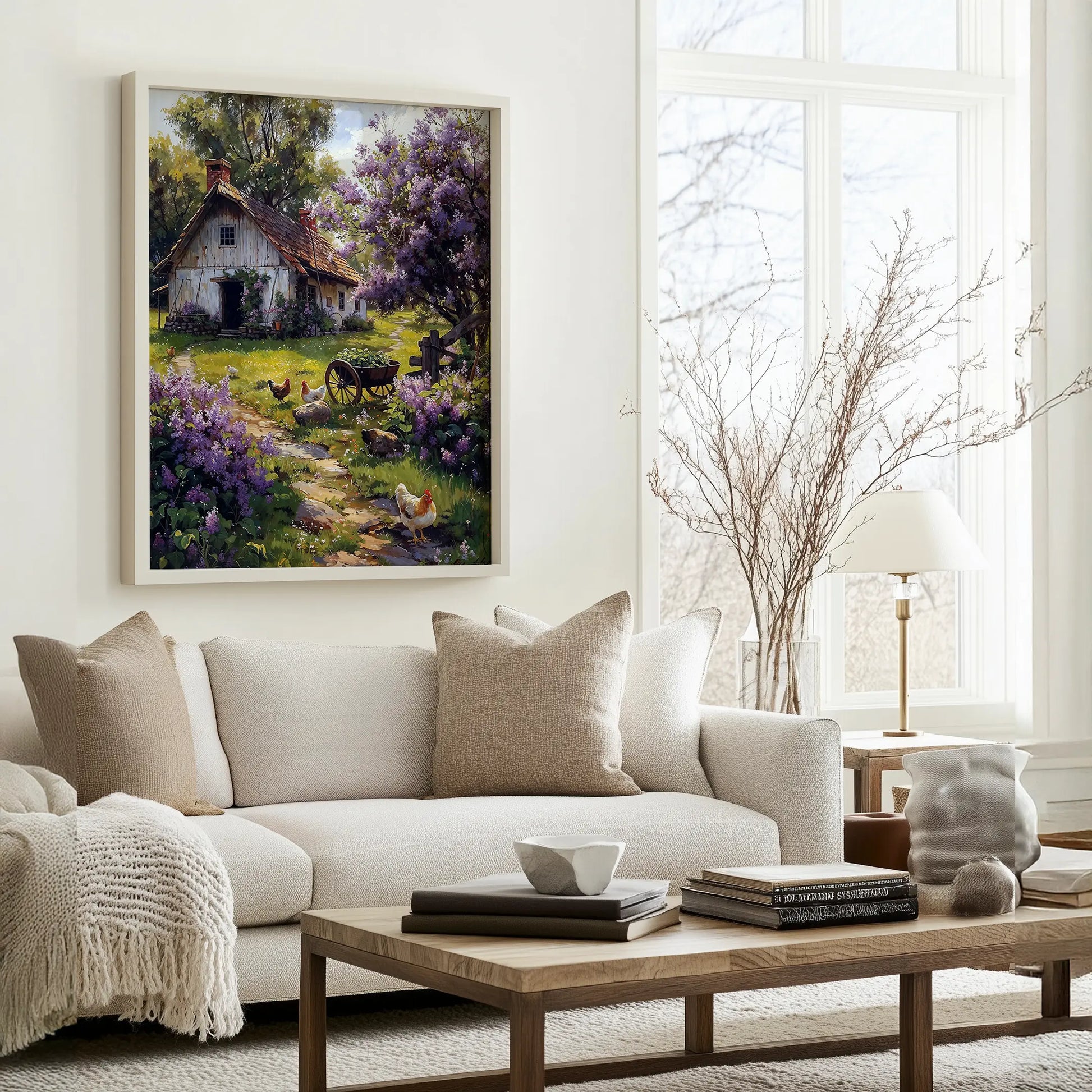 Lilac radiates serenity through a delicate interplay of texture and color harmony. Early light spills like a translucent wash across the landscape, softening every edge of the rustic farmhouse and the weatherworn cart. Lilacs burst in painterly clusters, rendered with controlled impasto, giving their blooms a sculptural tenderness that almost vibrates with scent and memory.