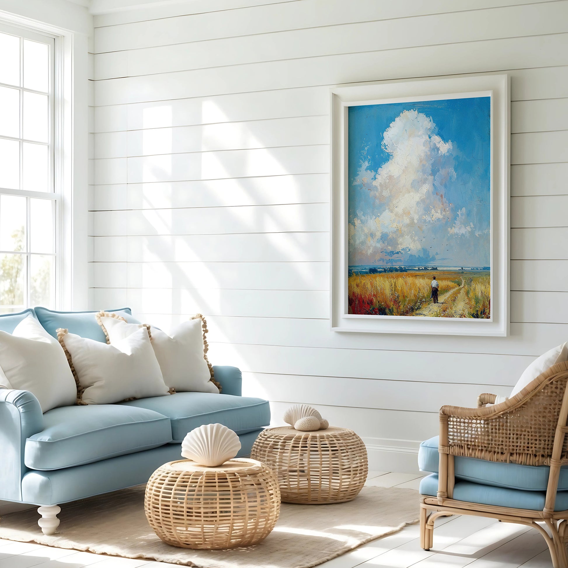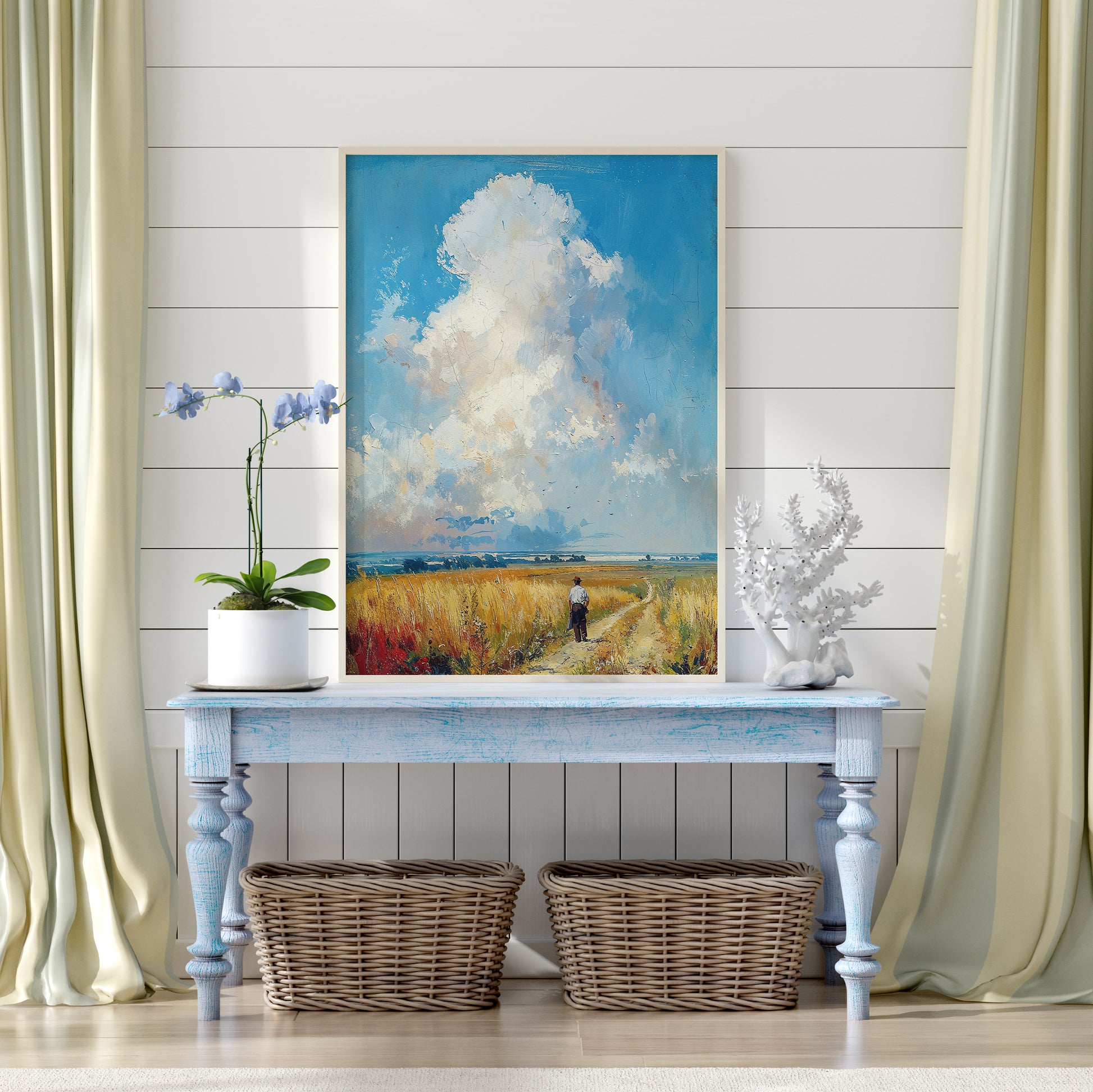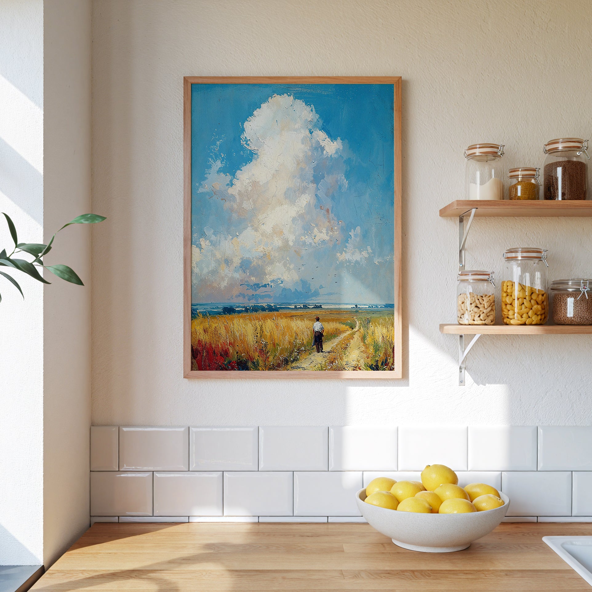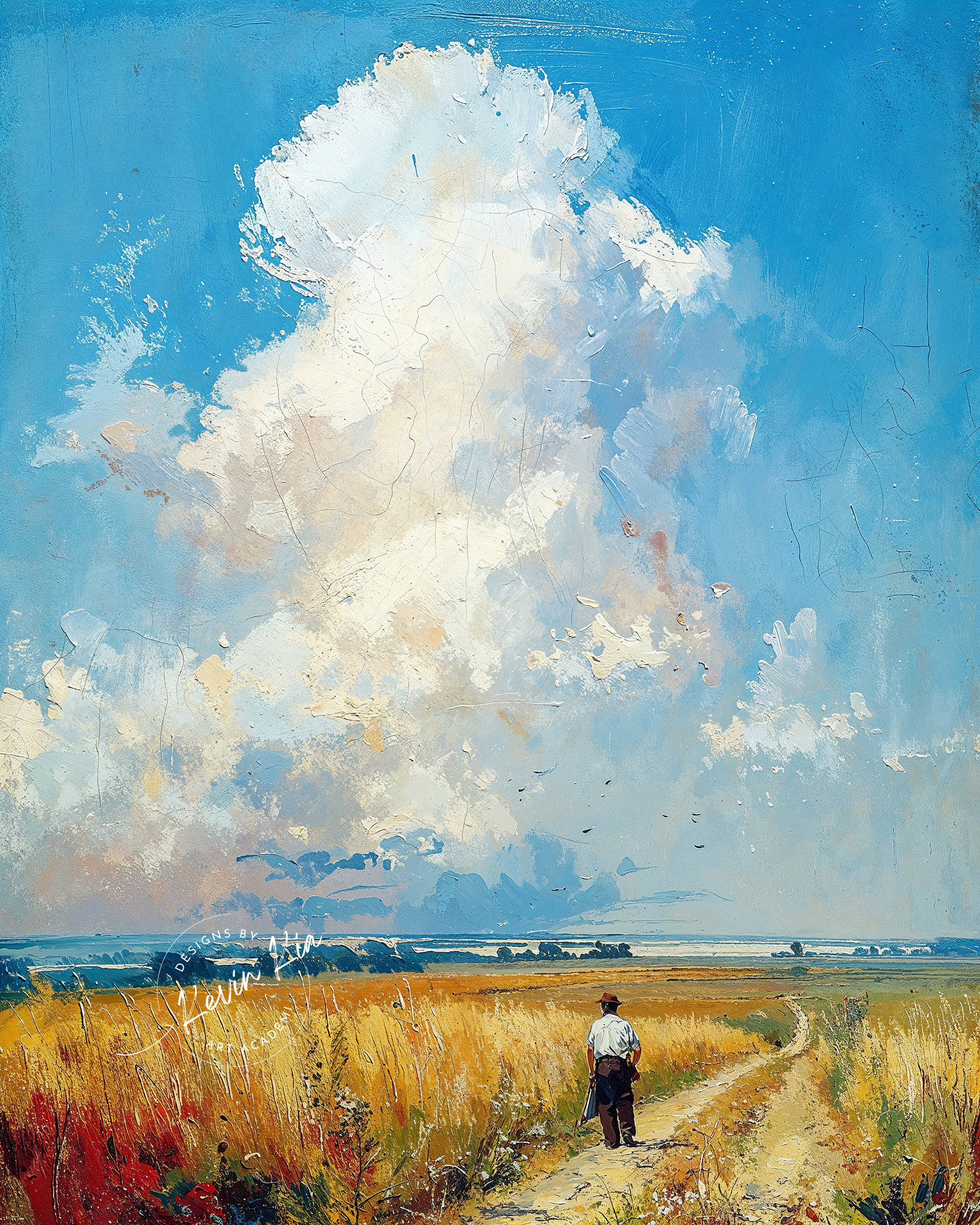 Limitless evokes stillness in motion—a lone figure treading a sunlit trail beneath a towering cloud bank, where earth meets sky in hushed harmony. Golden fields stretch endlessly, defined by scumbled brushwork that builds both texture and air into the grass. Light filters down gently, caught in each soft stroke of ochre and sienna.