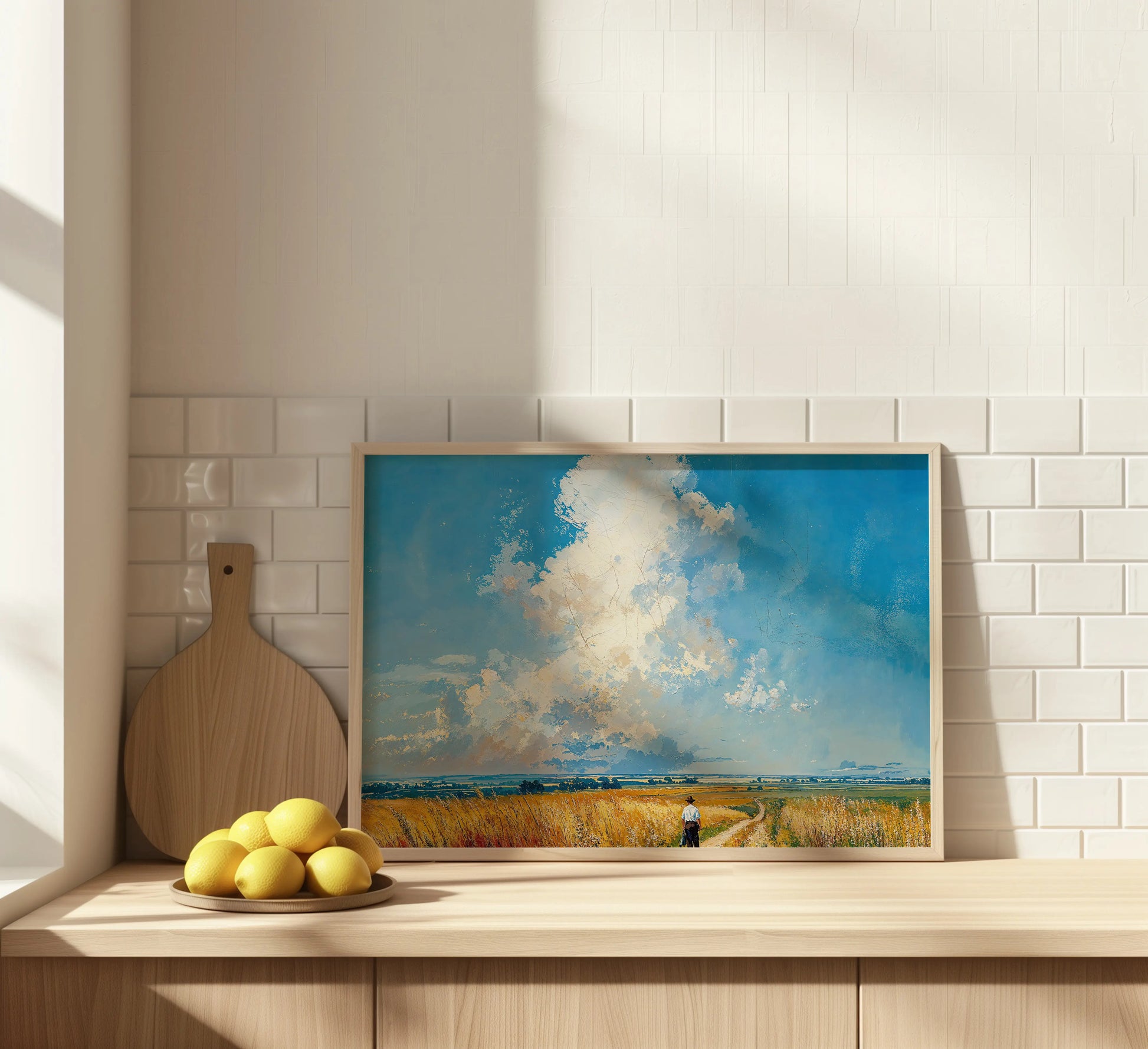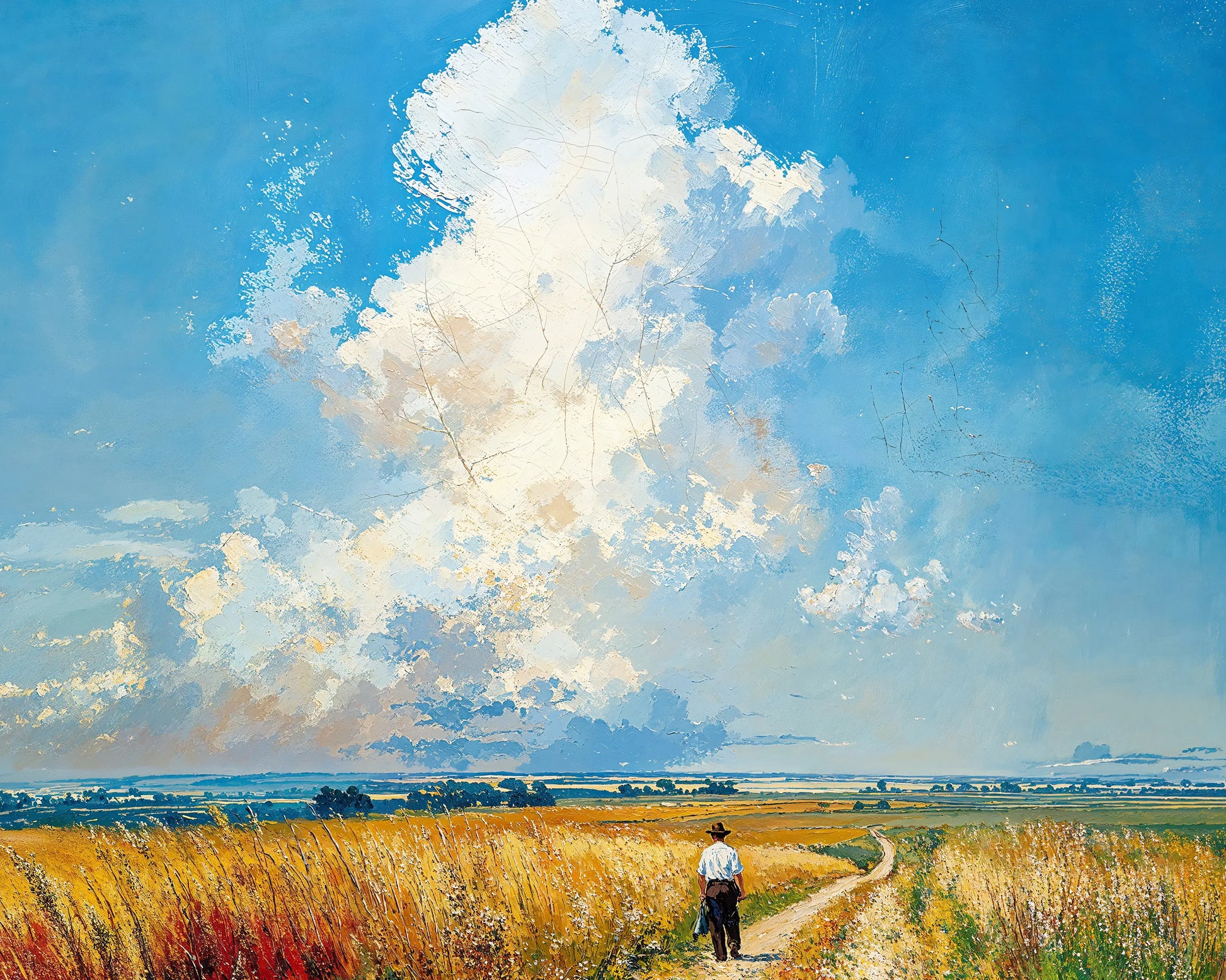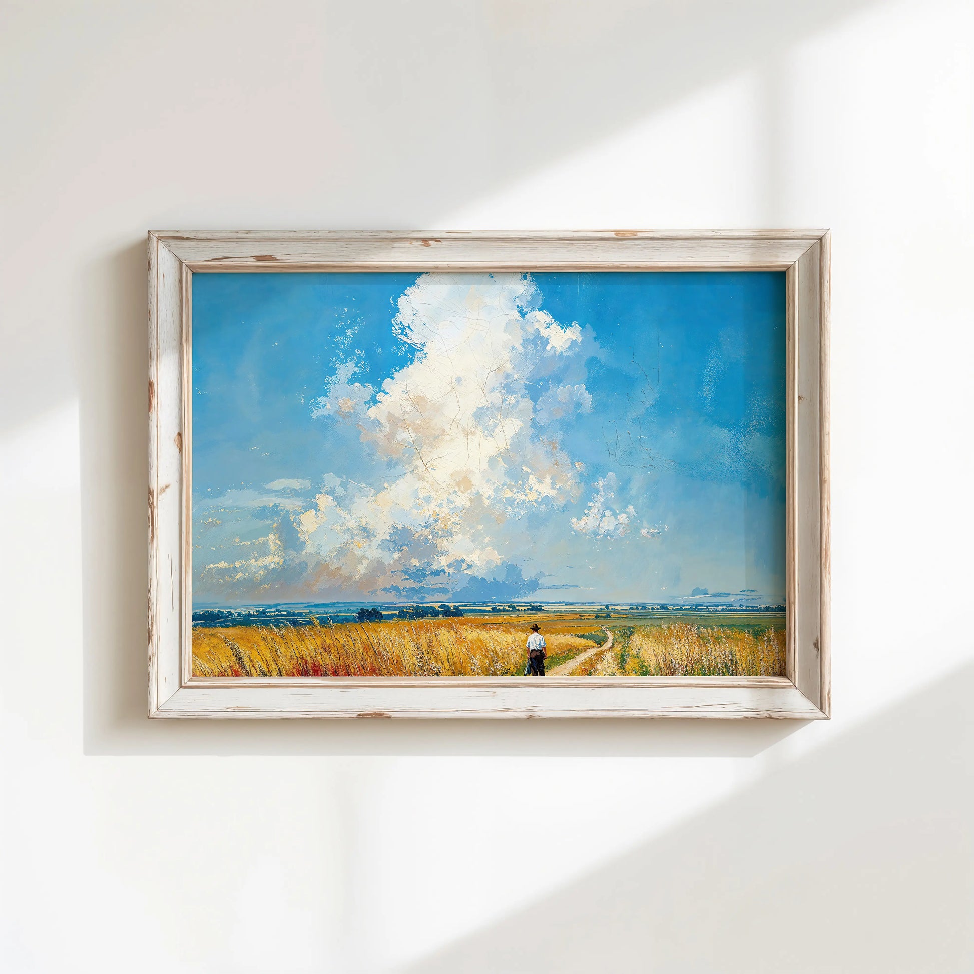 Limitless captures the quiet power of a summer afternoon—a lone figure walking a winding dirt path through golden fields beneath a breathtaking sky.