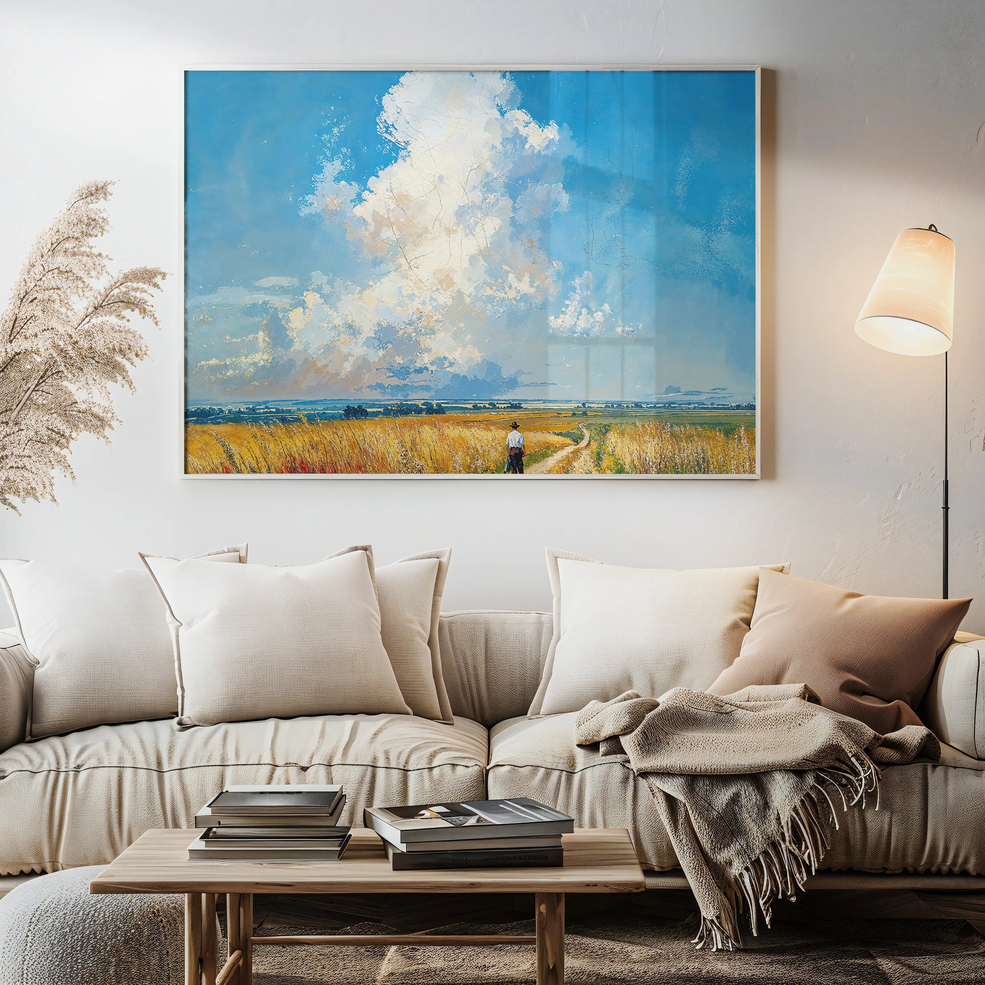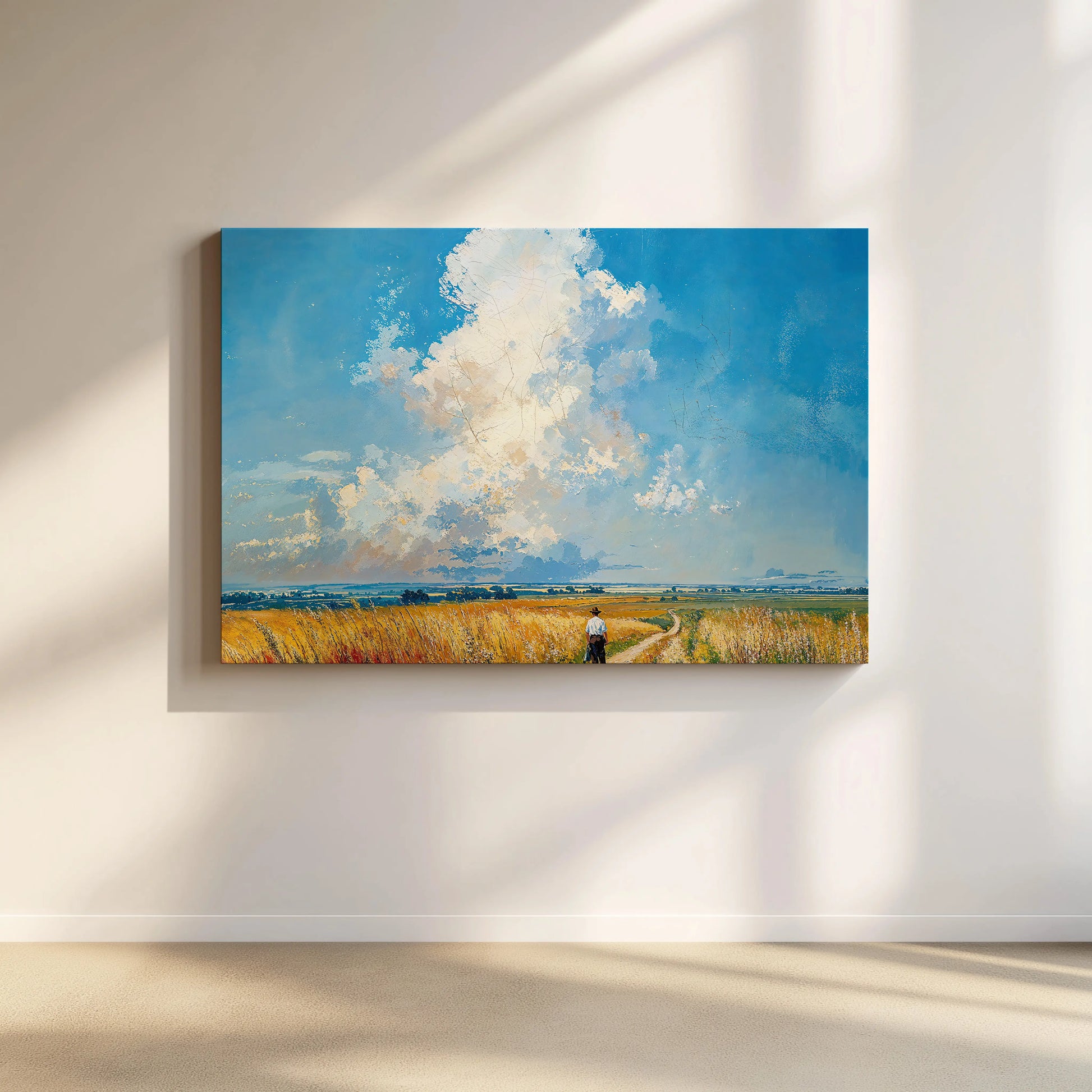 This stretched canvas print celebrates the human connection to the land and sky, perfect for those drawn to minimalist beauty, rural serenity, and introspective scenes—a stunning addition to any living room, study, or hallway.