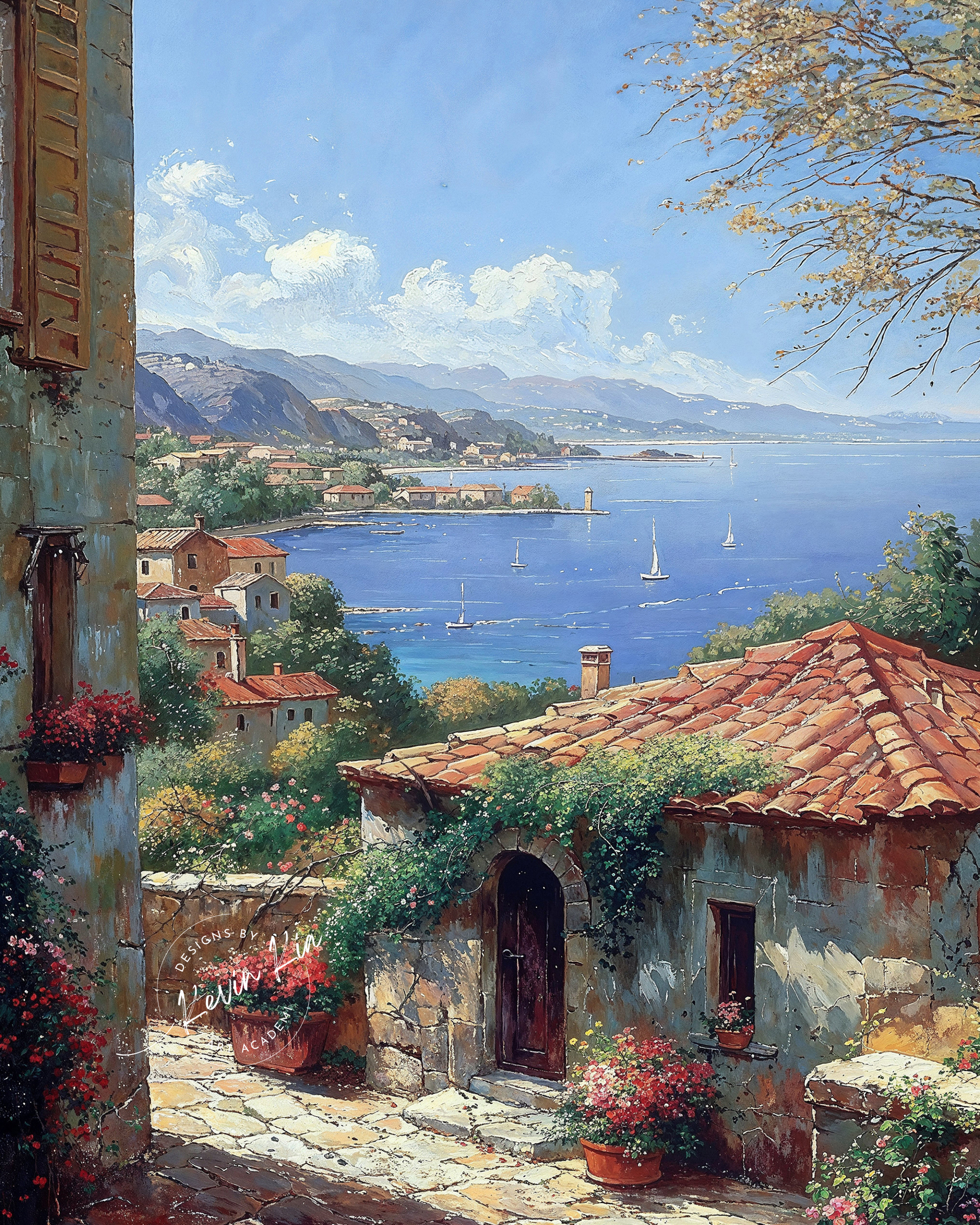 Mediterranean Bloom unfolds along a stone path overlooking the sea, where terracotta roofs meet flowering vines and the coastline curves like a quiet sigh. Beyond the arched doorway, light scatters across potted blooms, and sailboats drift across a cobalt bay that stretches toward distant hills.