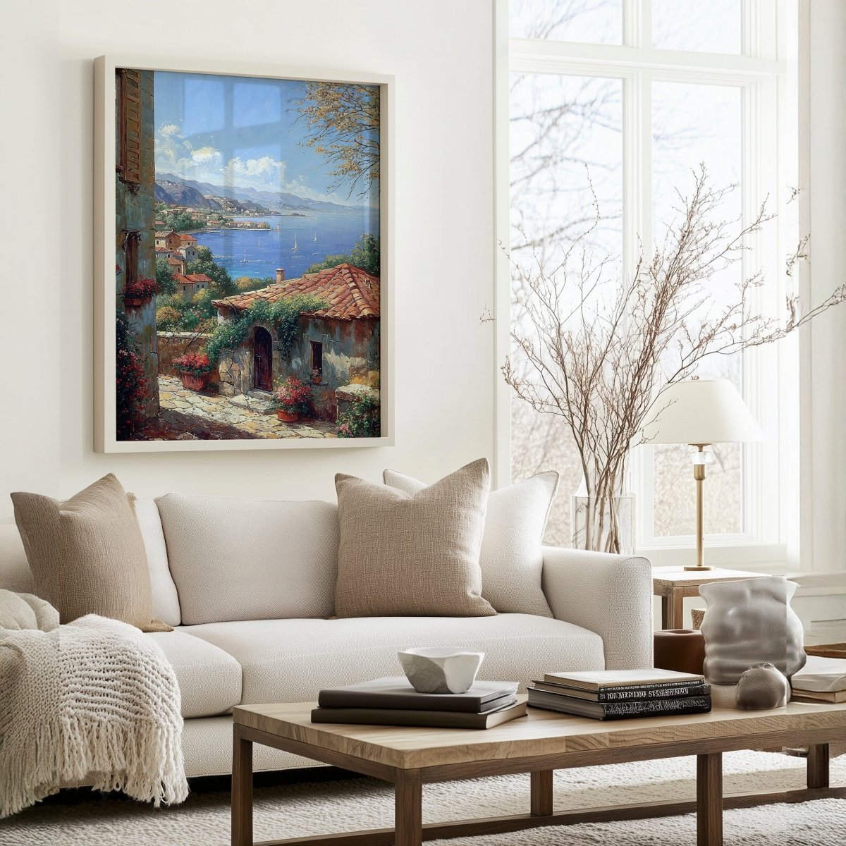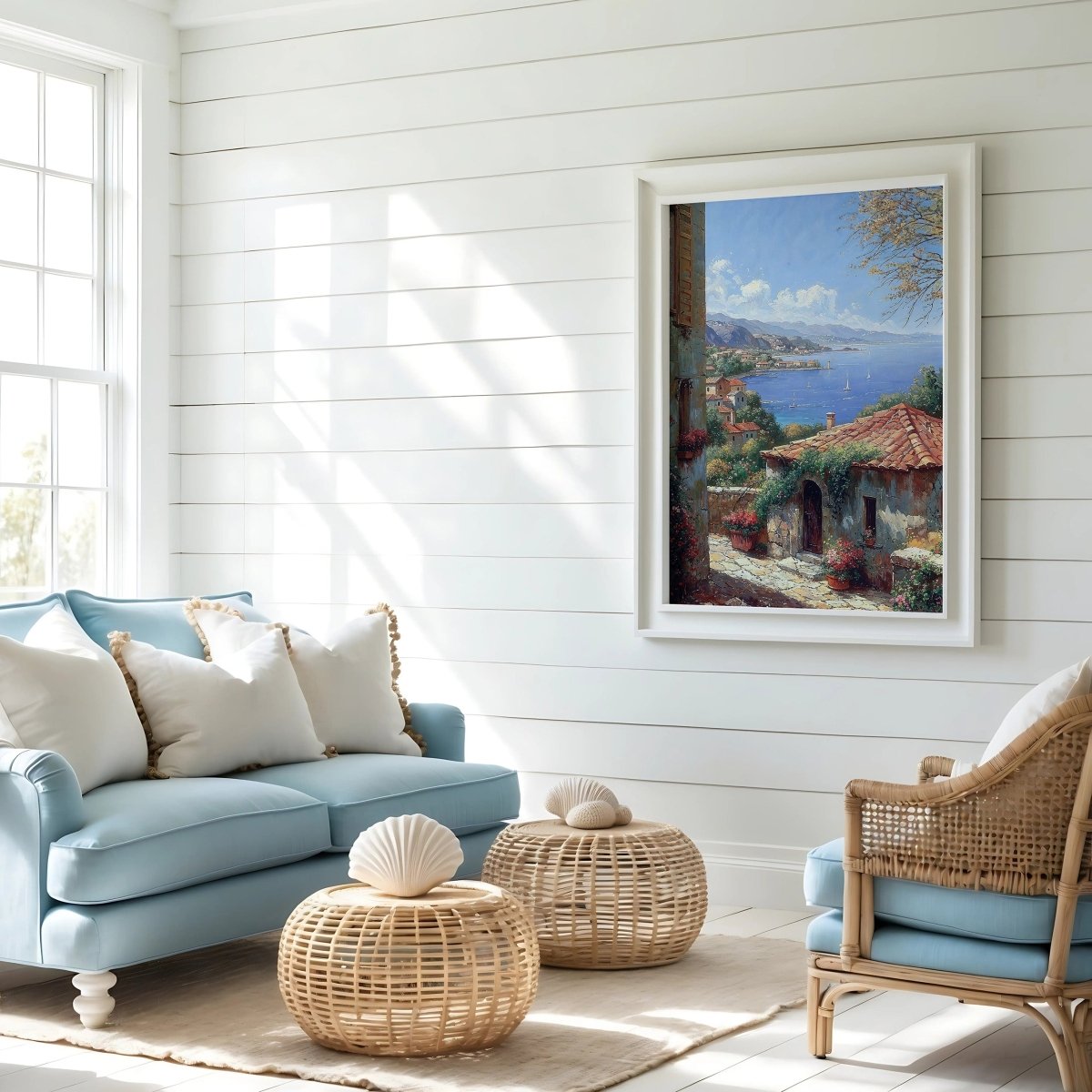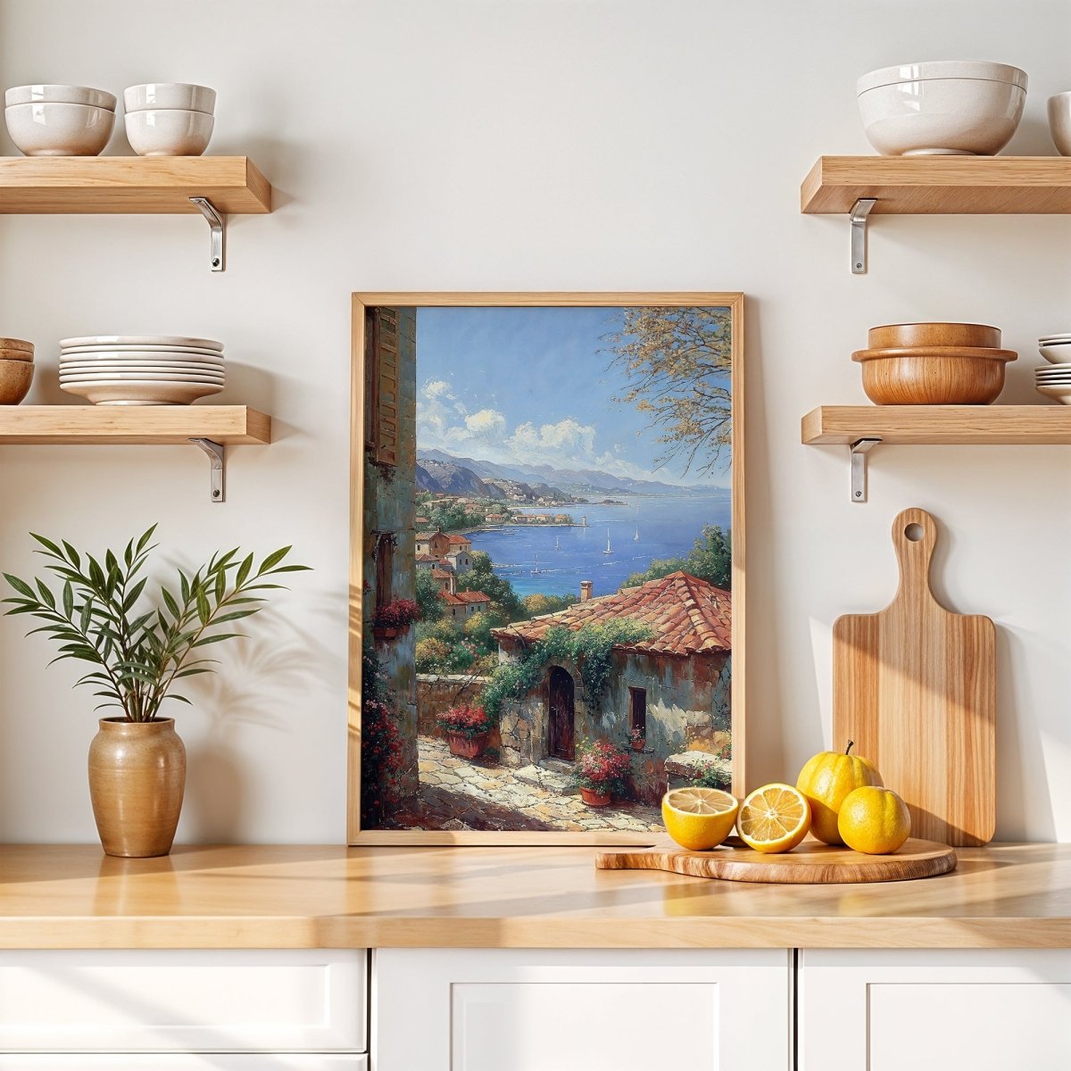 Designed for Mediterranean kitchens, coastal bedrooms, sunlit stairwells, or vacation homes, the artwork delivers more than ambiance—it brings place. A breeze made visible. A scent remembered. A quiet that hums like warmth on stone.