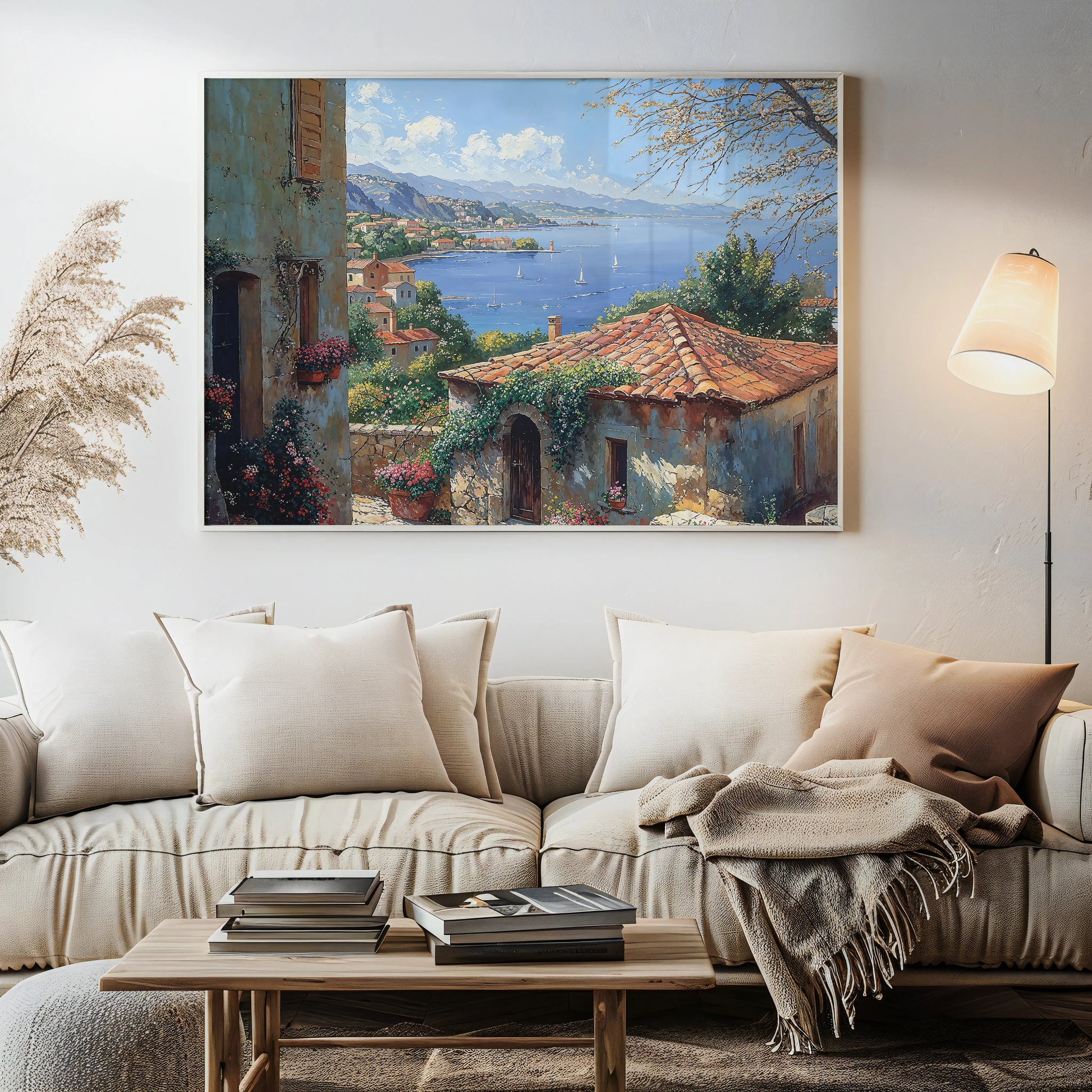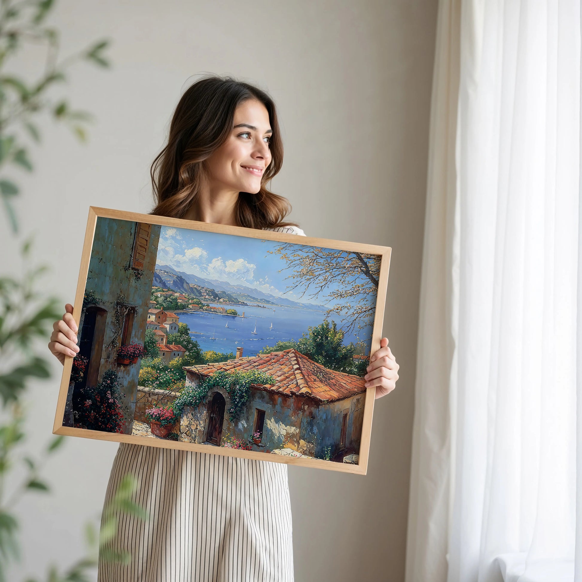 Designed for Mediterranean kitchens, coastal bedrooms, sunlit stairwells, or vacation homes, the artwork delivers more than ambiance—it brings place. A breeze made visible. A scent remembered. A quiet that hums like warmth on stone.