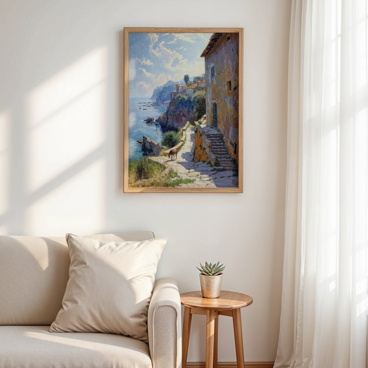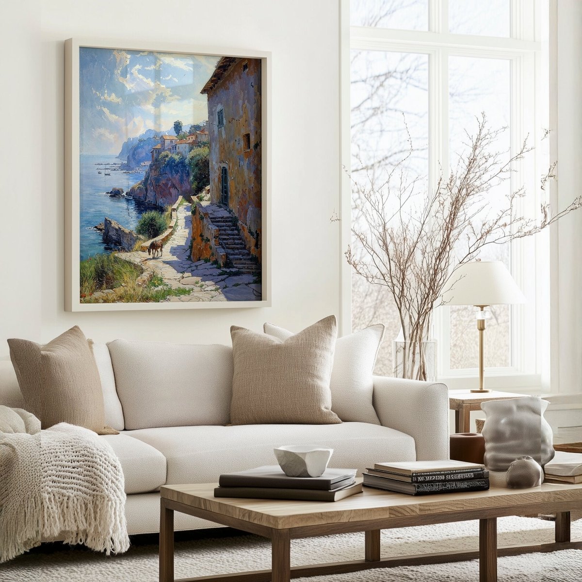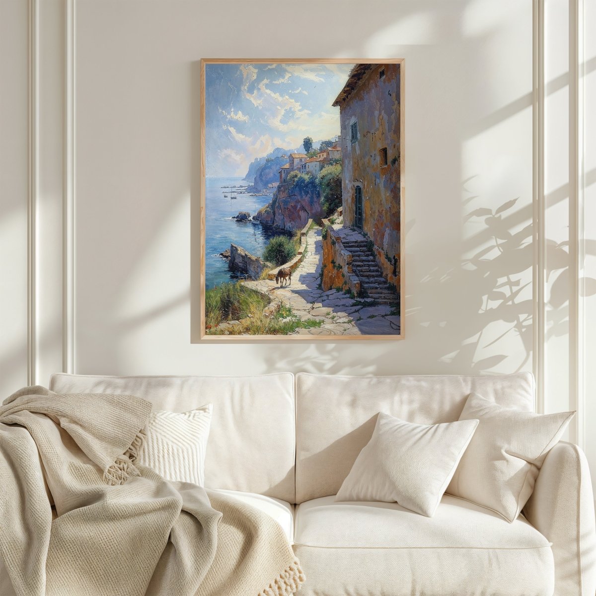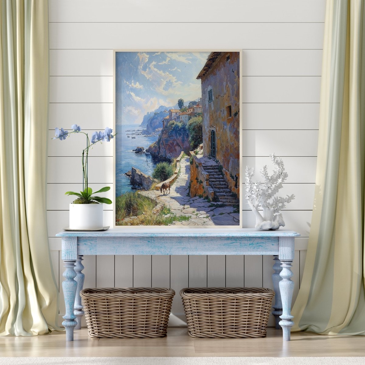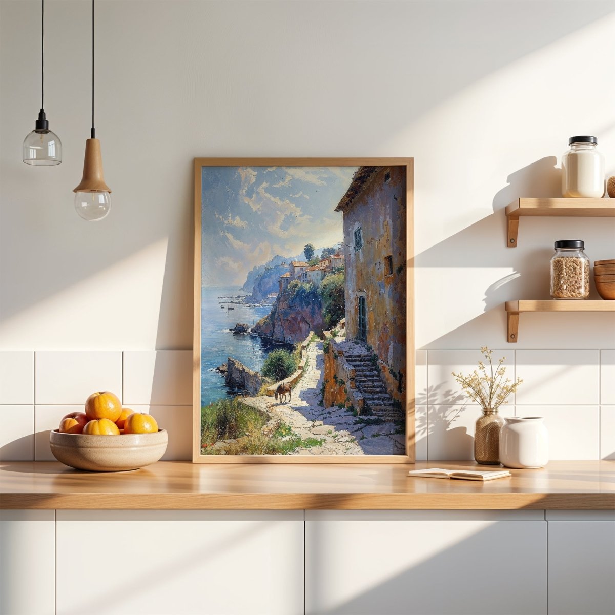 Suited for seaside villas, rustic kitchens, coastal retreats, or spaces that embrace timelessness, the artwork is more than scenery—it’s memory etched in light. A place where the sun doesn’t rush, and every shadow holds a story.