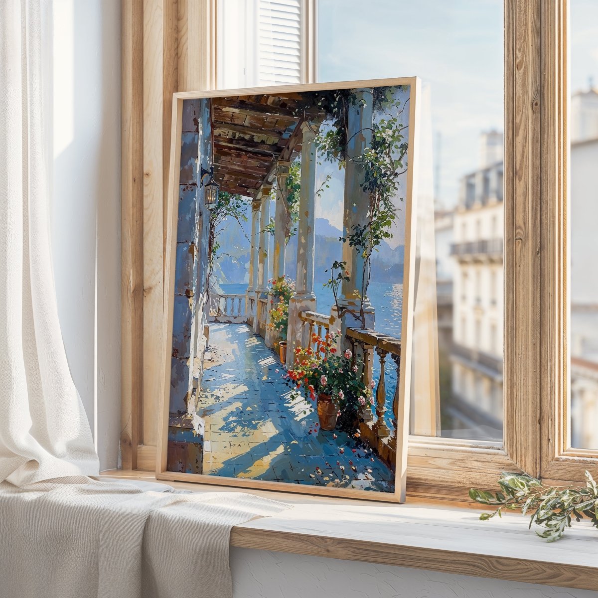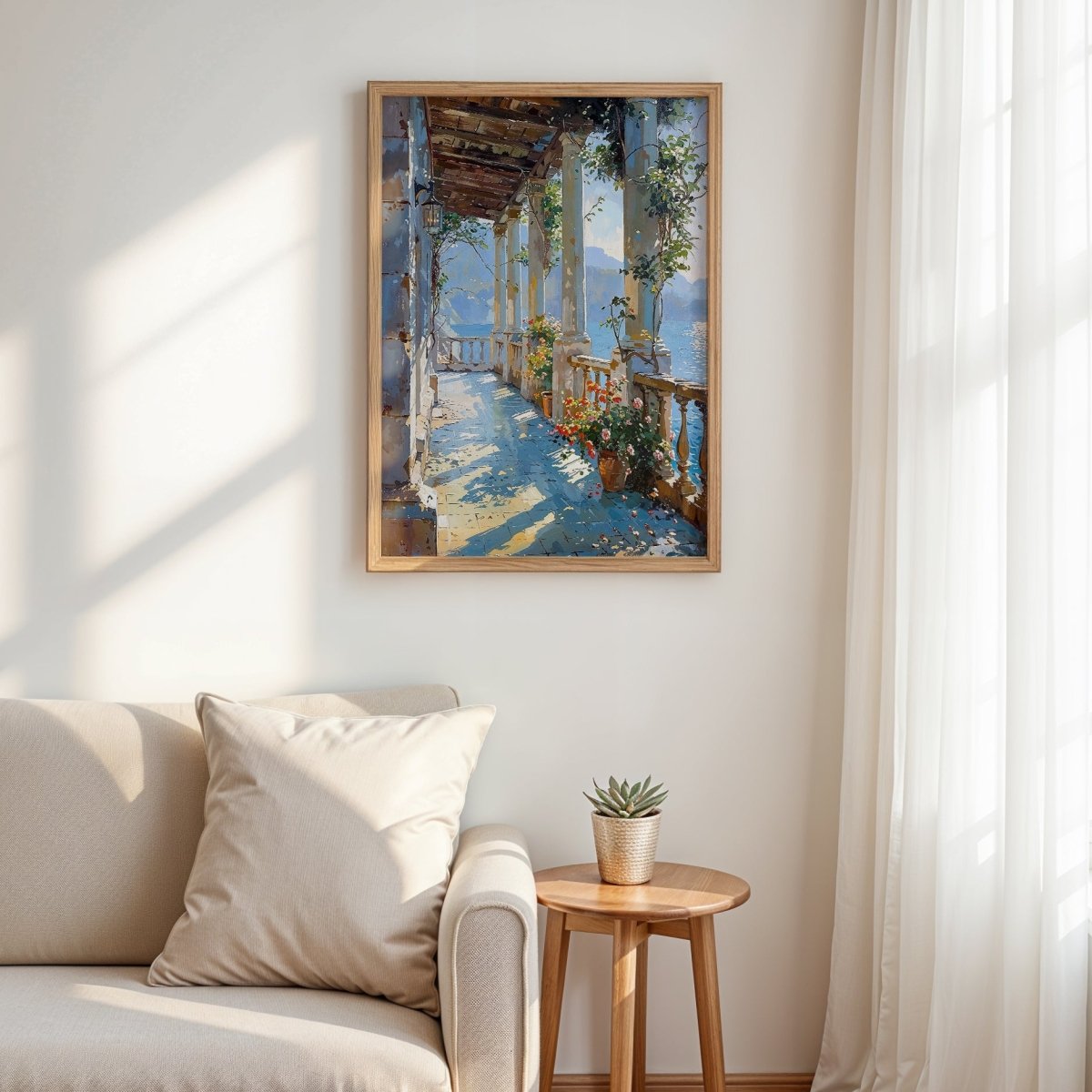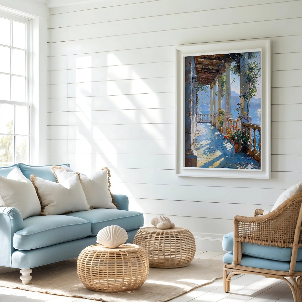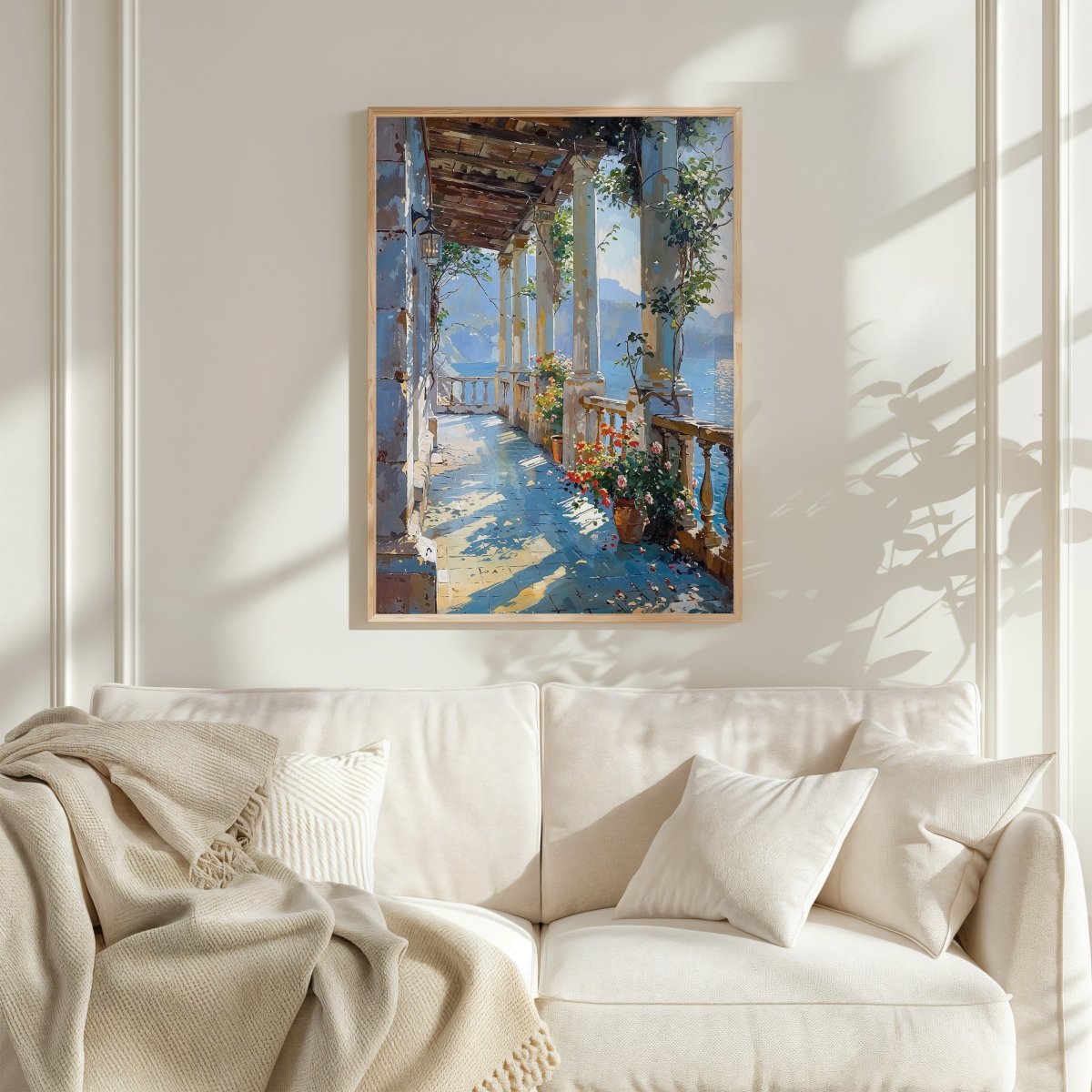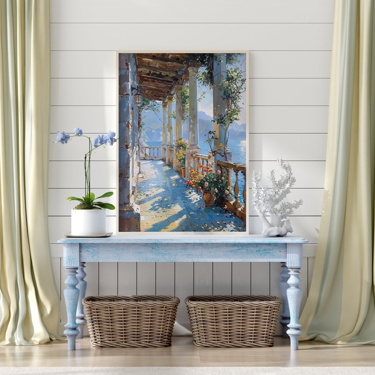 Perfect for interiors inspired by Tuscan villas, Mediterranean coastal décor, sunlit dining spaces, or serene retreats, the piece transports the viewer to a slower rhythm of living. It’s not just architecture or view—it’s light made quiet, and stone made radiant.