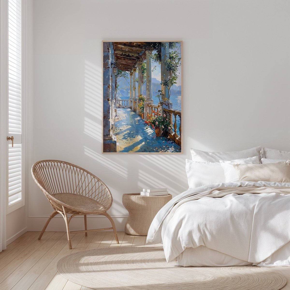 Veranda gathers warmth and stillness on a seaside veranda, where sunlight dances across patterned tile and terracotta pots bloom in riotous color. Climbing vines curl gently around whitewashed columns, framing the sea’s horizon like a moving fresco. The breeze is quiet, the moment suspended.