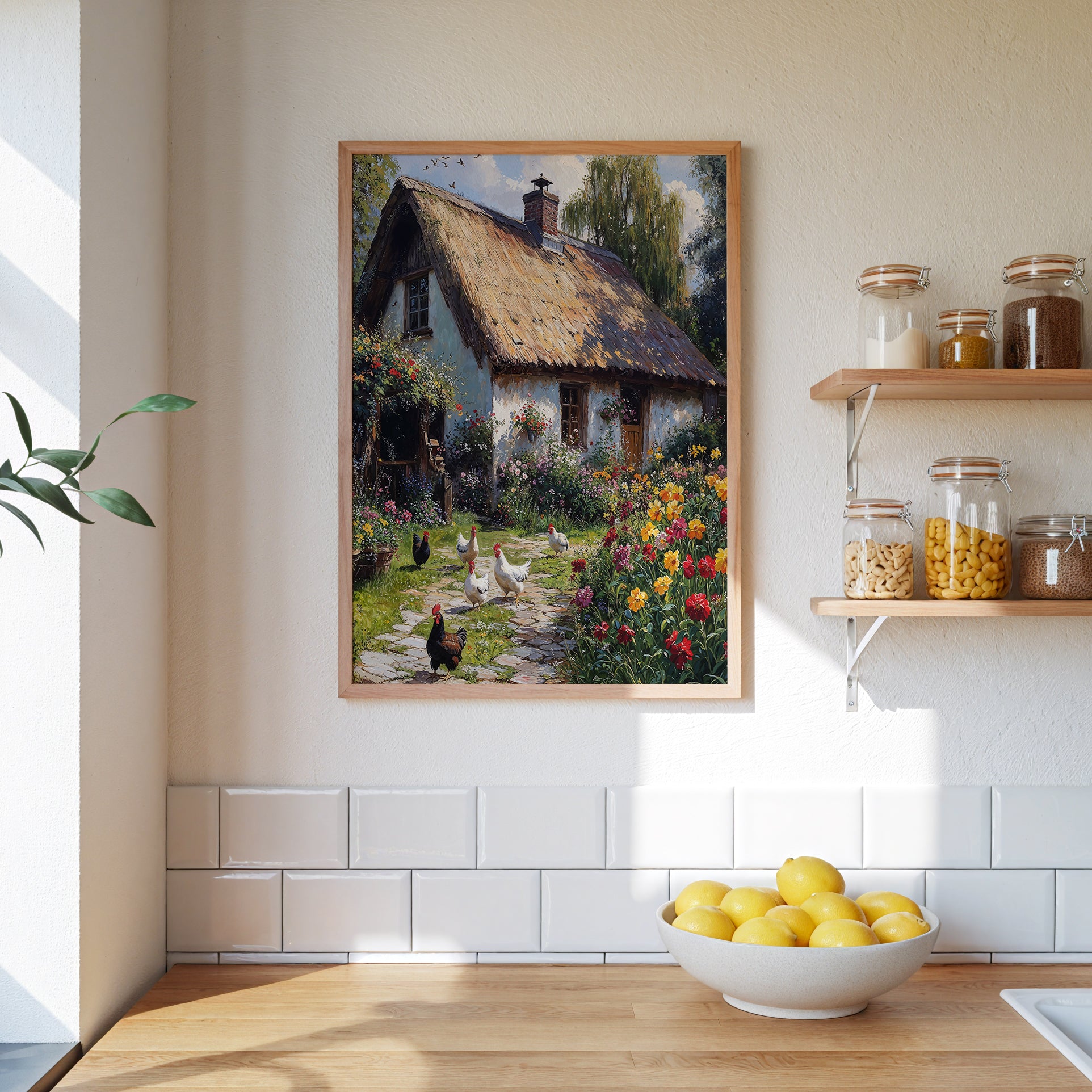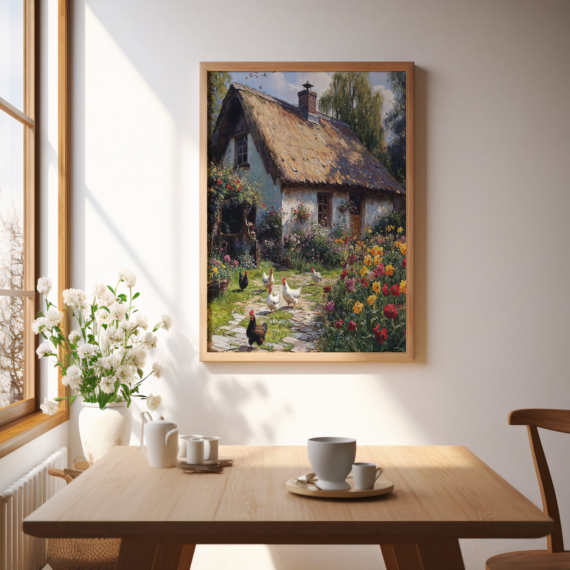Sunlight drapes across cobblestone and clover, guiding the gaze toward a thatched-roof farmhouse nestled in a floral burst of reds, yellows, and pinks. Chickens wander freely in the morning hush, their motion subtly captured with painterly immediacy. Around them, the garden blooms untamed—alive with warmth, shadow, and the softness of unhurried life.