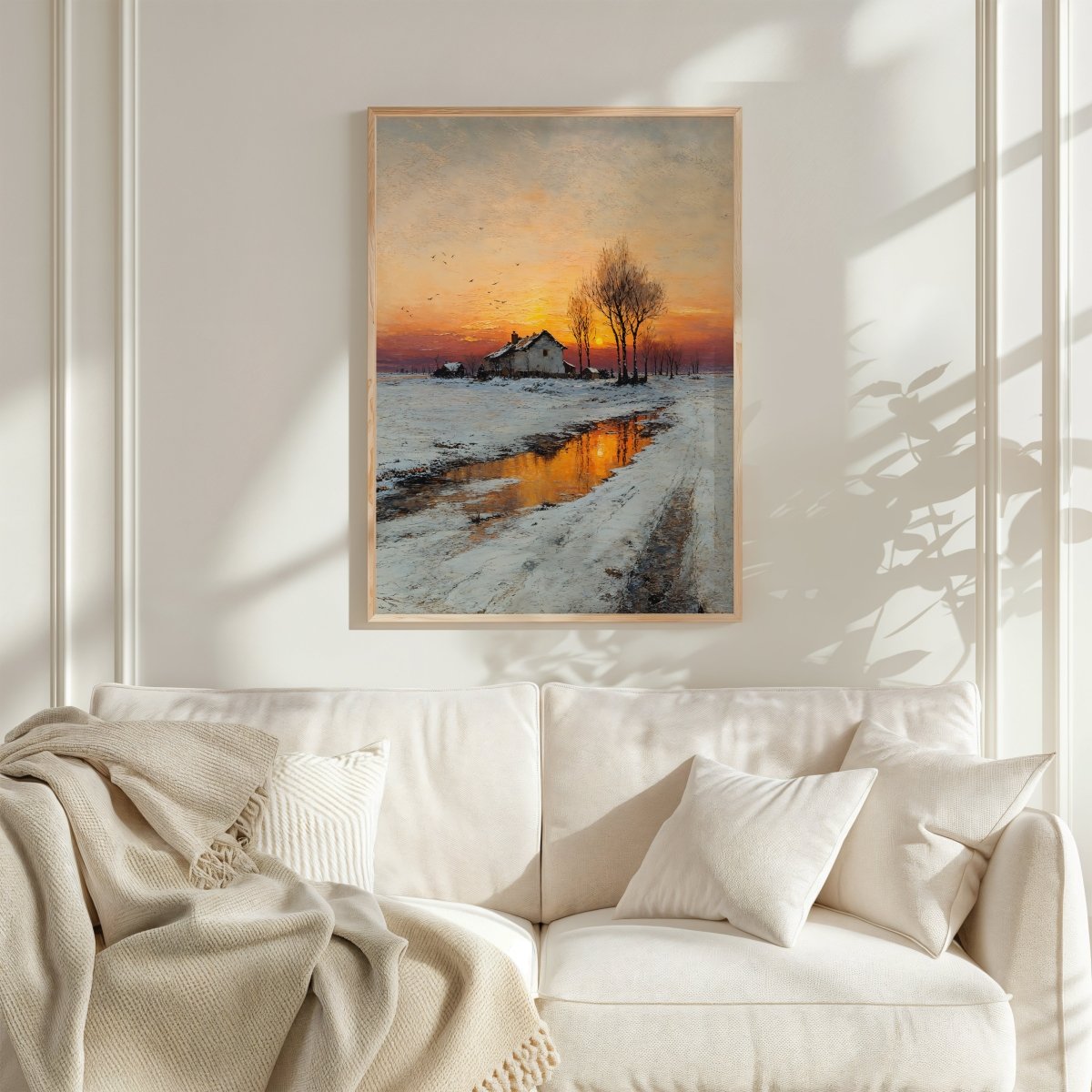 Memories of Cinnabar reveals the quiet drama of a winter dusk, where fiery hues of red and gold ignite the horizon above a solitary farmhouse. The textured snow mirrors this brilliance in a pool of molten light, creating a striking contrast between chill and flame.