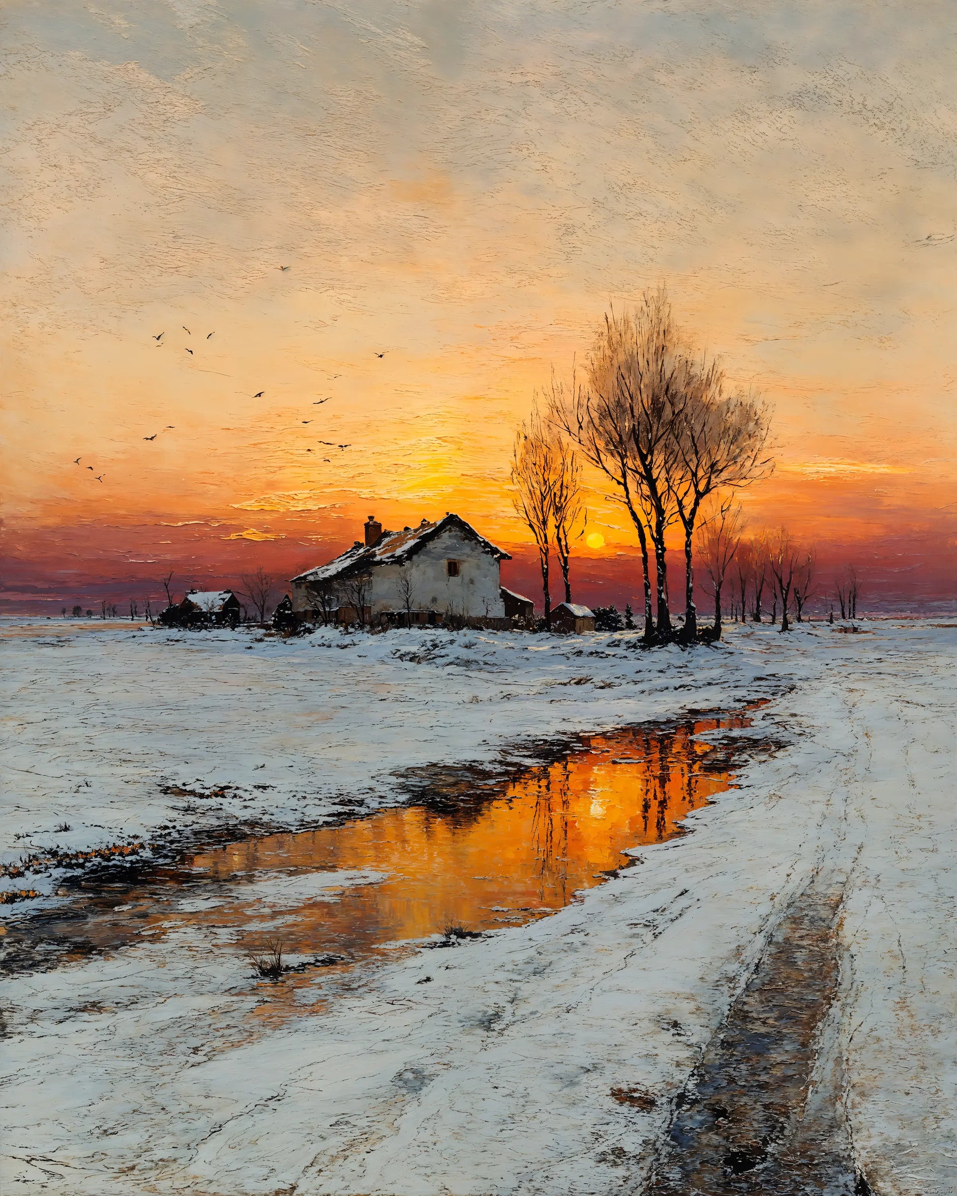 Memories of Cinnabar reveals the quiet drama of a winter dusk, where fiery hues of red and gold ignite the horizon above a solitary farmhouse. The textured snow mirrors this brilliance in a pool of molten light, creating a striking contrast between chill and flame.